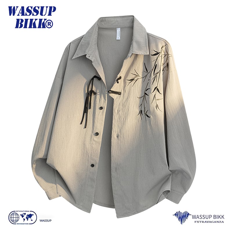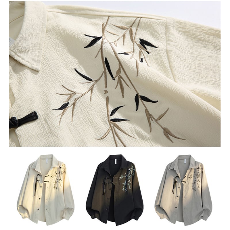 ♥チャイナボタン付き竹柄シャツ!【WSリーズ】★チャイナ風トップス★ 3color 竹柄 シャツ 長袖 チャイナボタン 男女兼用 メンズ アプリコット グレー ブラック