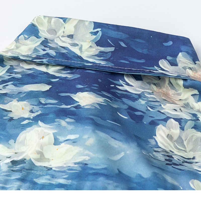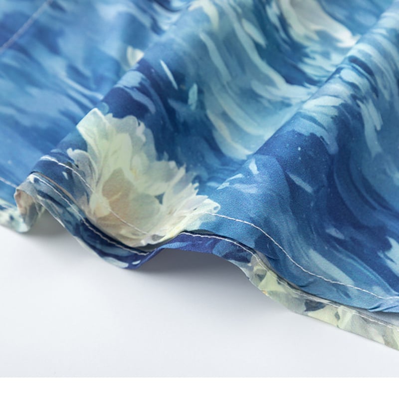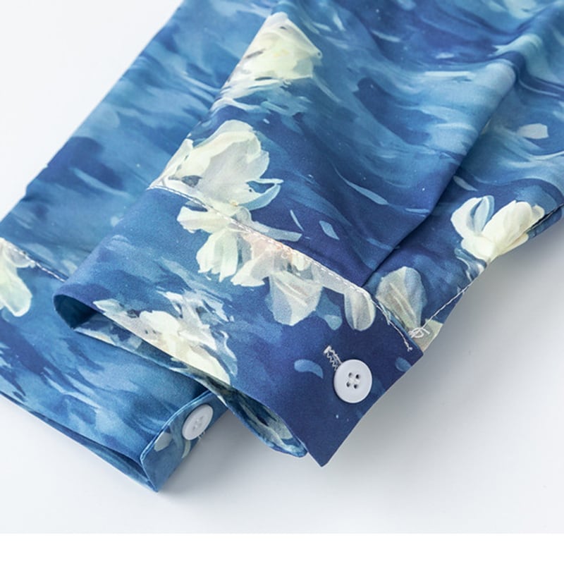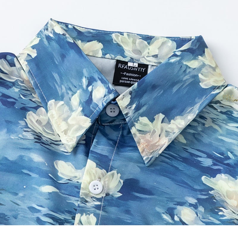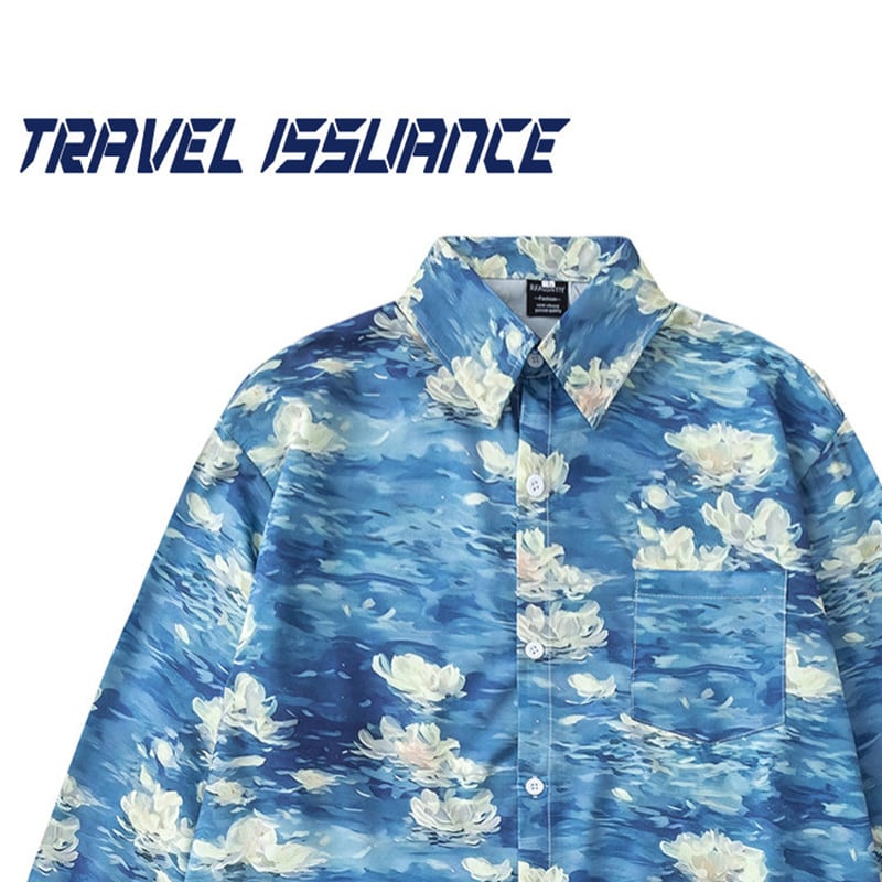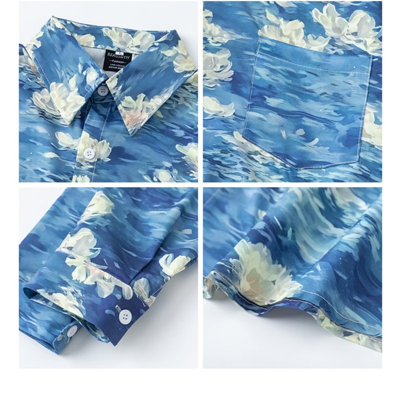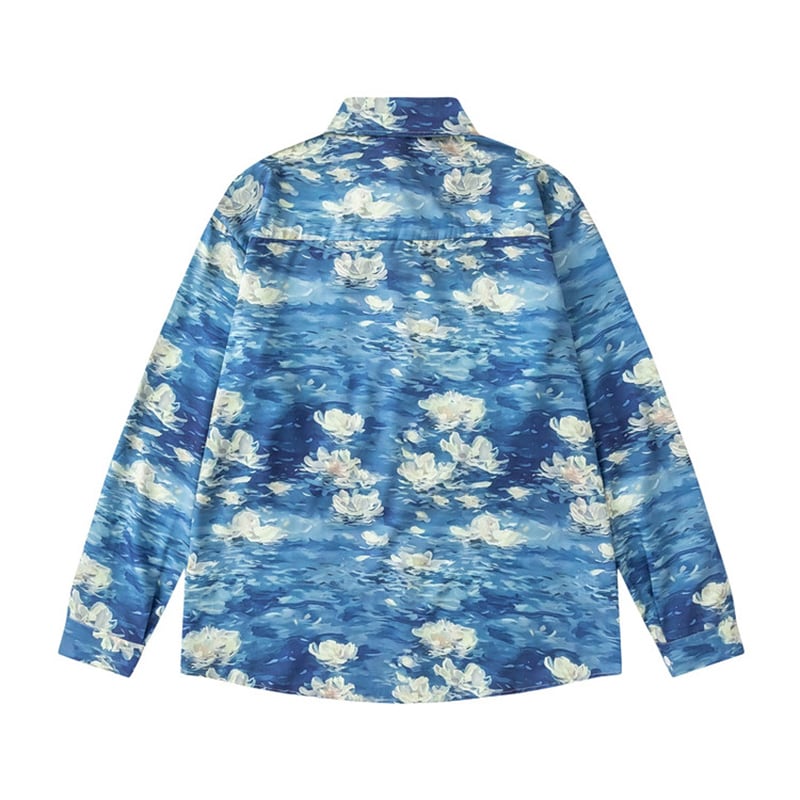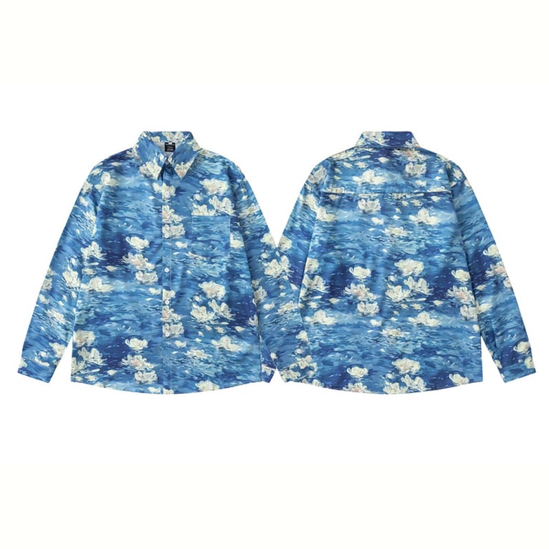 ♥油絵の中の波、身に纏う!【MOISHE TIDEシリーズ】★シャツ★ ユニセックス トップス 長袖シャツ メンズ プリント 花柄 ブルー 青い