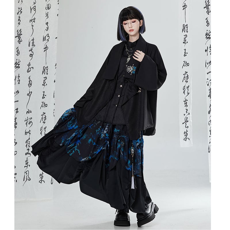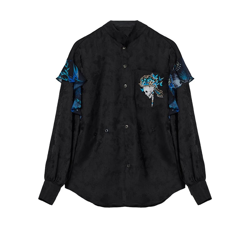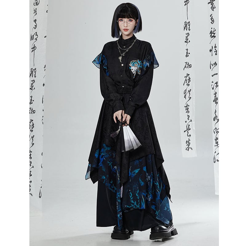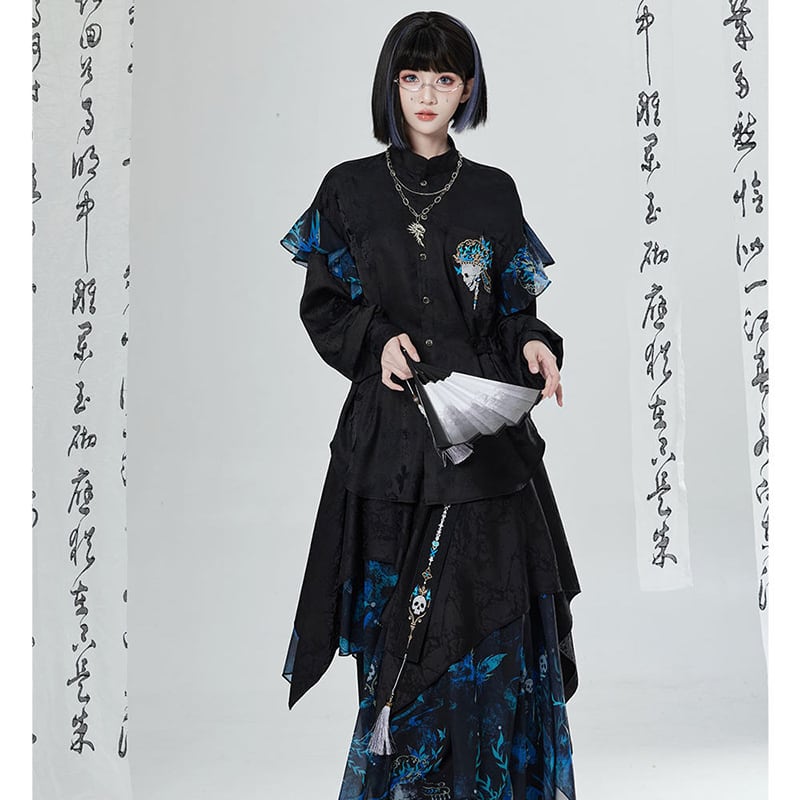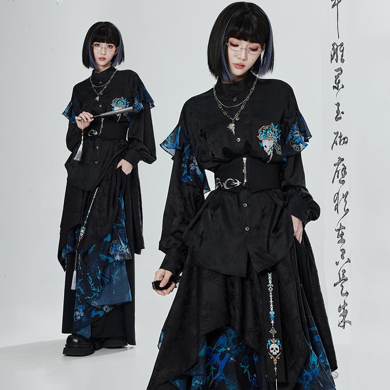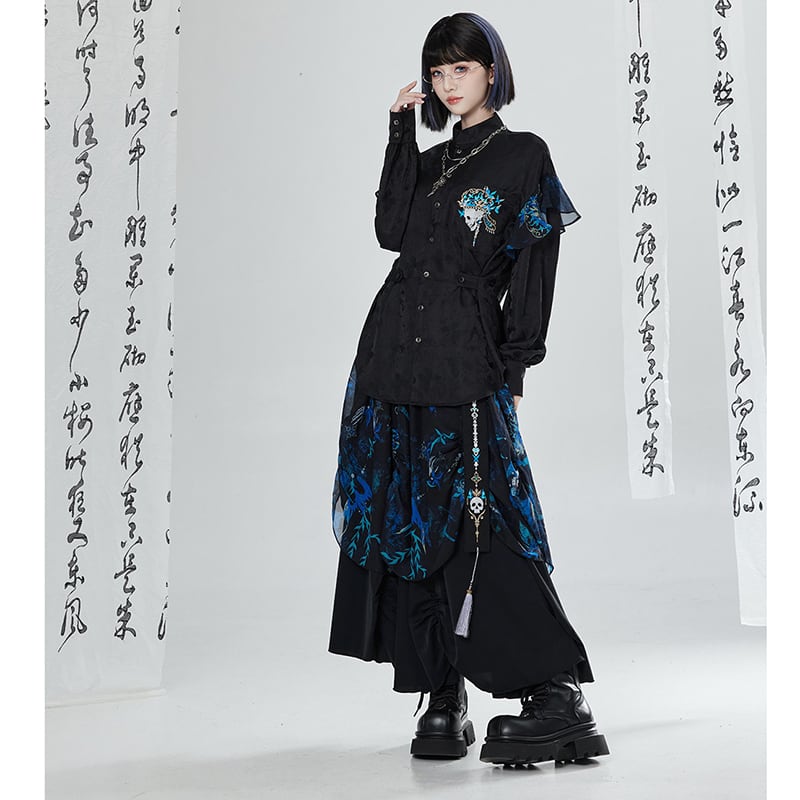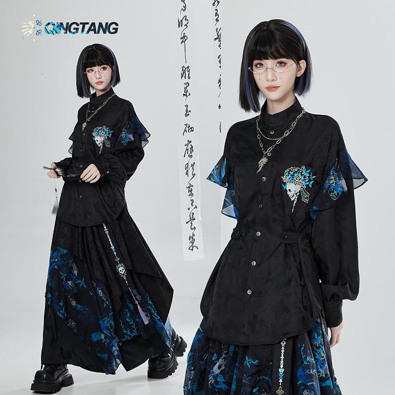 【卿棠---冠骨浮生】★チャイナ風トップス★ 刺繍 シャツ 長袖シャツ ユニセックス ブラック 黒い 個性的