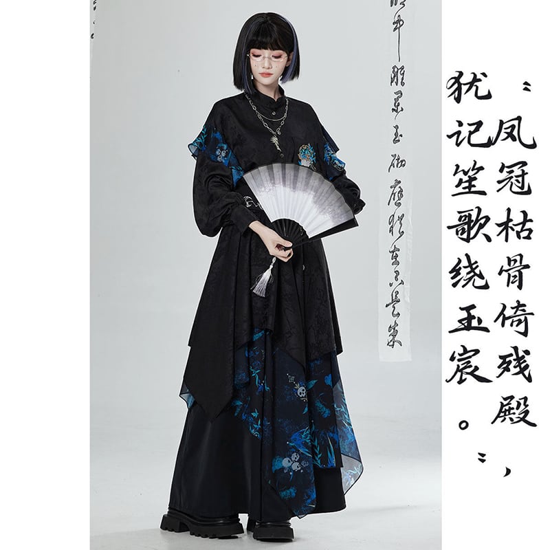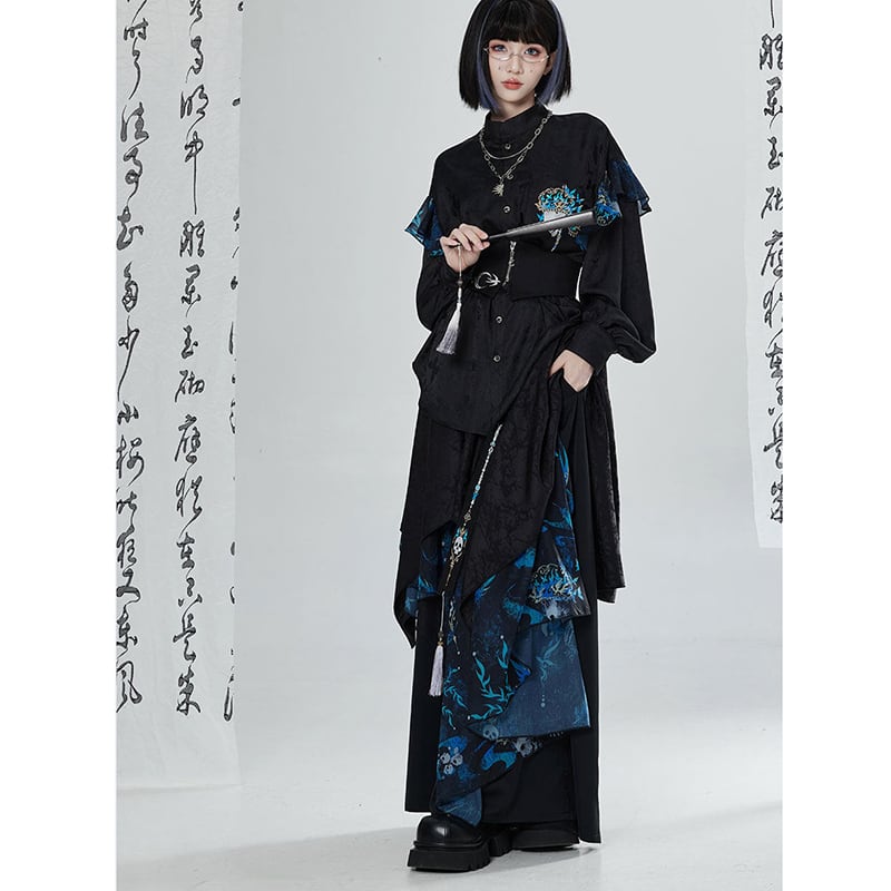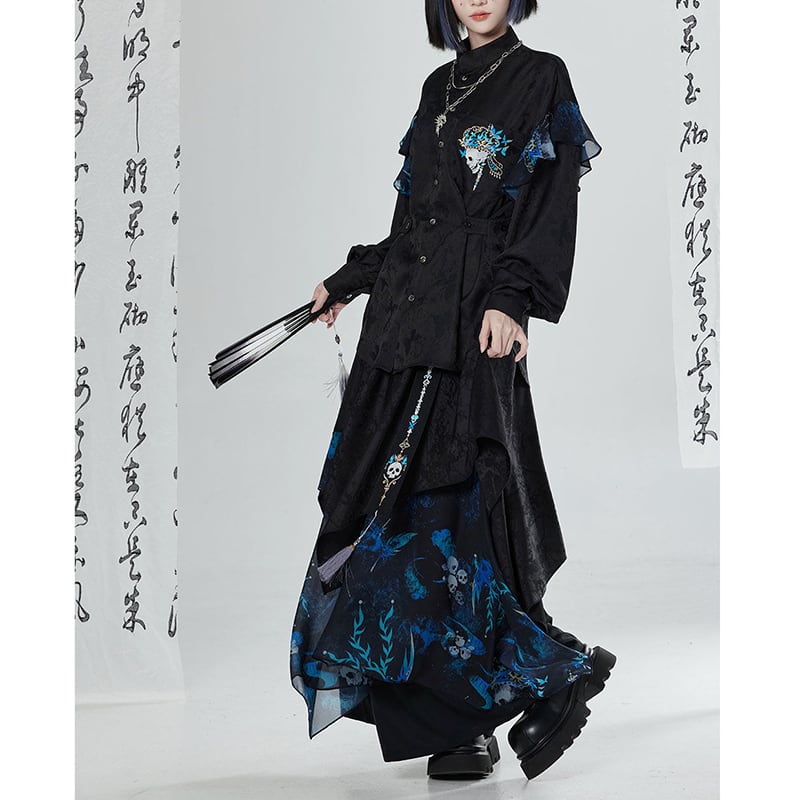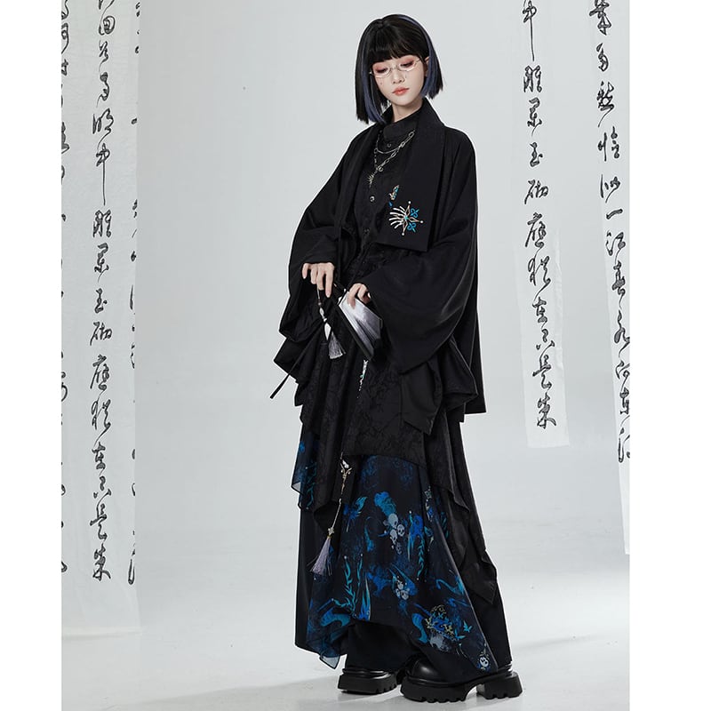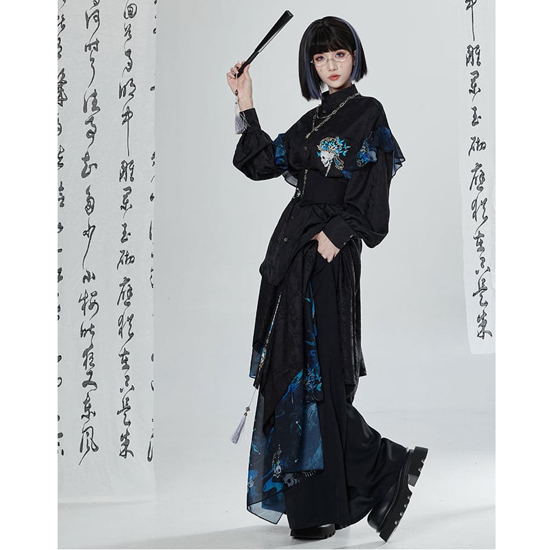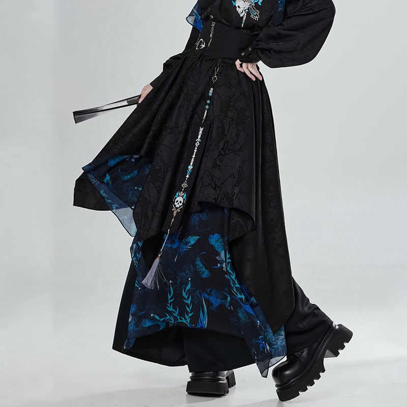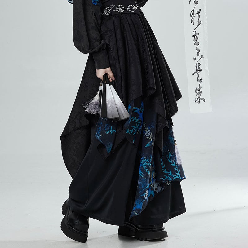 【卿棠---冠骨浮生シリーズ】★チャイナ風ズボン★ ガウチョパンツ ボトムス ユニセックス メンズ 黒 青 切り替え