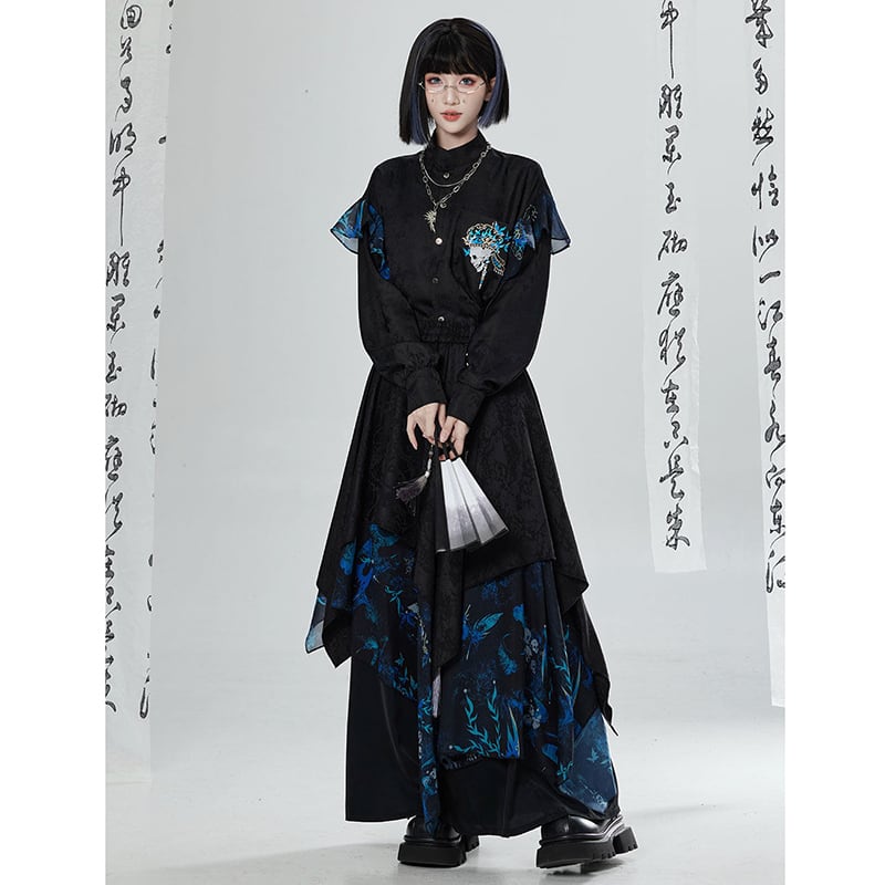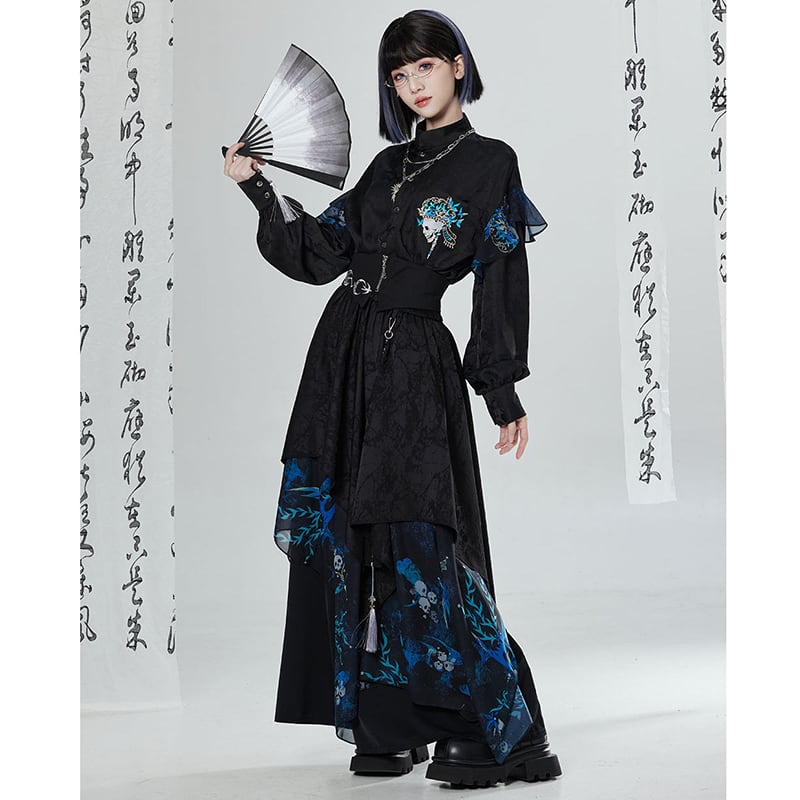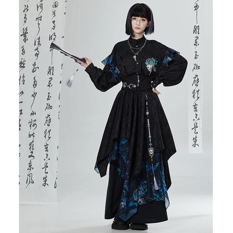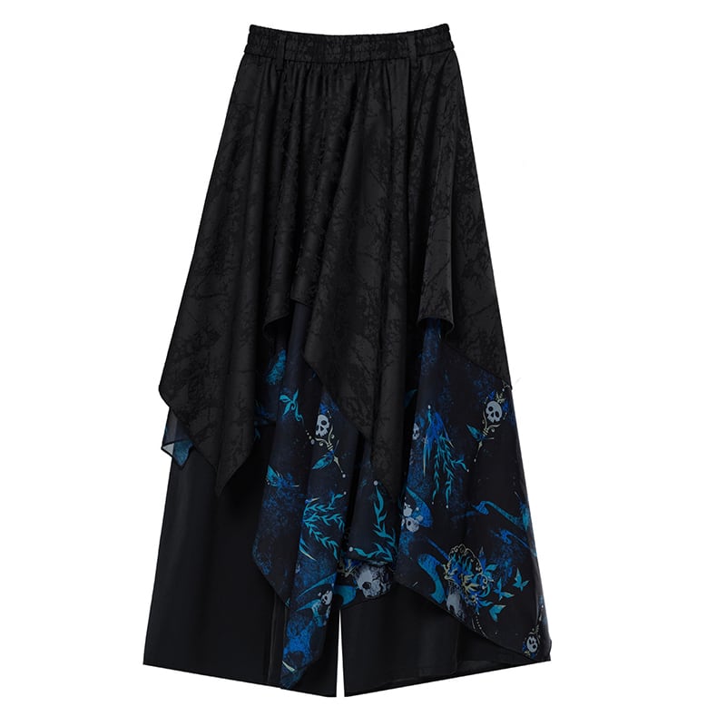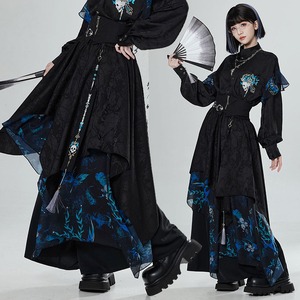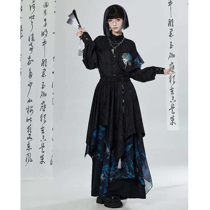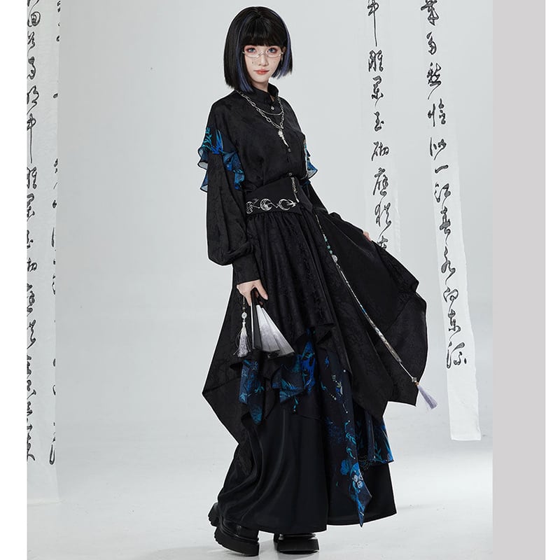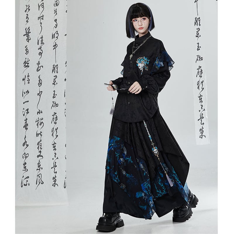 【卿棠---冠骨浮生シリーズ】★チャイナ風ズボン★ ガウチョパンツ ボトムス ユニセックス メンズ 黒 青 切り替え