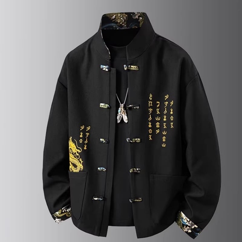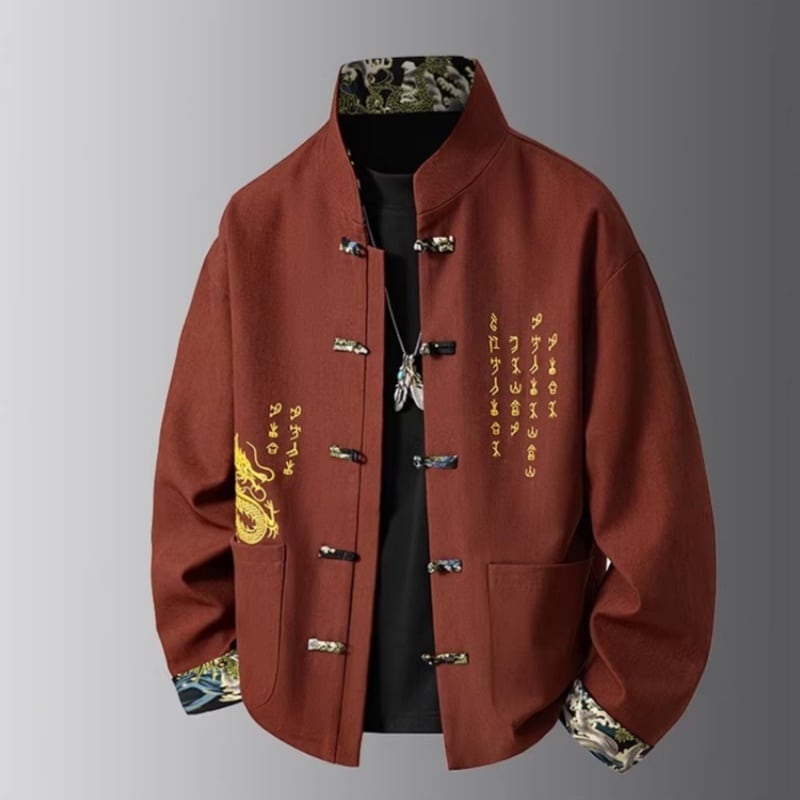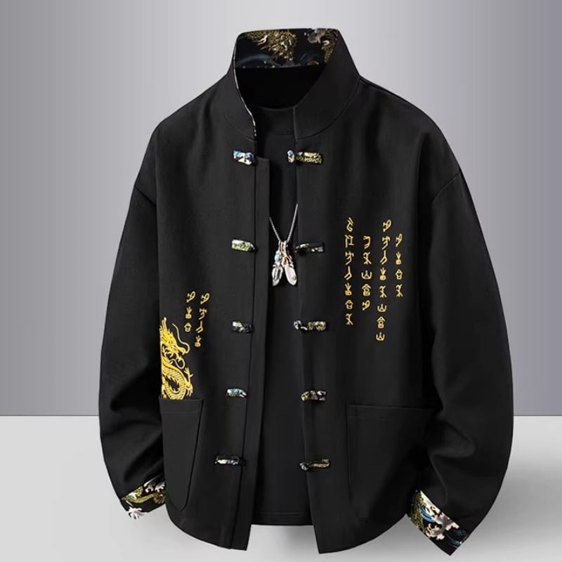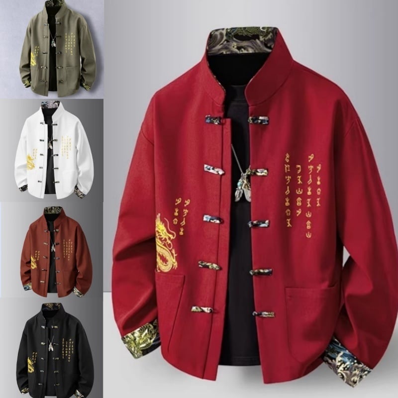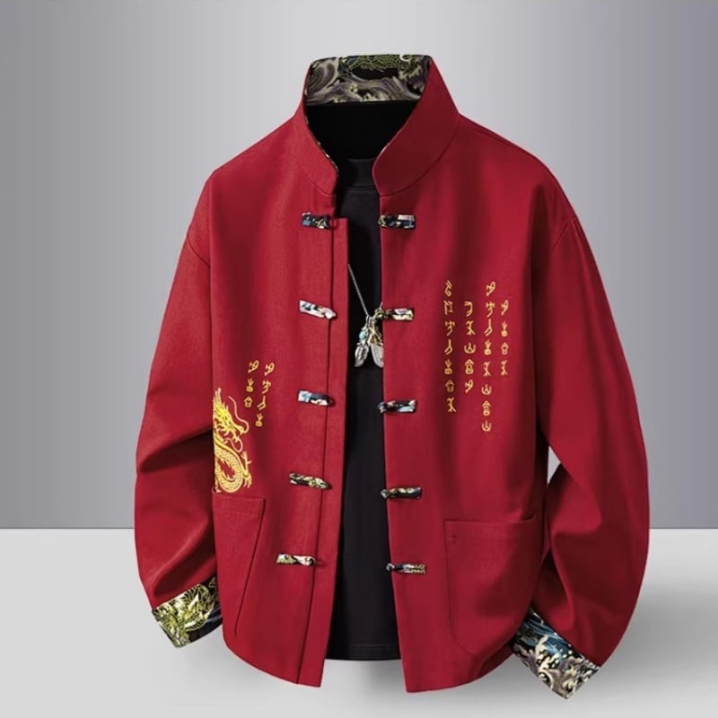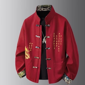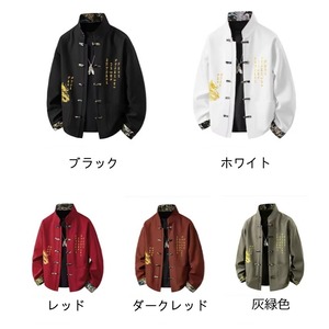 ❤中国風 レトロ 国潮モダン 龍刺繍アウター!【JHUNシリーズ】✿チャイナ風トップス✿ アウター シャツ チャイナ風服 龍 改良唐装 龍柄 中華服 スタンドネック 長袖 ブラック 黒い レッド 赤い