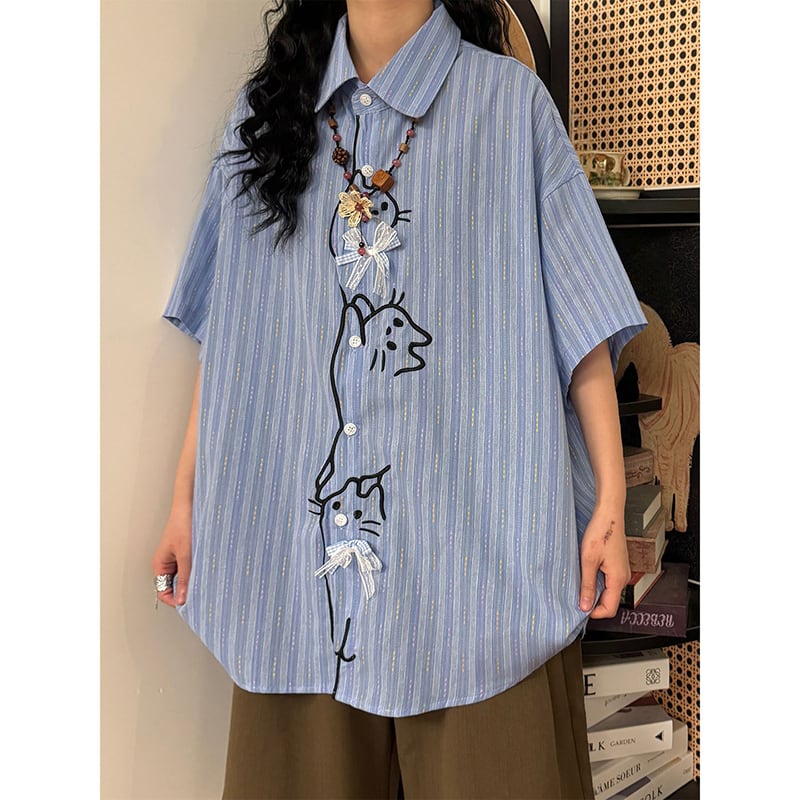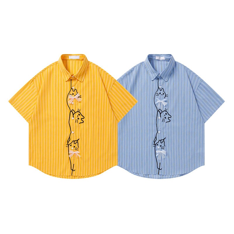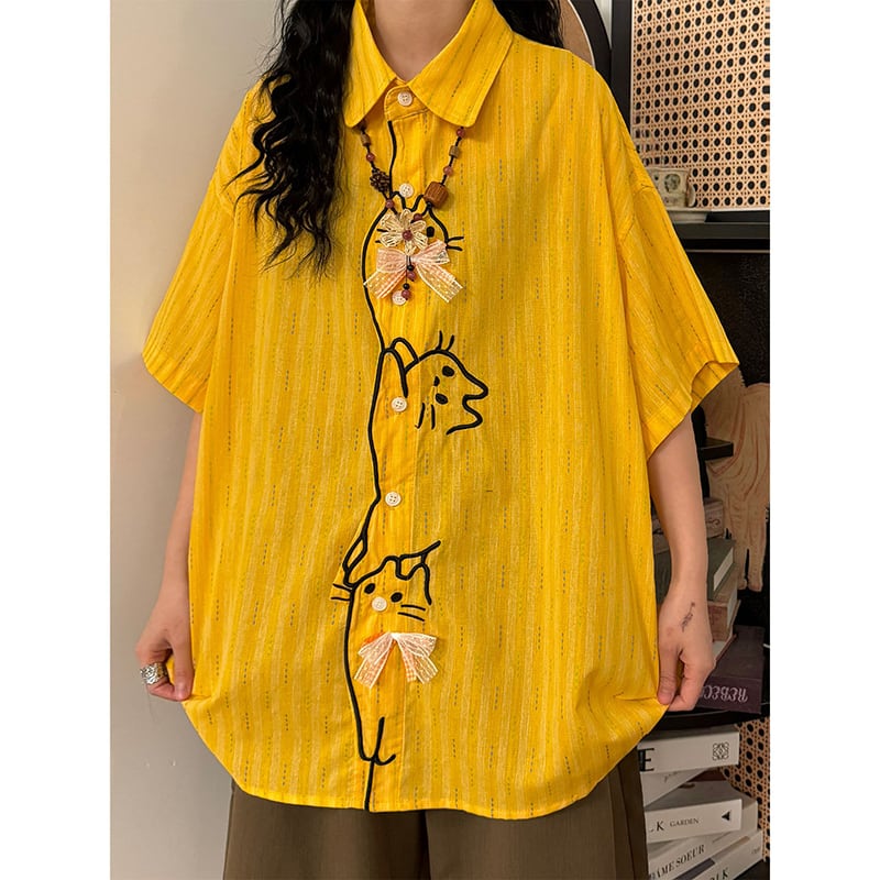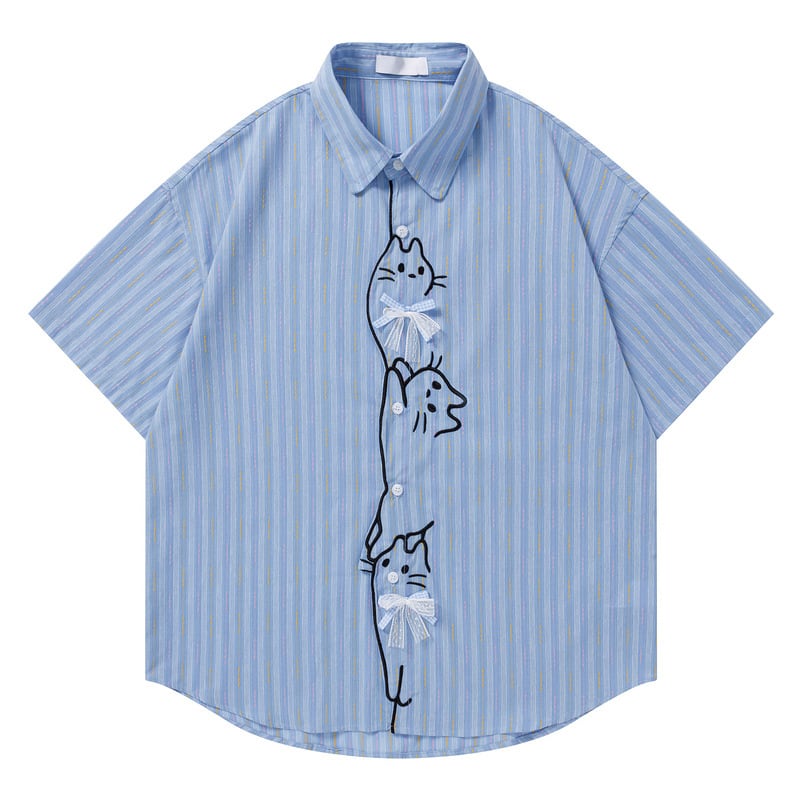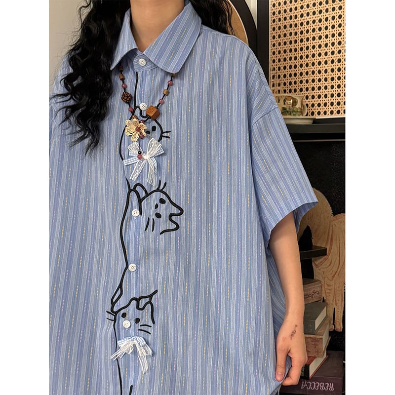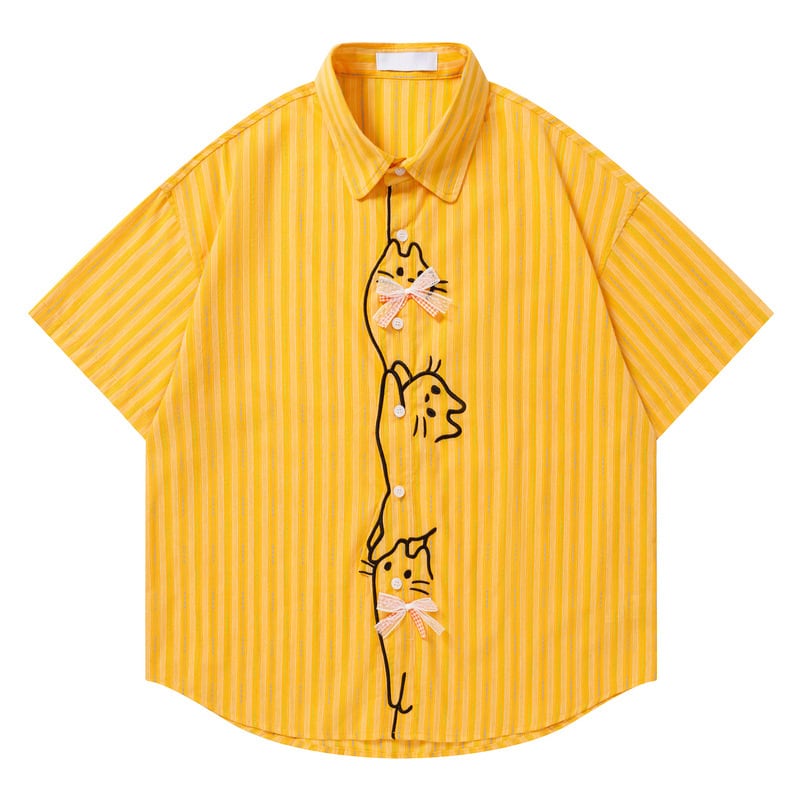 ♥リボン猫が映える、夏のデイリーシャツ!【UATONLINEシリーズ】★シャツ★ 2color トップス 半袖シャツ ユニセックス 猫 猫柄 縦縞 縞模様