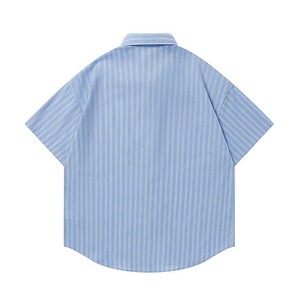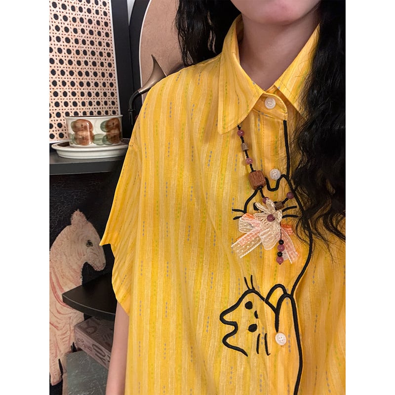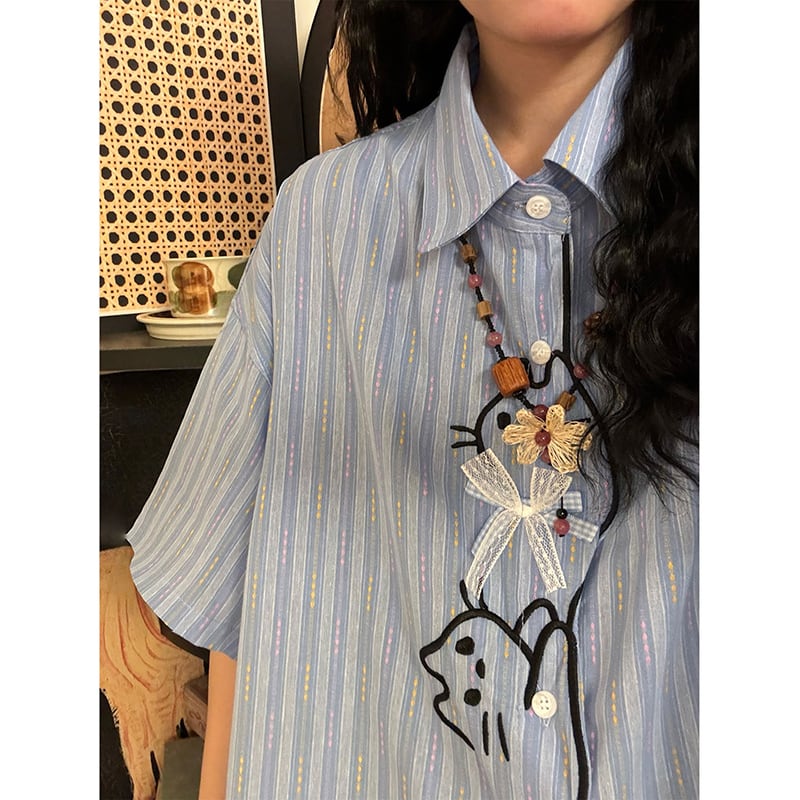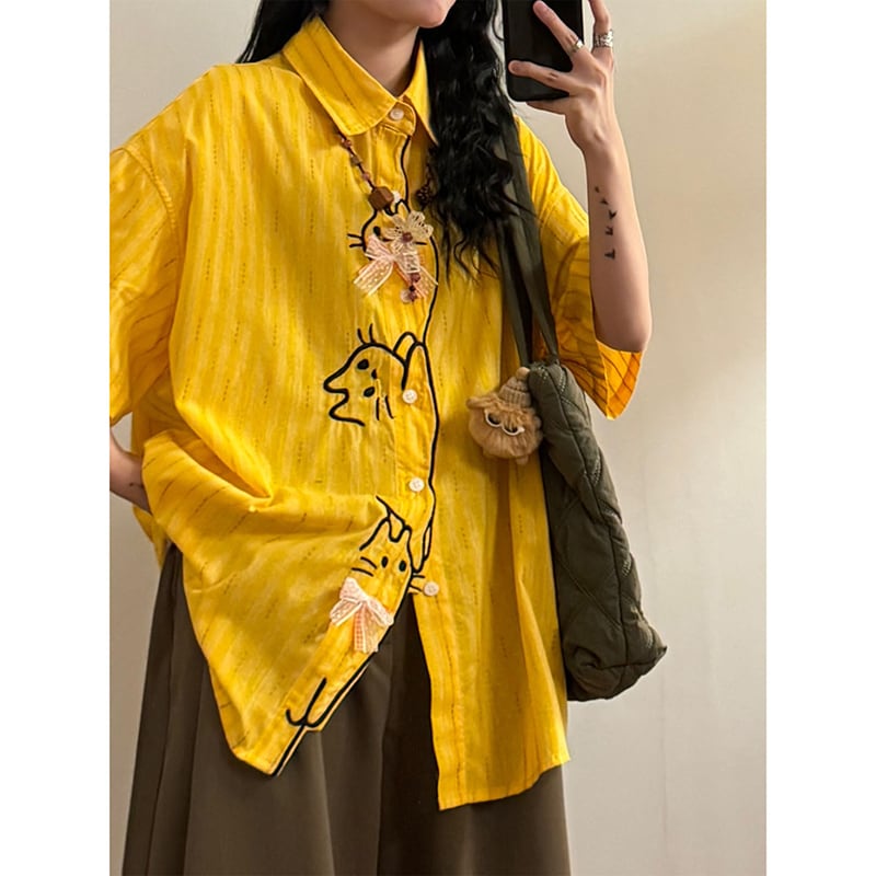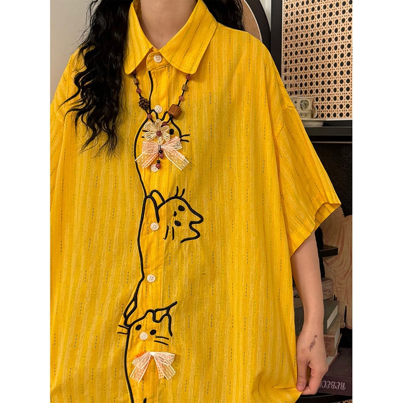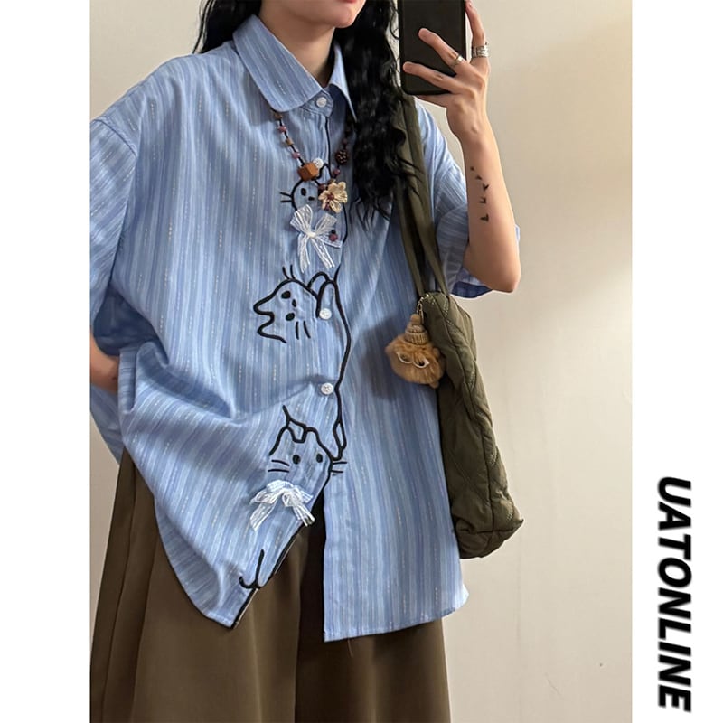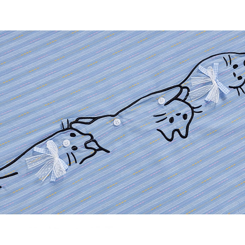 ♥リボン猫が映える、夏のデイリーシャツ!【UATONLINEシリーズ】★シャツ★ 2color トップス 半袖シャツ ユニセックス 猫 猫柄 縦縞 縞模様