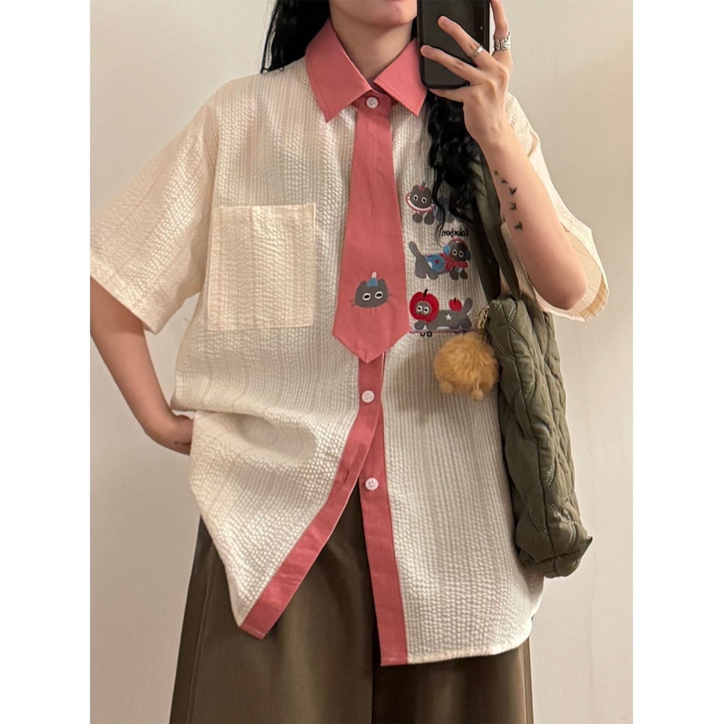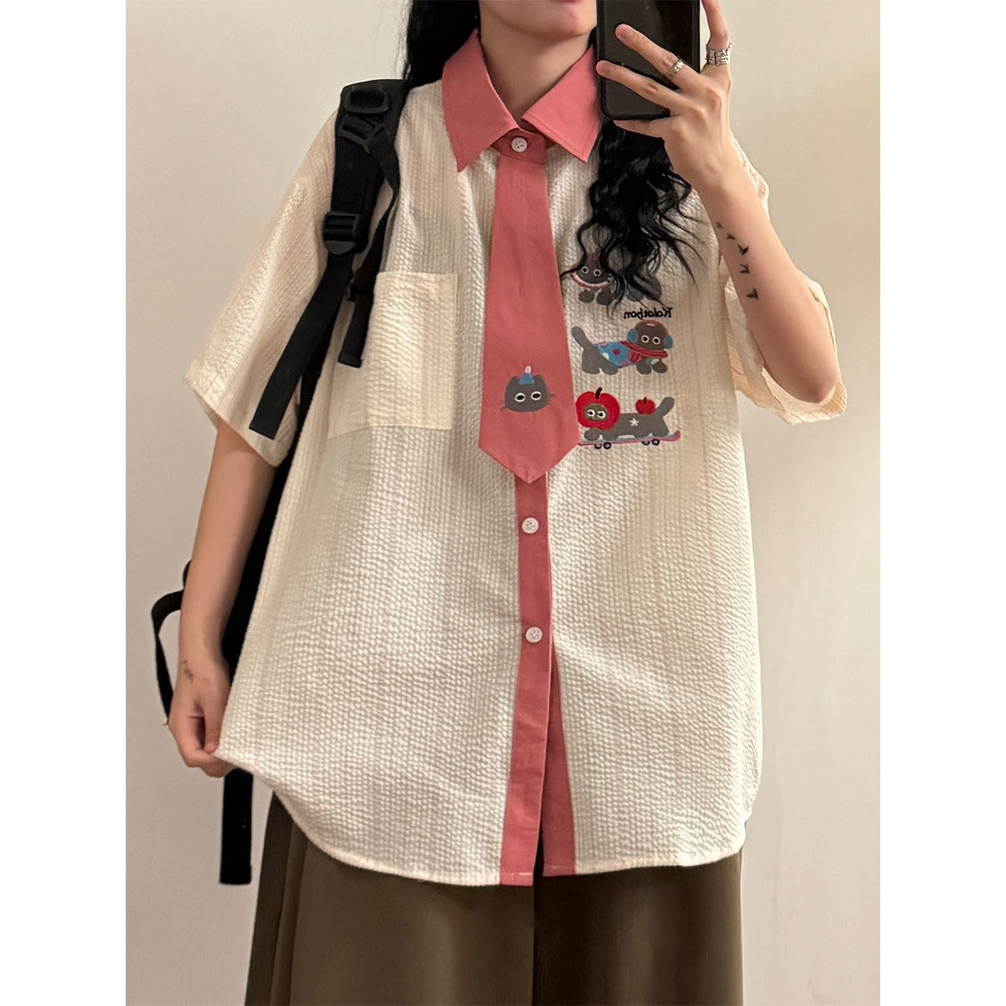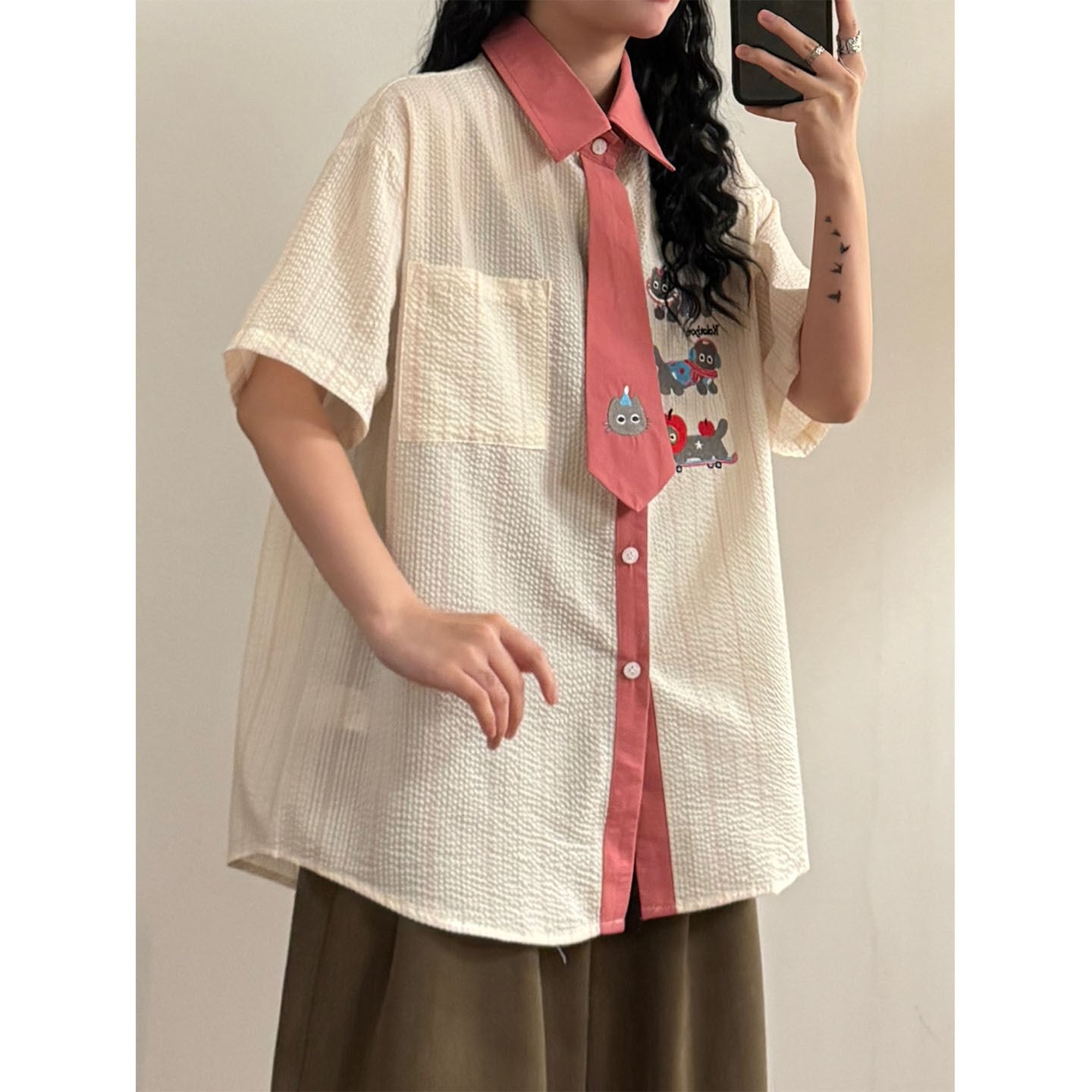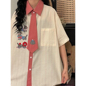 ♥猫とネクタイが、新しい!【UATONLINEシリーズ】★シャツ★ ネクタイデザイン トップス 半袖シャツ ユニセックス 猫 猫柄 配色