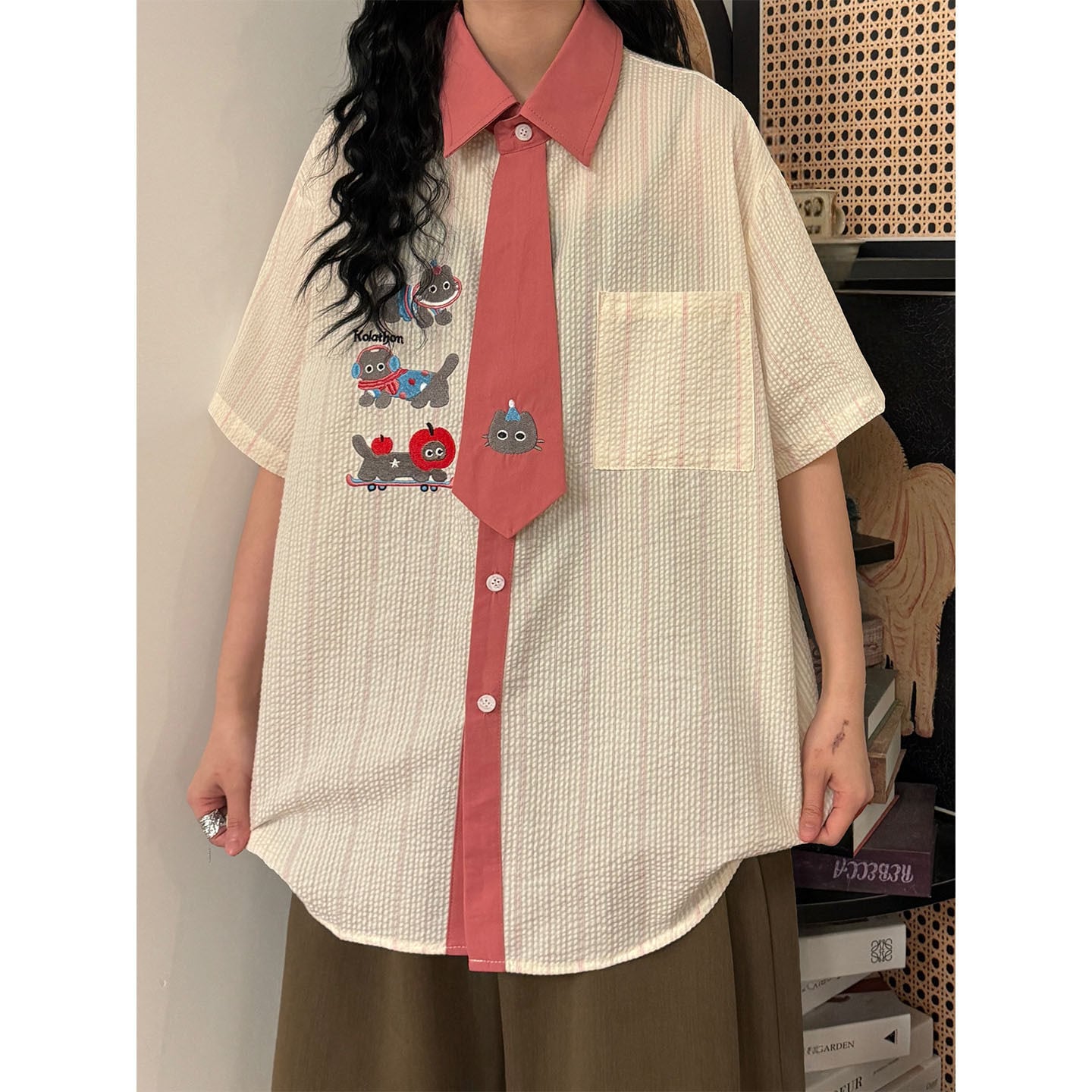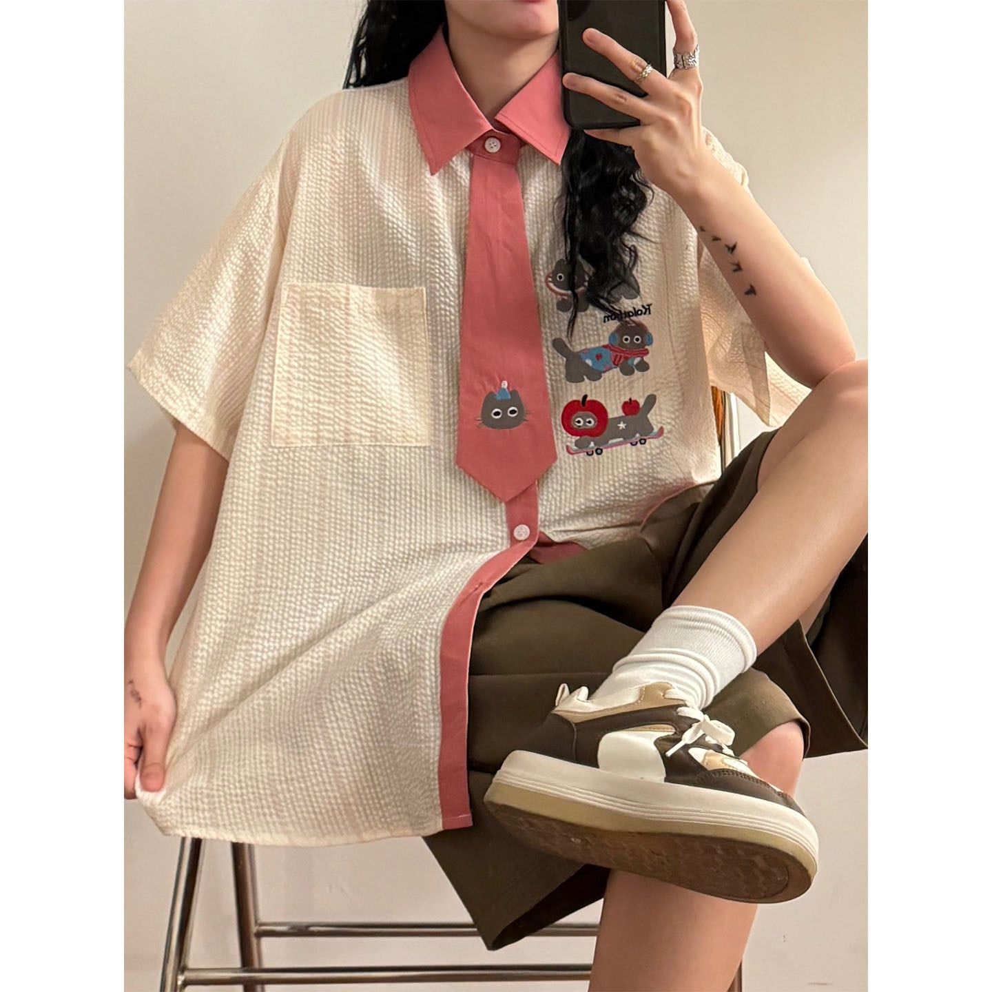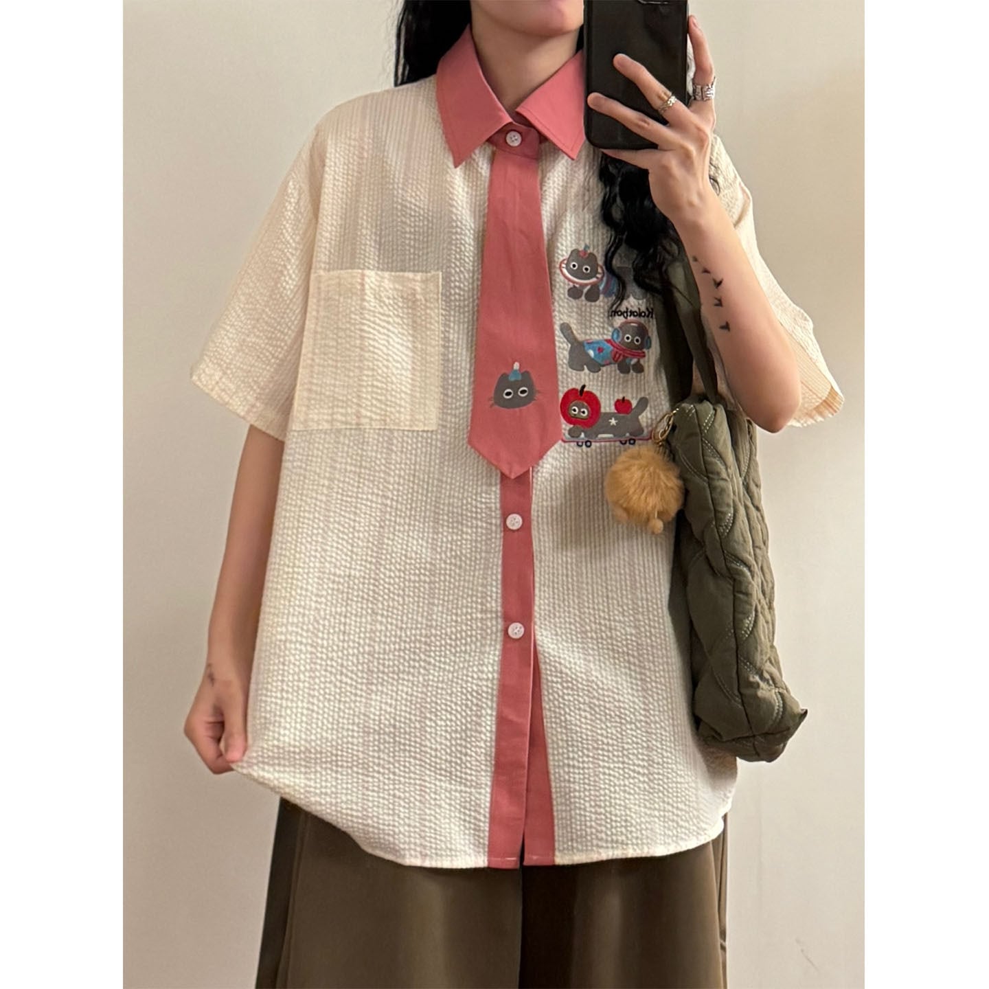 ♥猫とネクタイが、新しい!【UATONLINEシリーズ】★シャツ★ ネクタイデザイン トップス 半袖シャツ ユニセックス 猫 猫柄 配色