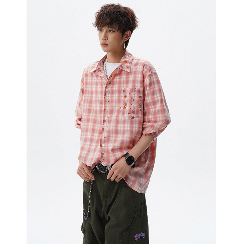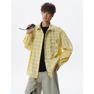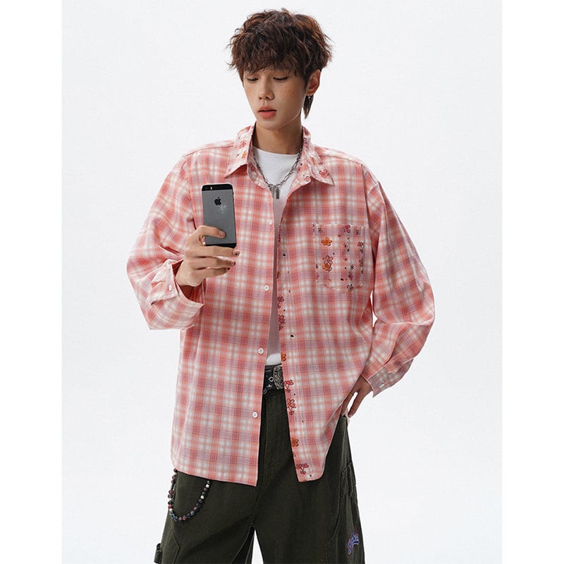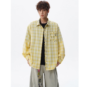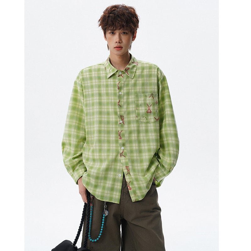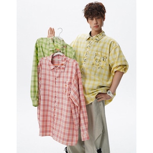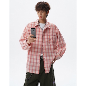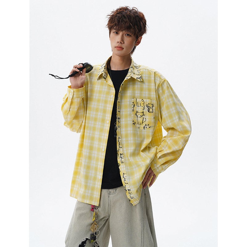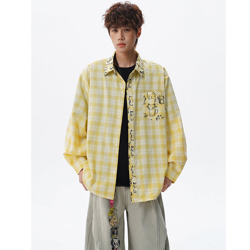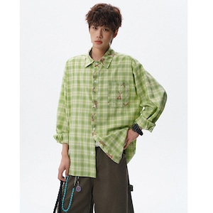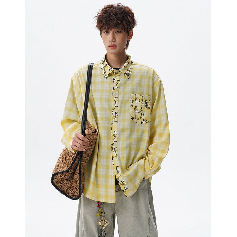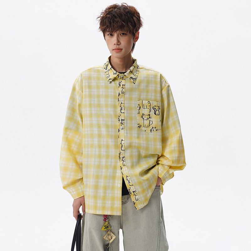 ♥チェック柄猫柄シャツ!【V37シリーズ】★シャツ★ 3color トップス ユニセックス 大きいサイズ 長袖 チェック柄