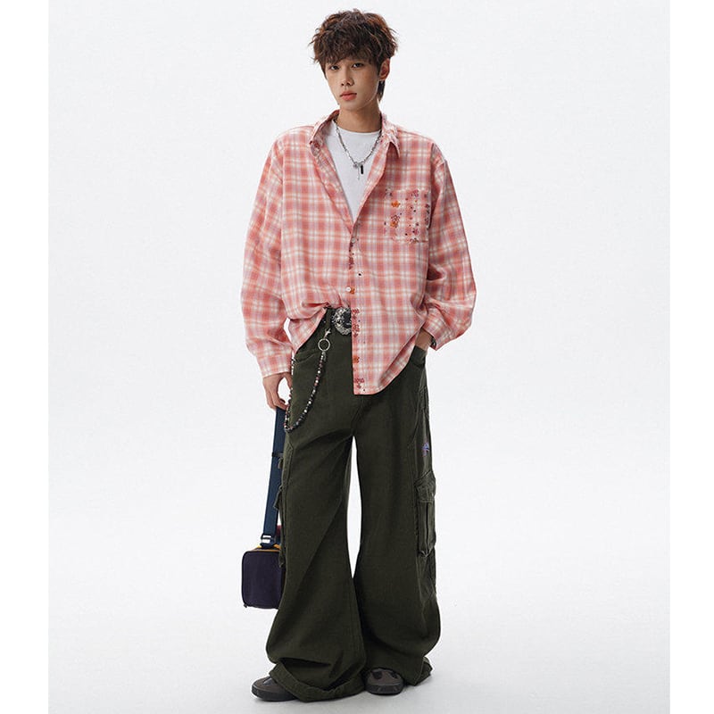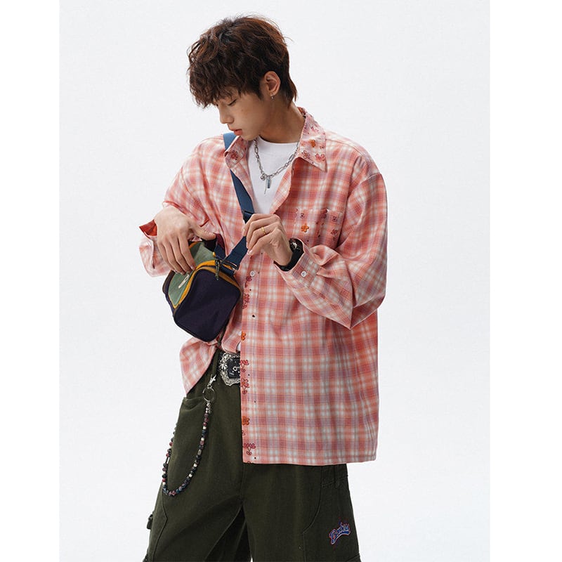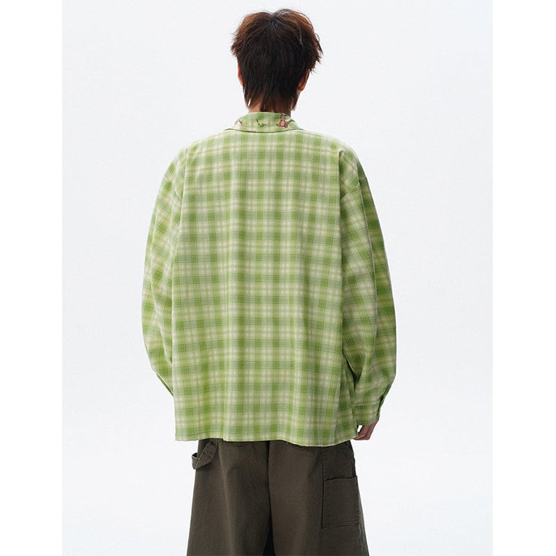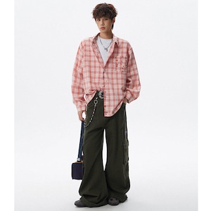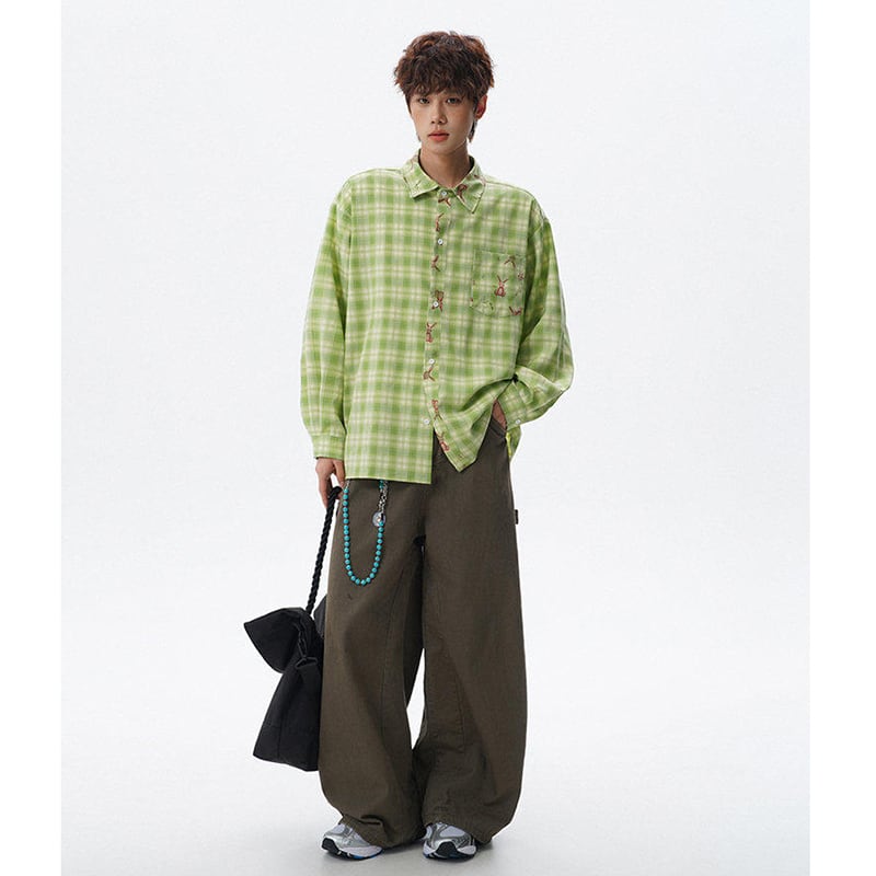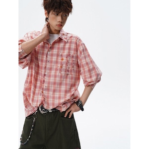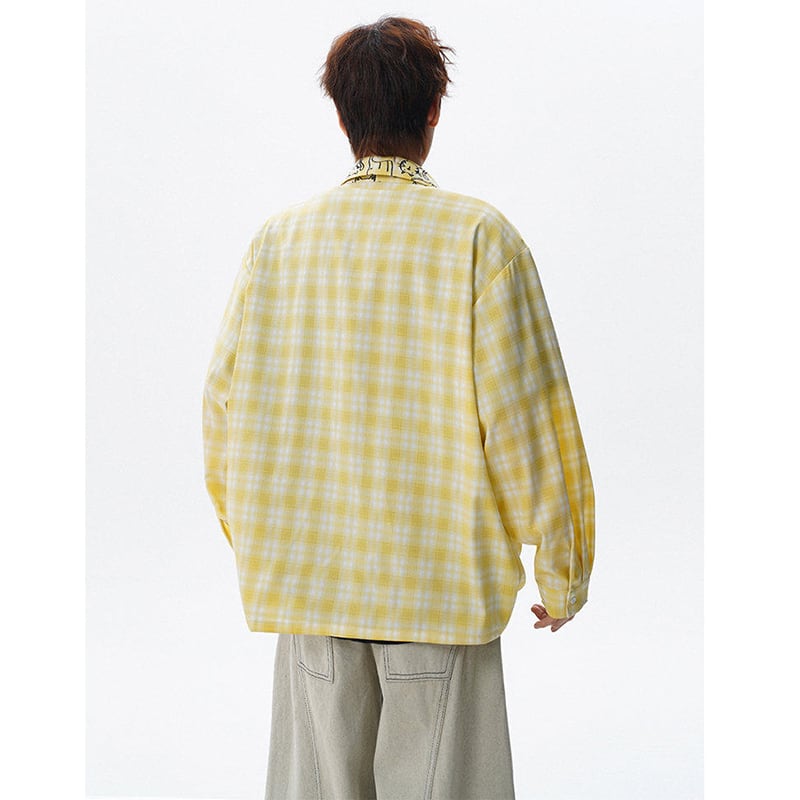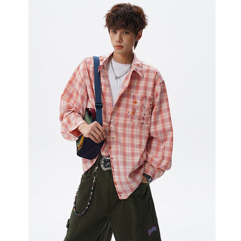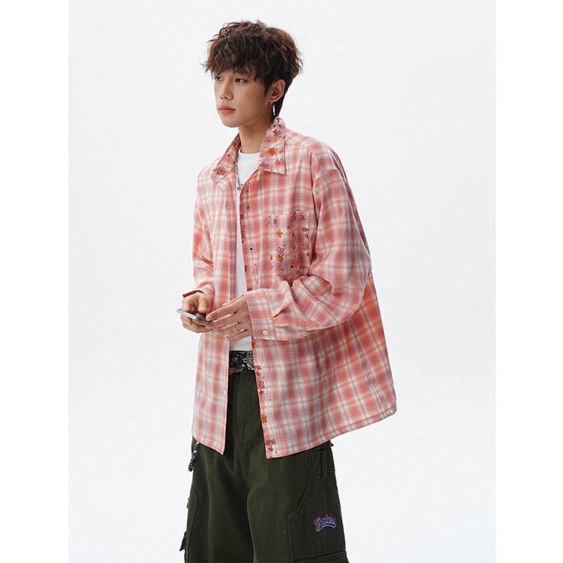 ♥チェック柄猫柄シャツ!【V37シリーズ】★シャツ★ 3color トップス ユニセックス 大きいサイズ 長袖 チェック柄
