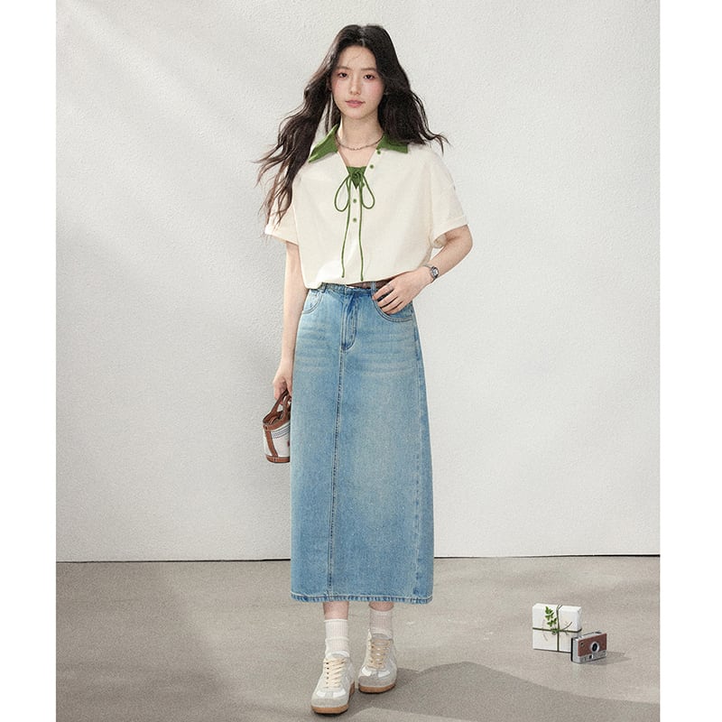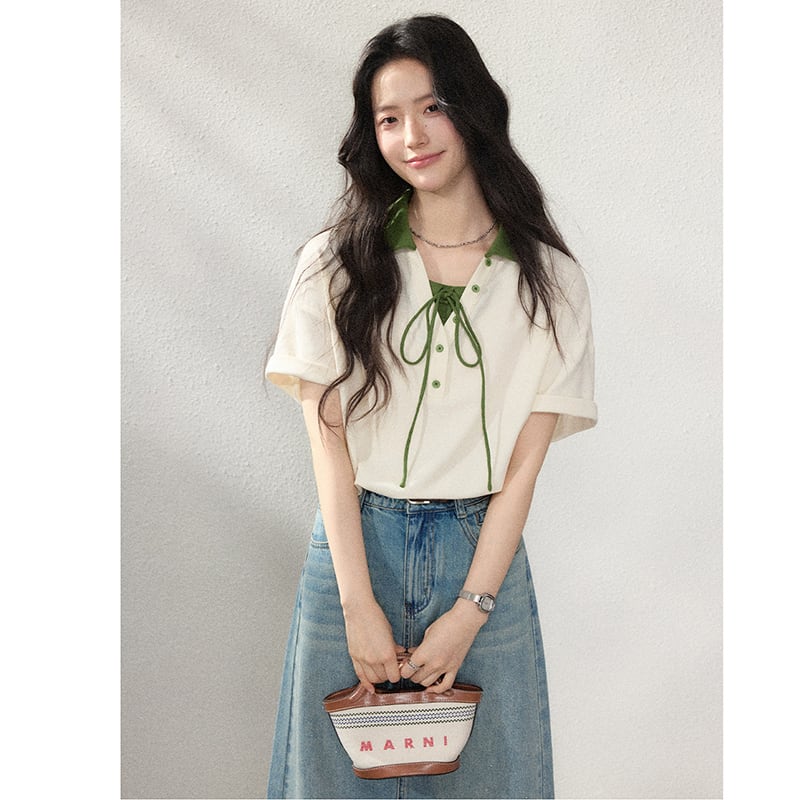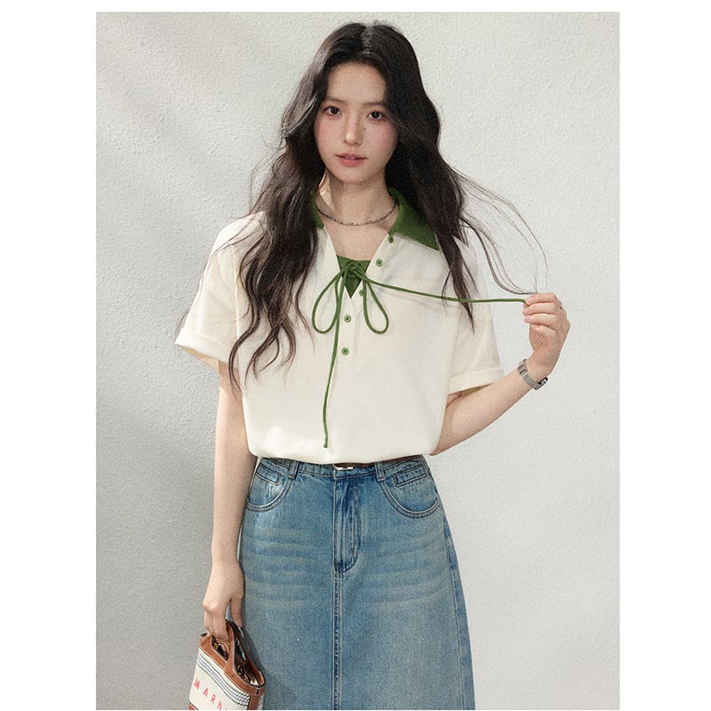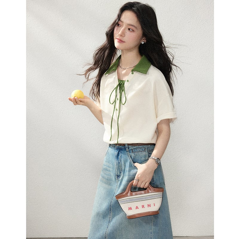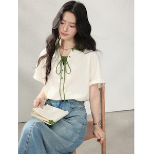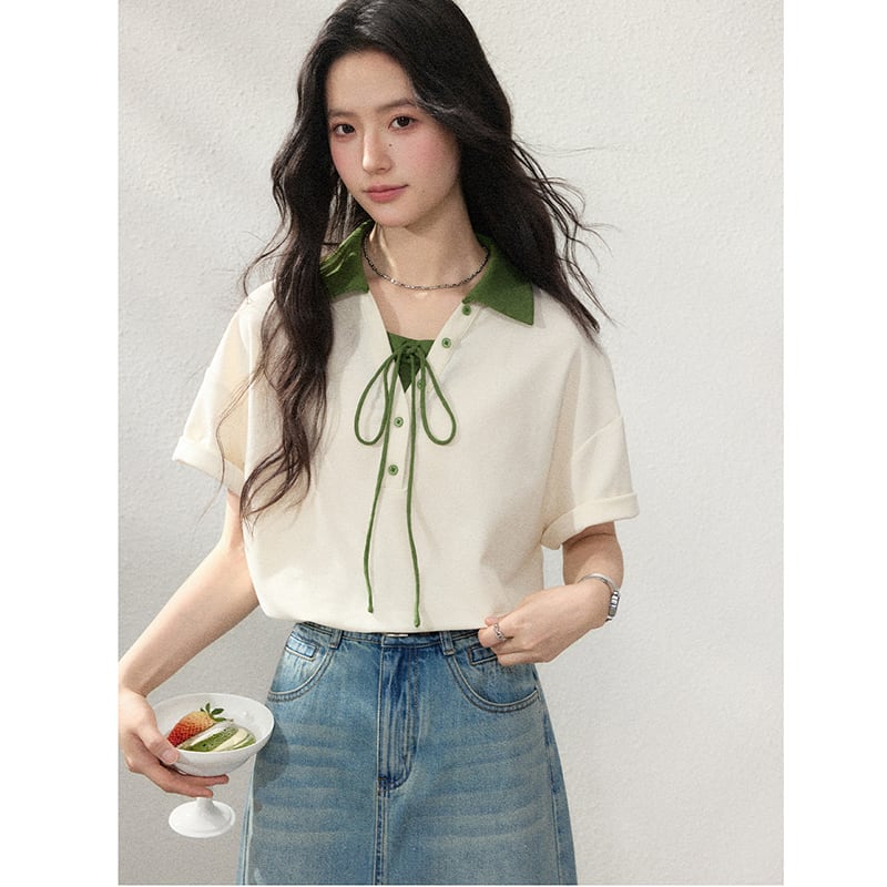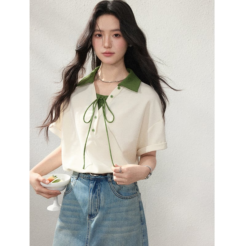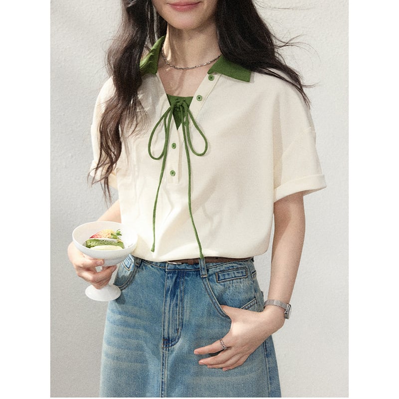 ♥涼しげなベージュ、爽やかに!【ZZZQISシリーズ】★POLOシャツ★ トップス 配色 半袖 夏服 レディース カジュアル グリーン 緑