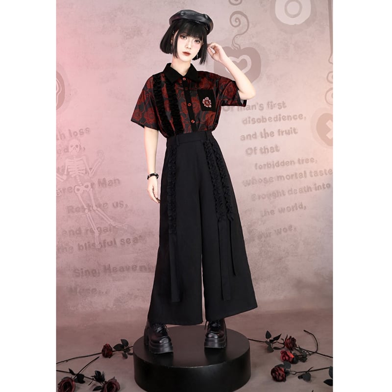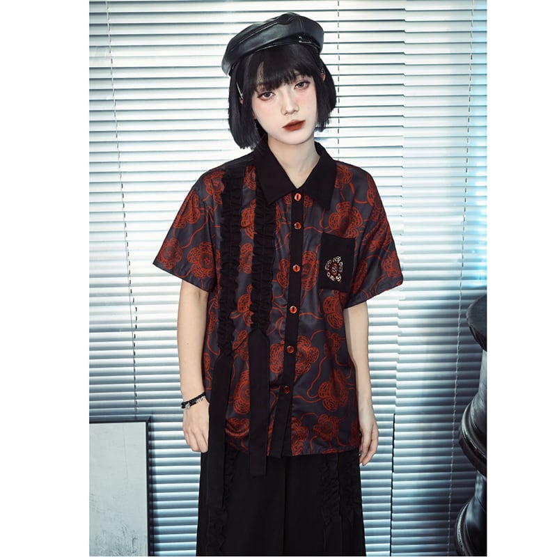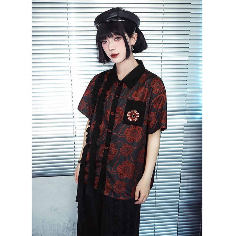 【古怪舍---大王花シリーズ】★チャイナ風トップス★ シャツ 半袖 花柄 オリジナル プリント レトロ 切り替え 配色