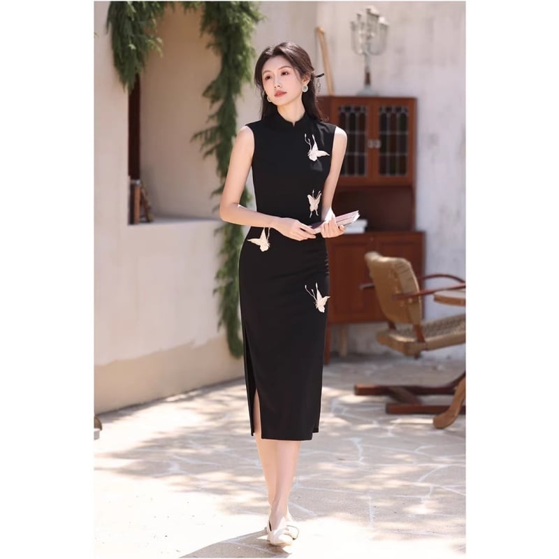 ✿知的で上品な!【花咲シリーズ】★チャイナドレス★チャイナ風 ノースリープ ロングワンピース 知性的 レディース 蝶々 ブラック