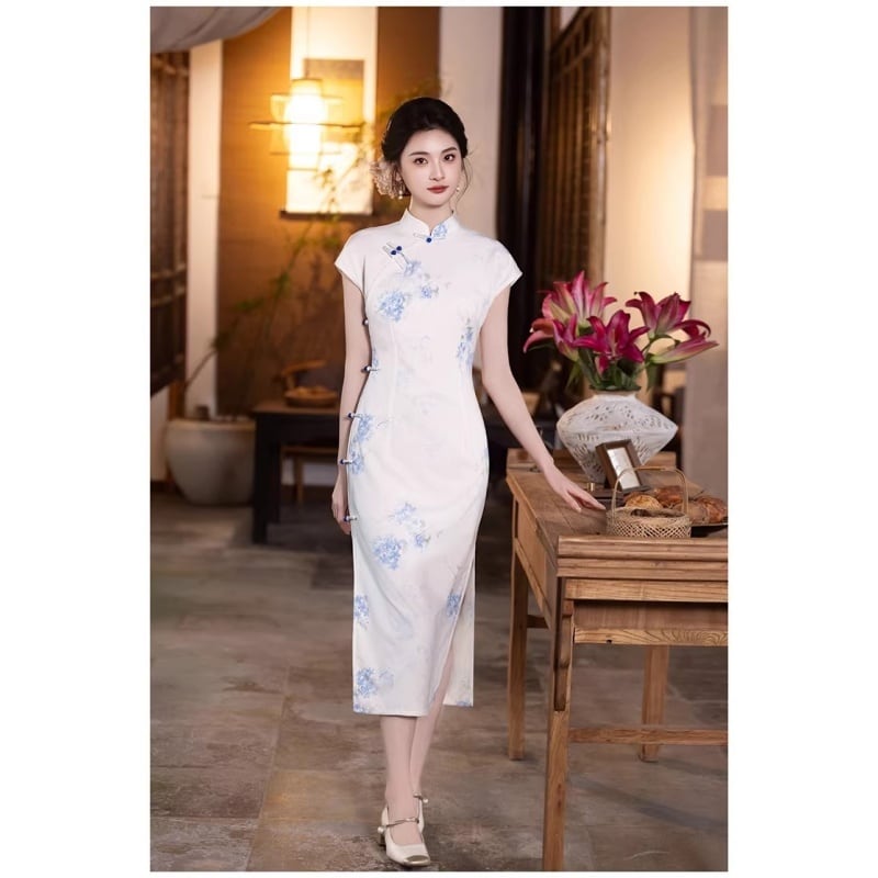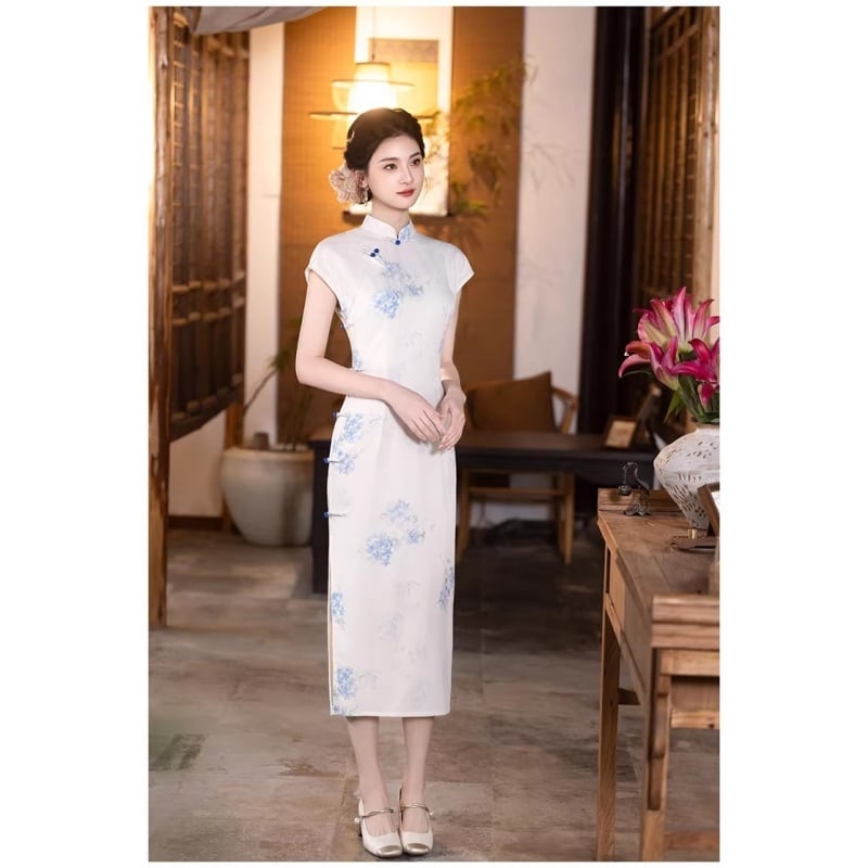✿ほっそり見える 可憐な美しさ!【花咲シリーズ】★チャイナドレス★チャイナ風 レディース 染め付けシリーズ 花柄 ロングワンピース
