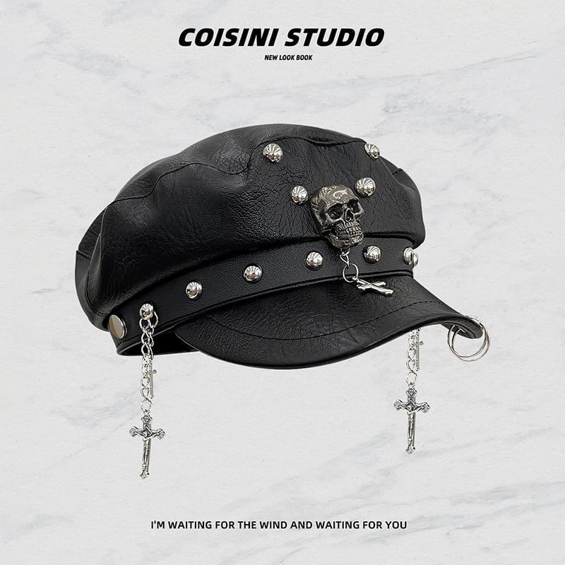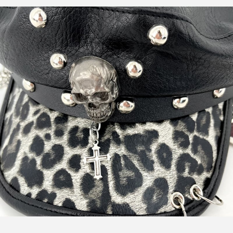 ♥PU×豹柄!【COISINIシリーズ】★帽子★ 2color Y2K ハット アクセサリー 豹柄 髑髏 ブラック 黒い かっこいい
