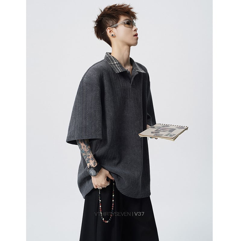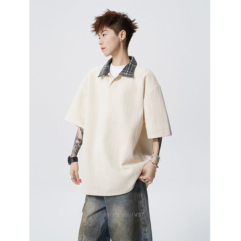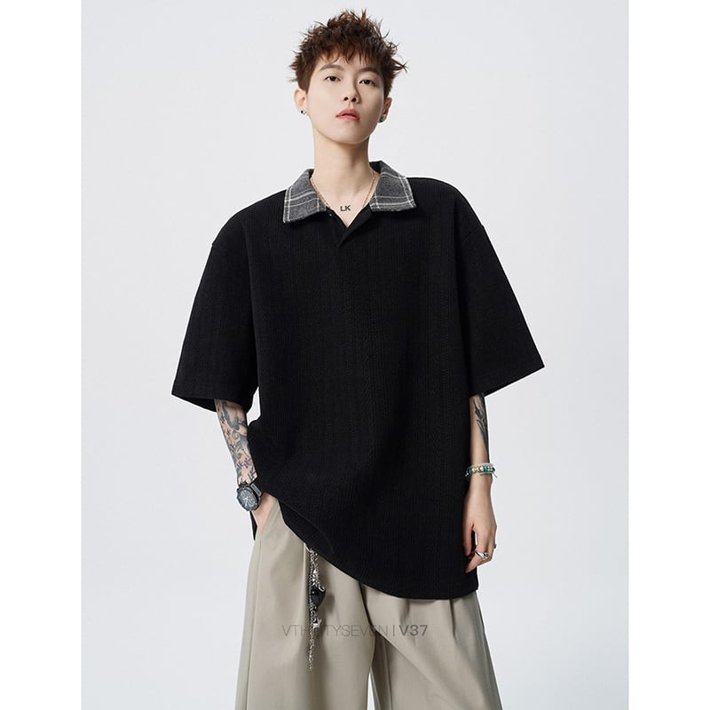 ♥麦穂テクスチャー×撞色襟!【V37シリーズ】★POLOシャツ★ 3color トップス ユニセックス チェック柄 カジュアル