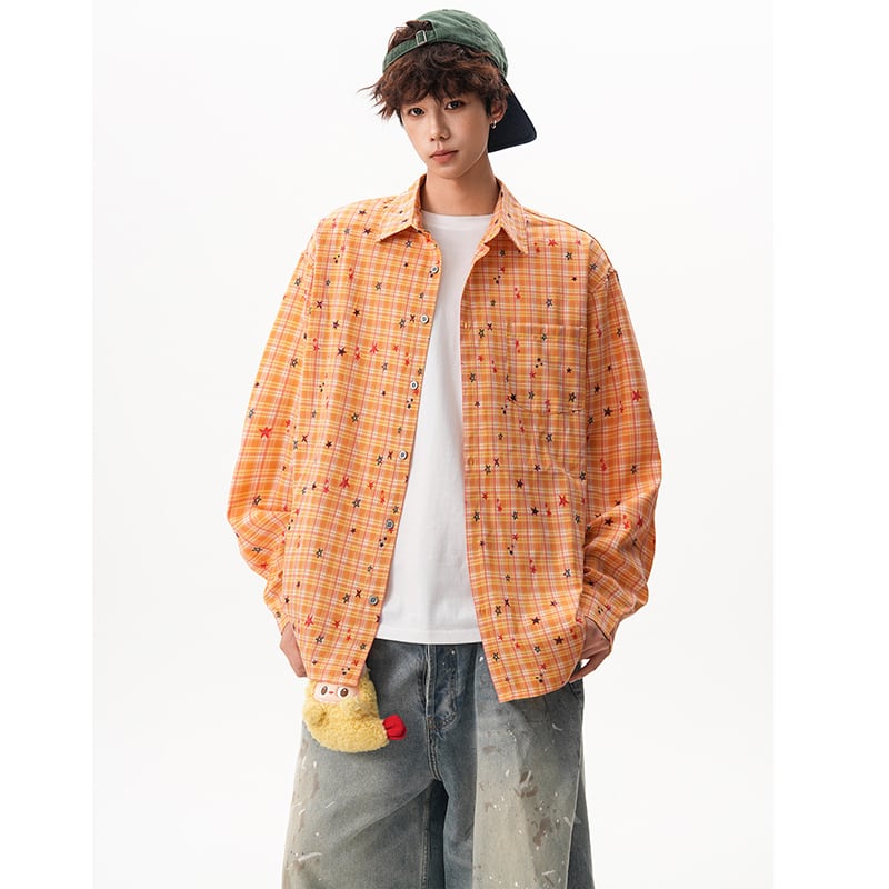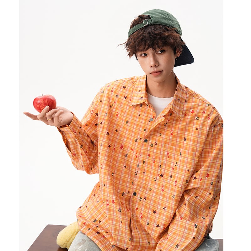 ♥シャツにちりばめた星のように!【Qotriockシリーズ】★シャツ★ トップス ユニセックス メンズ 長袖 星柄 オレンジ