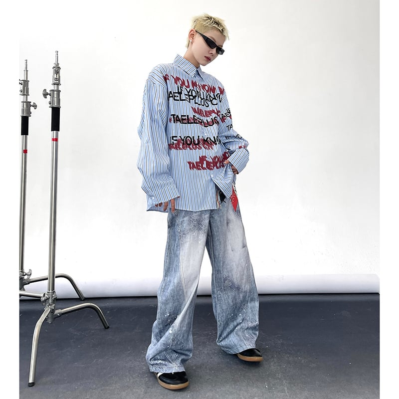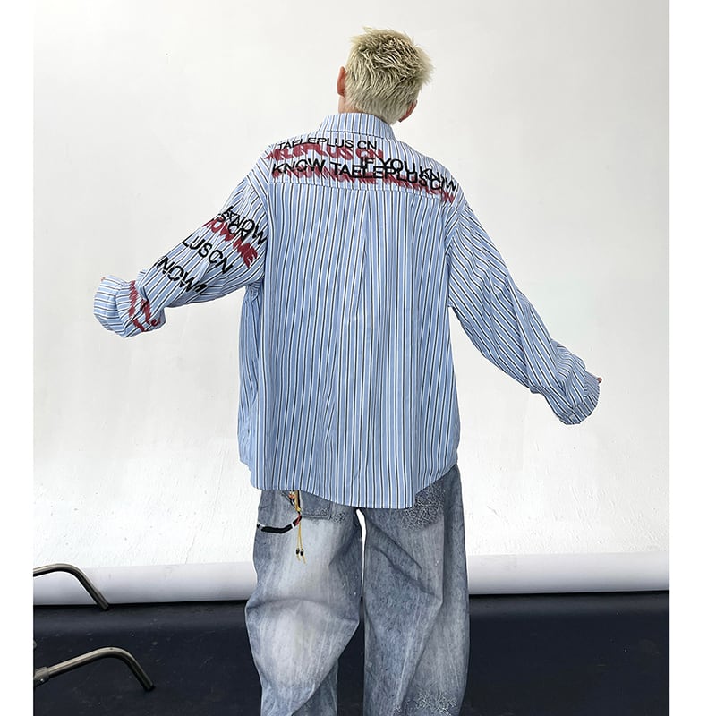 ♥アルファベットが揺れる、重影(ダブルビジョン)プリント!【MINGMENシリーズ】★シャツ★ トップス ユニセックス メンズ 長袖 アルファベット 縦縞 縞模様