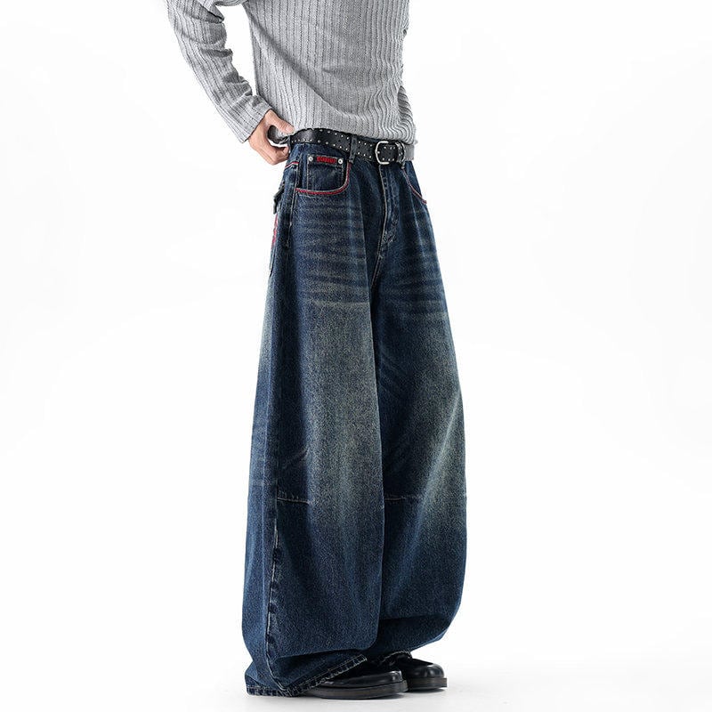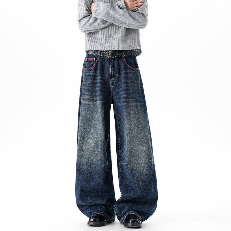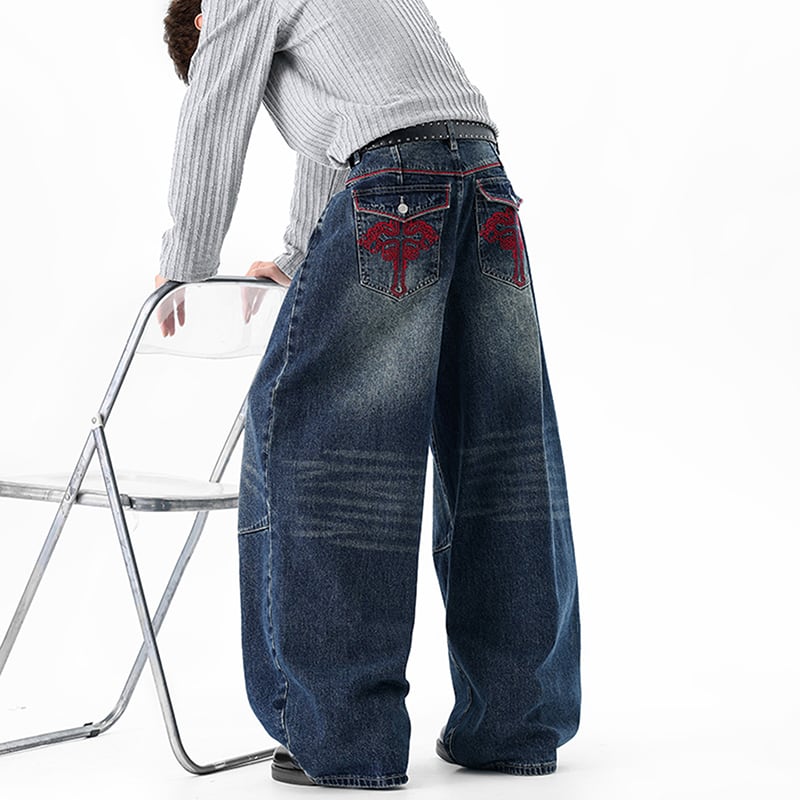 ඩ赤い刺繍入りデニムパンツ!【Cearocowシリーズ】★デニムパンツ★ 刺繍 ユニセックス ズボン ボトムス ブルー 青い