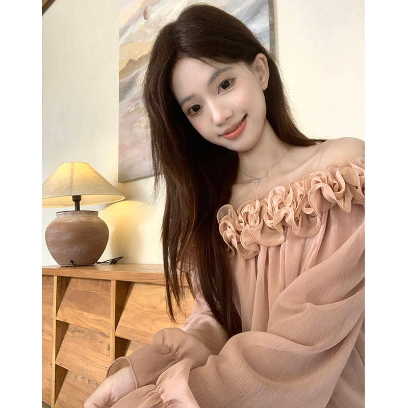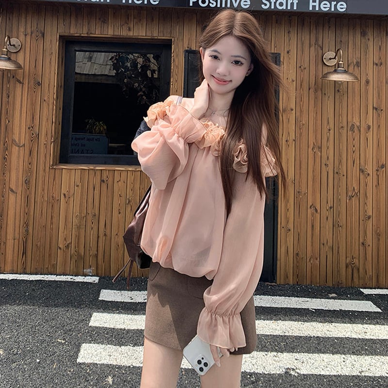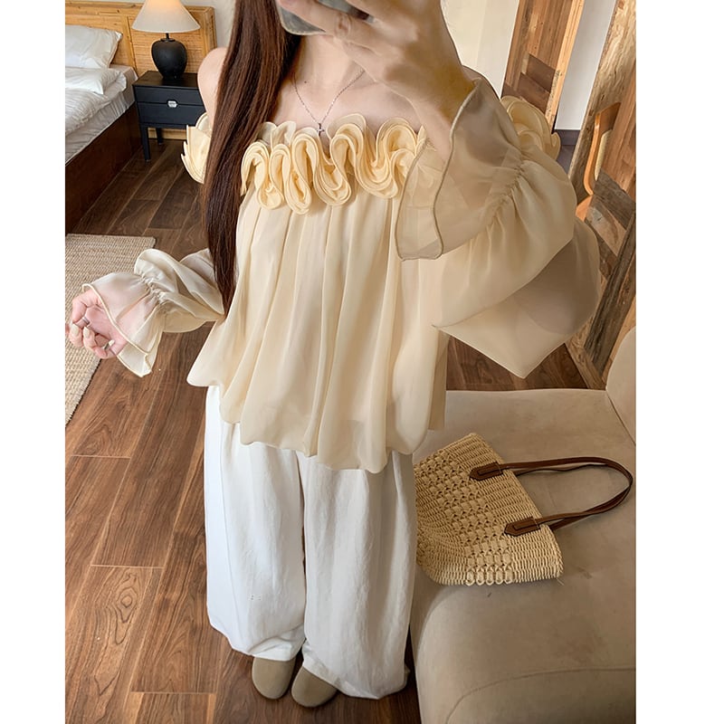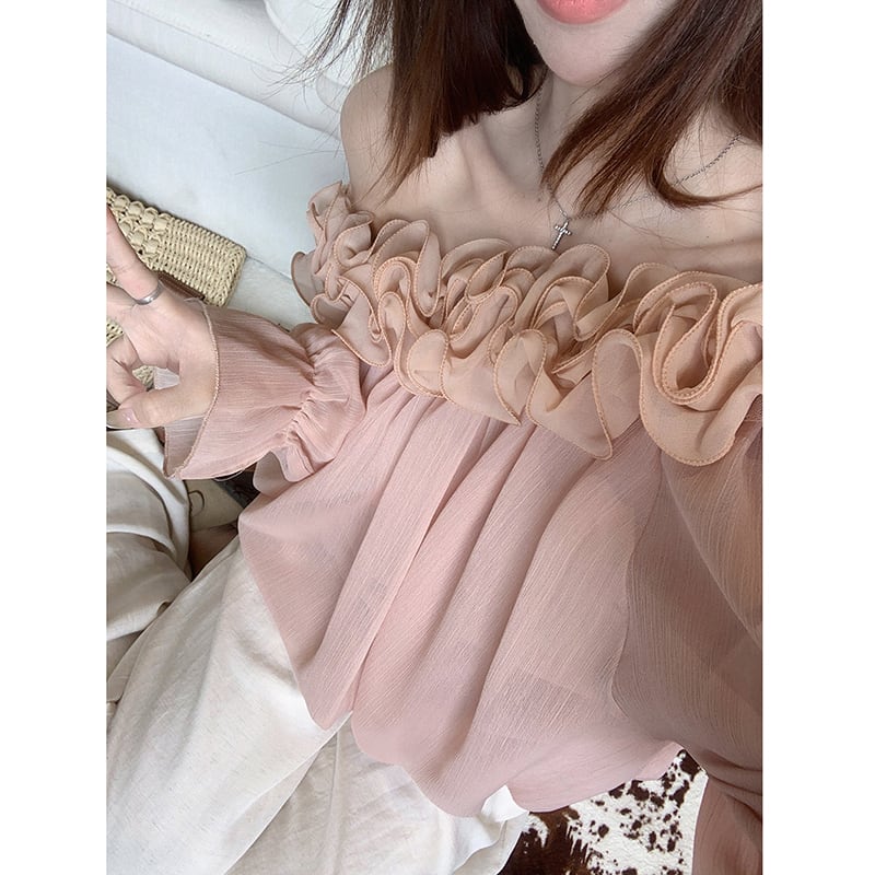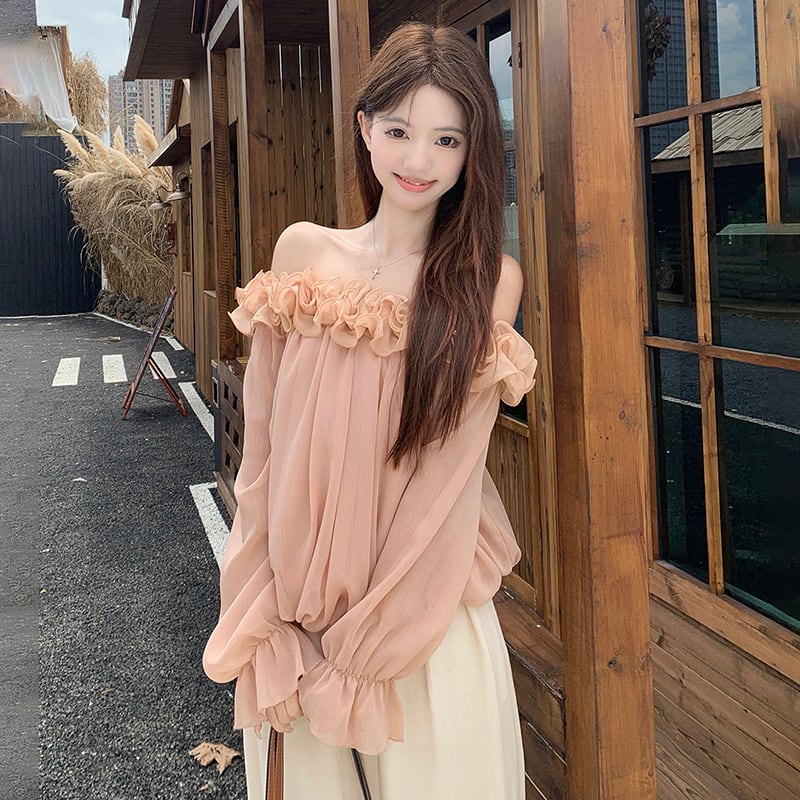 ❦肩先のラインが女性らしさを引き立てる!【Kumikumiシリーズ】★トップス★ トップス 2color 花柄 長袖 肩だし 可愛い