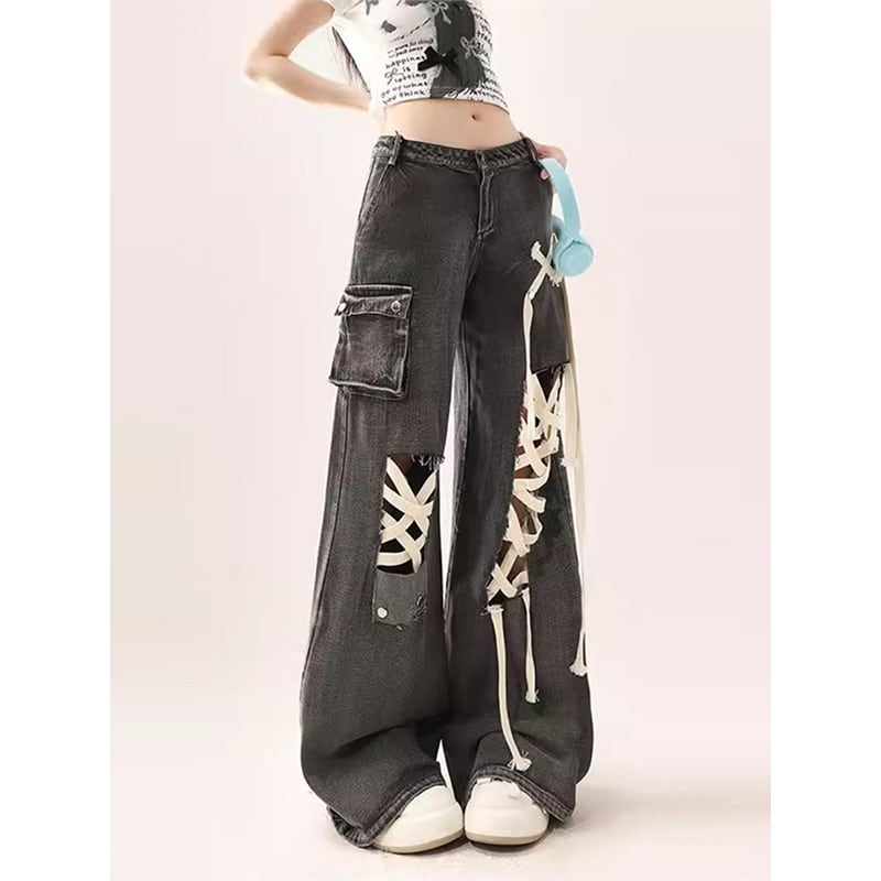 ඩ黒灰・縛帯・ダメージ・大きいサイズ!【DSCMFFシリーズ】★デニムパンツ★ ズボン ボトムス ダメージ加工