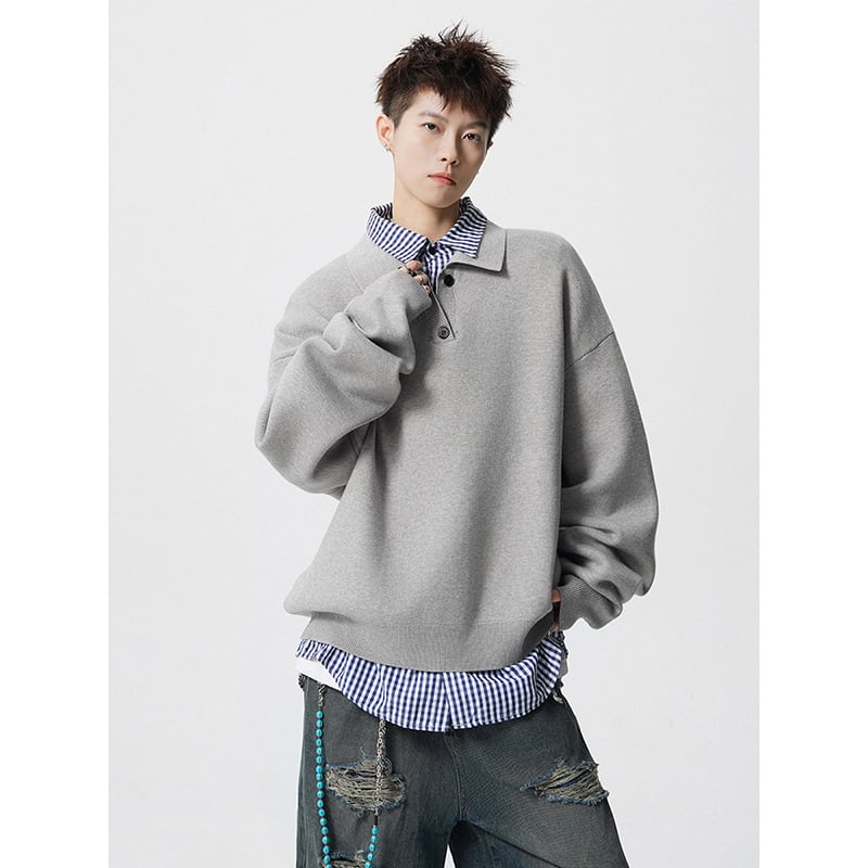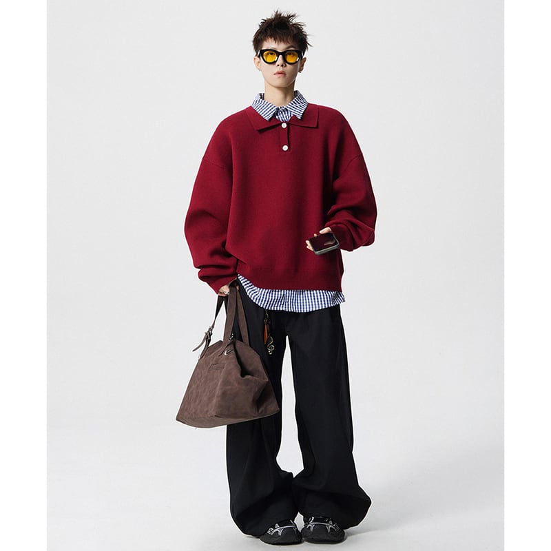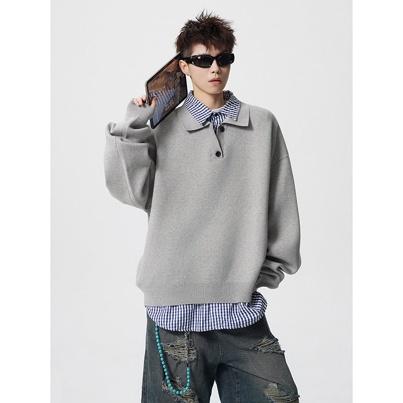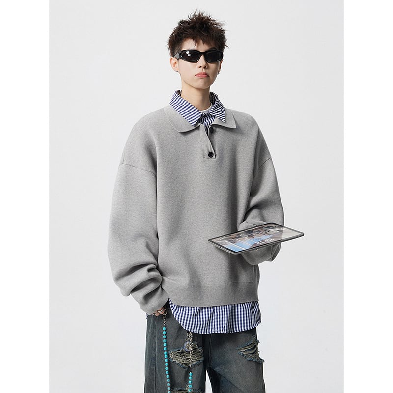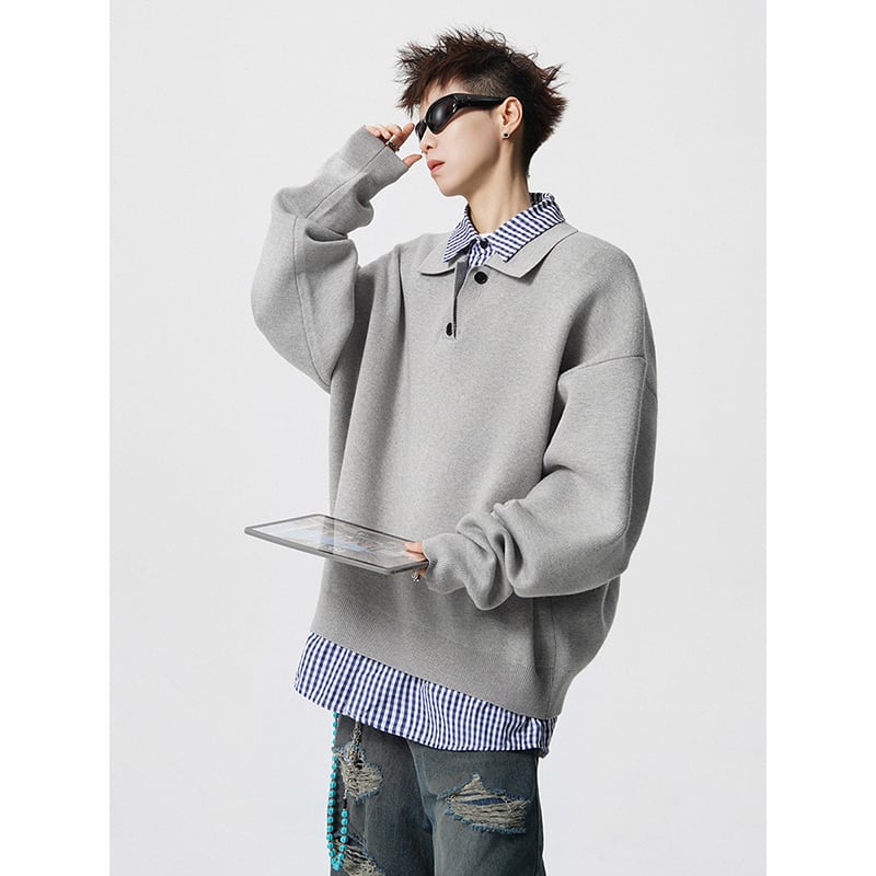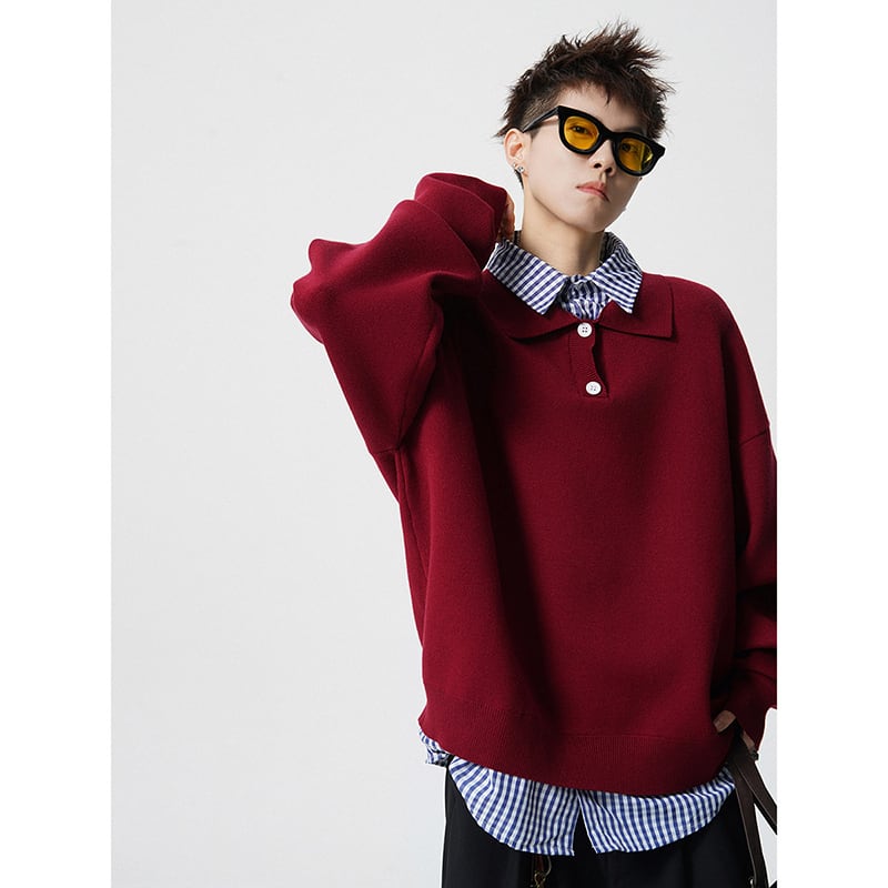 ♥偽二重ニット!【V37シリーズ】★POLOシャツ★ 2color トップス ニット 長袖 ユニセックス メンズ フェイクレイヤード 赤 灰