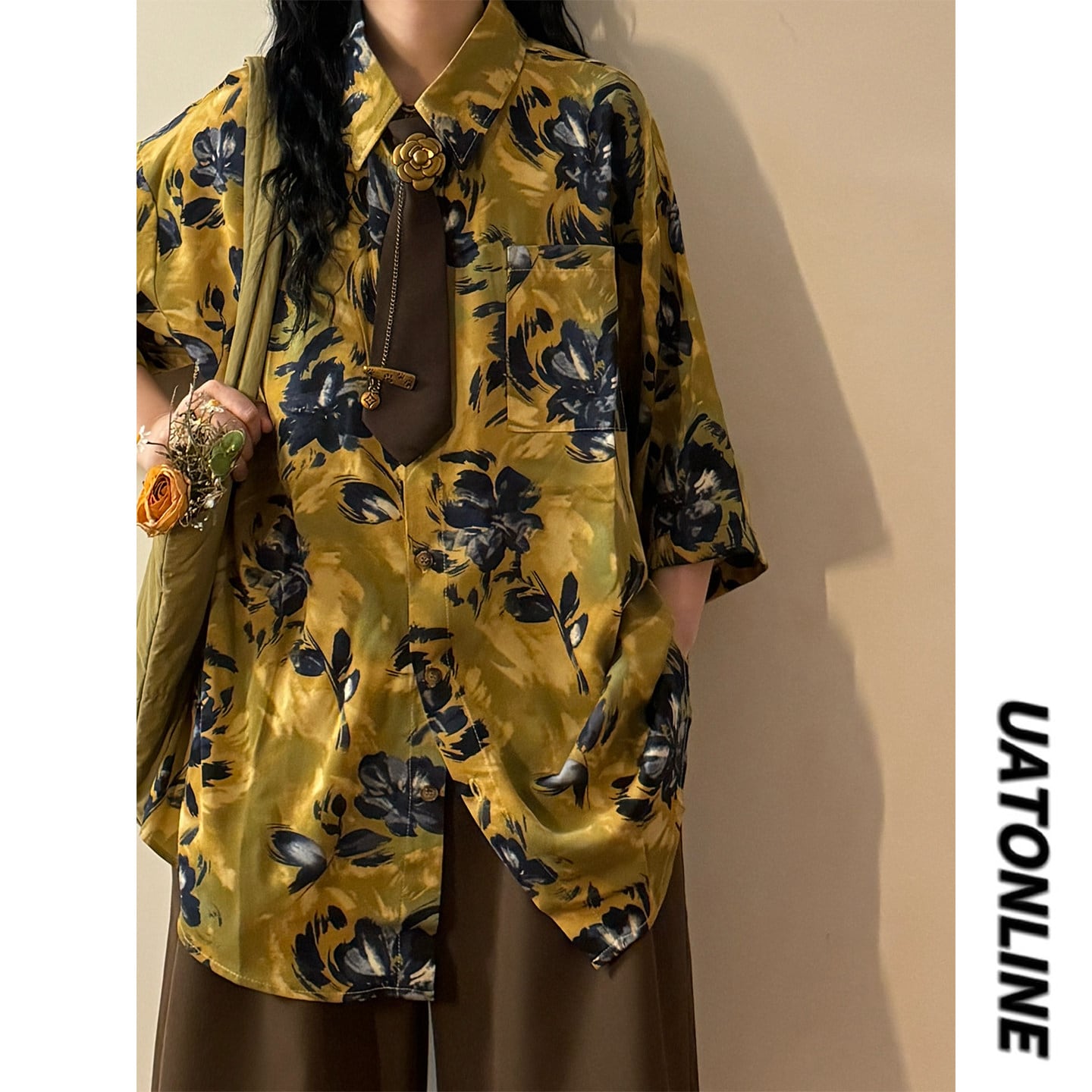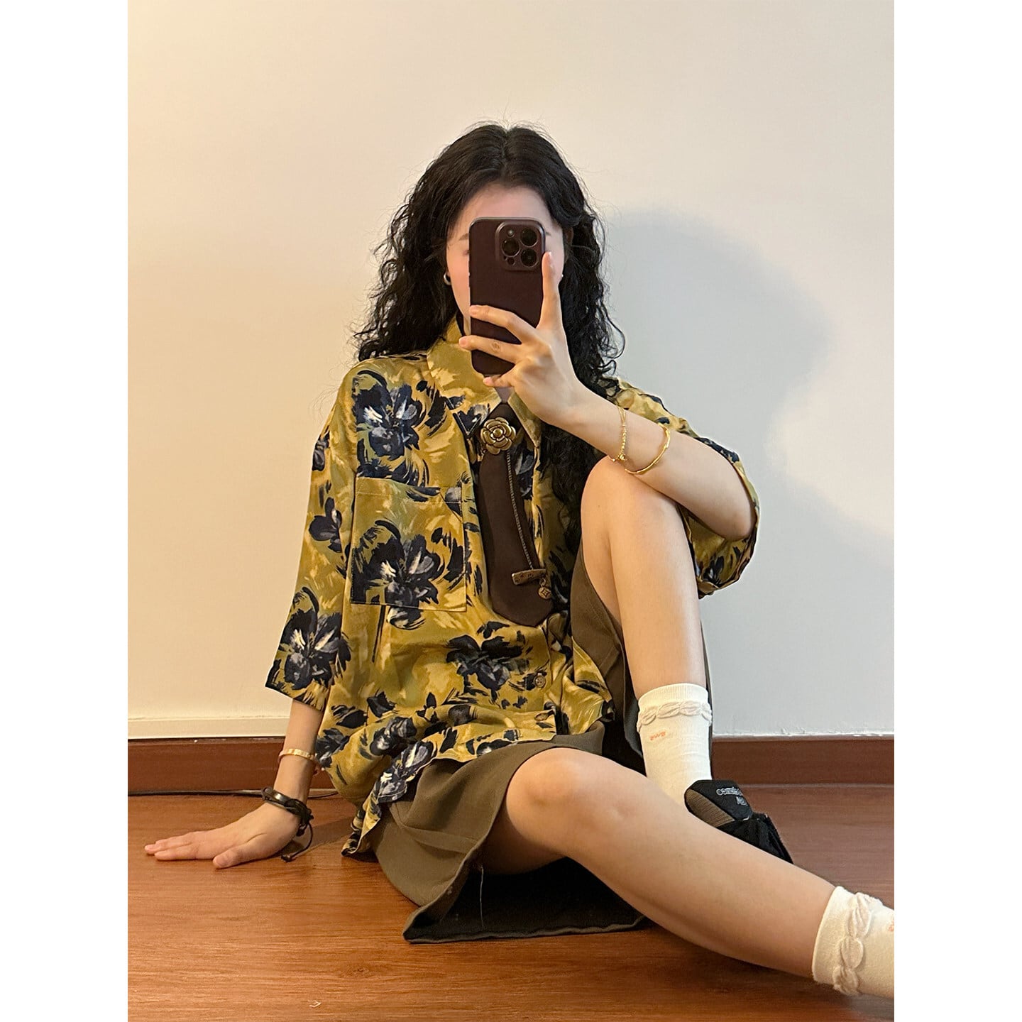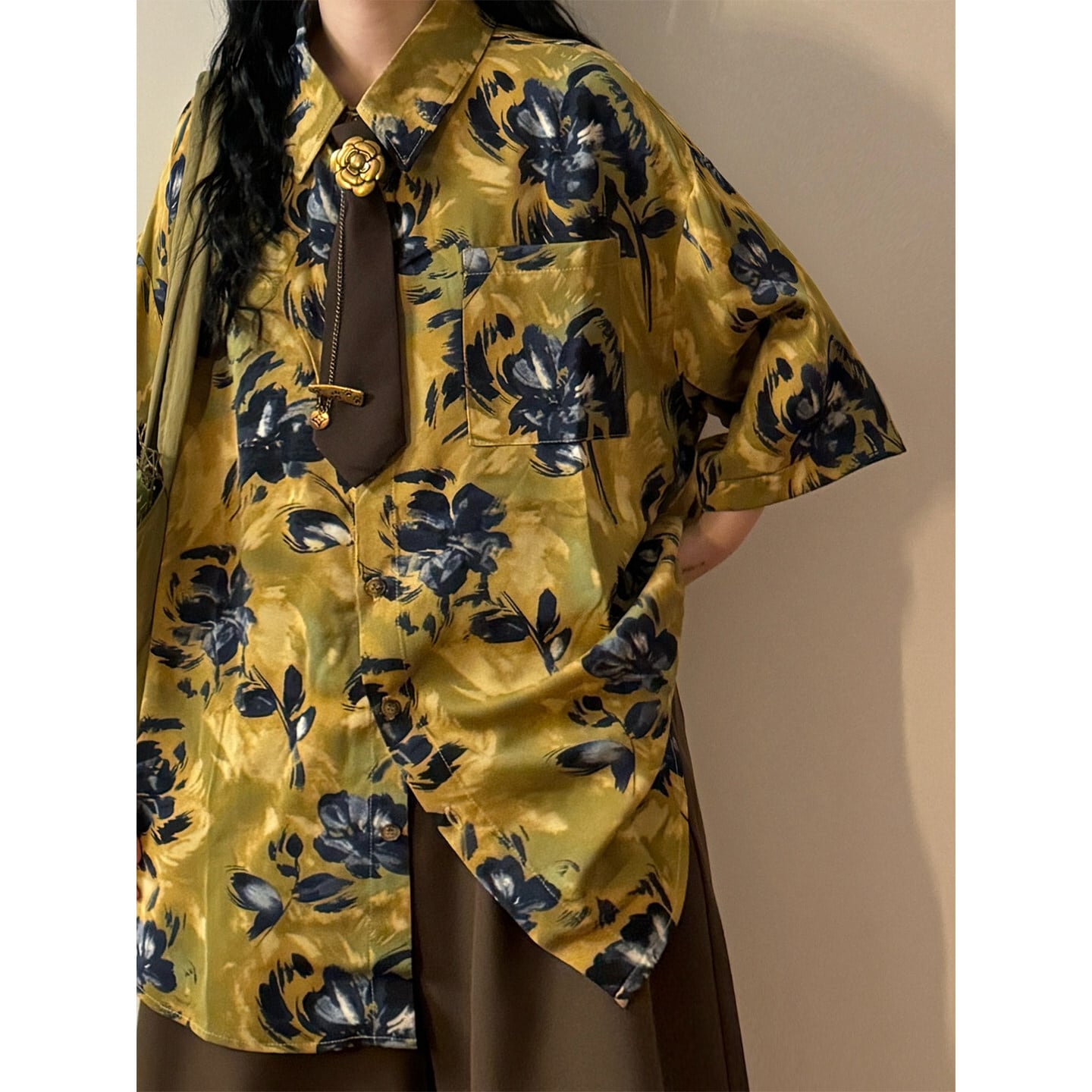 ♥カラーが効いたデザインで、夏コーデの主役に!【UATONLINEシリーズ】★チャイナ風トップス★ ネクタイ付きシャツ トップス 半袖シャツ ユニセックス 花柄シャツ