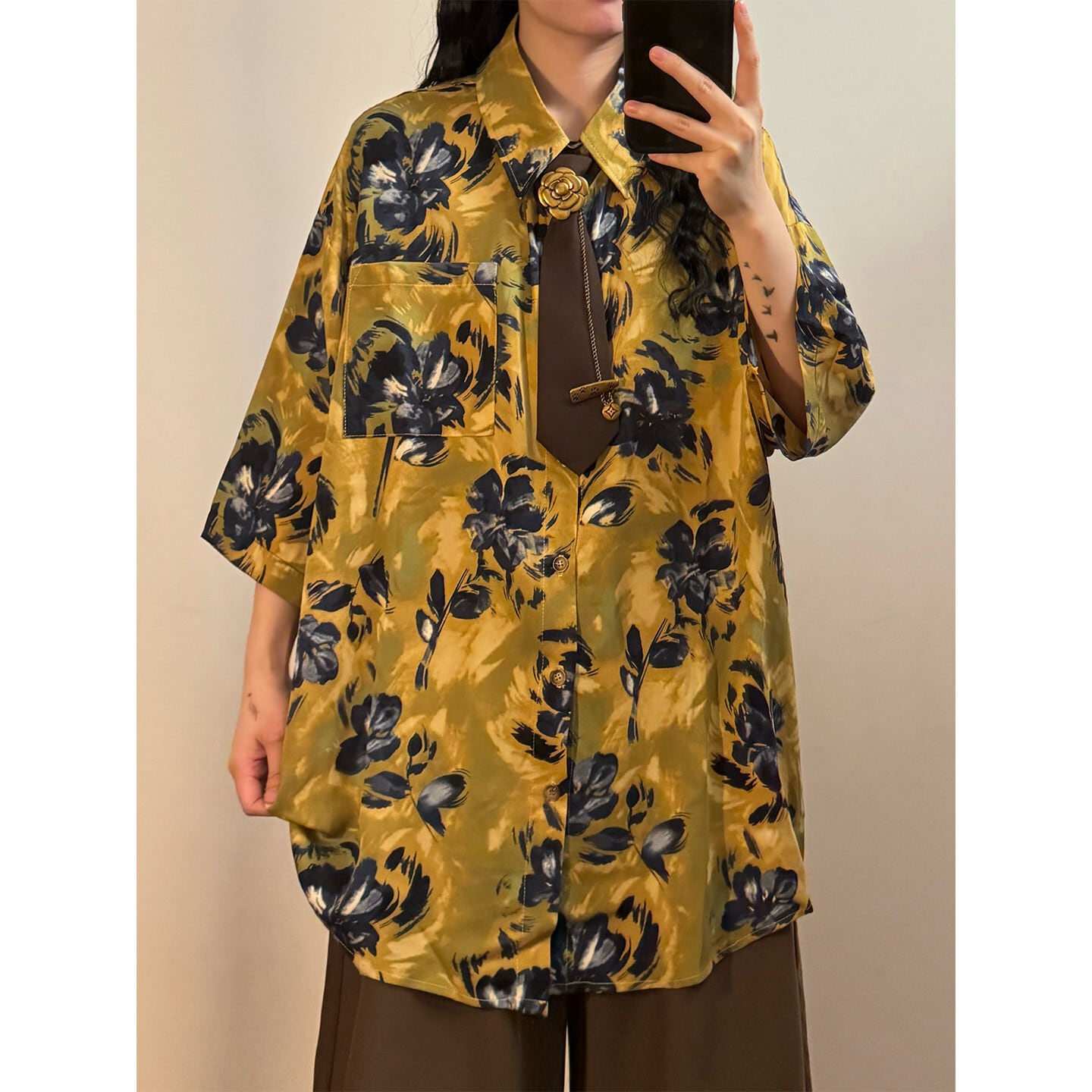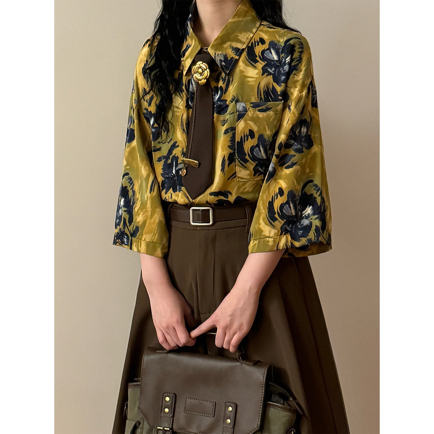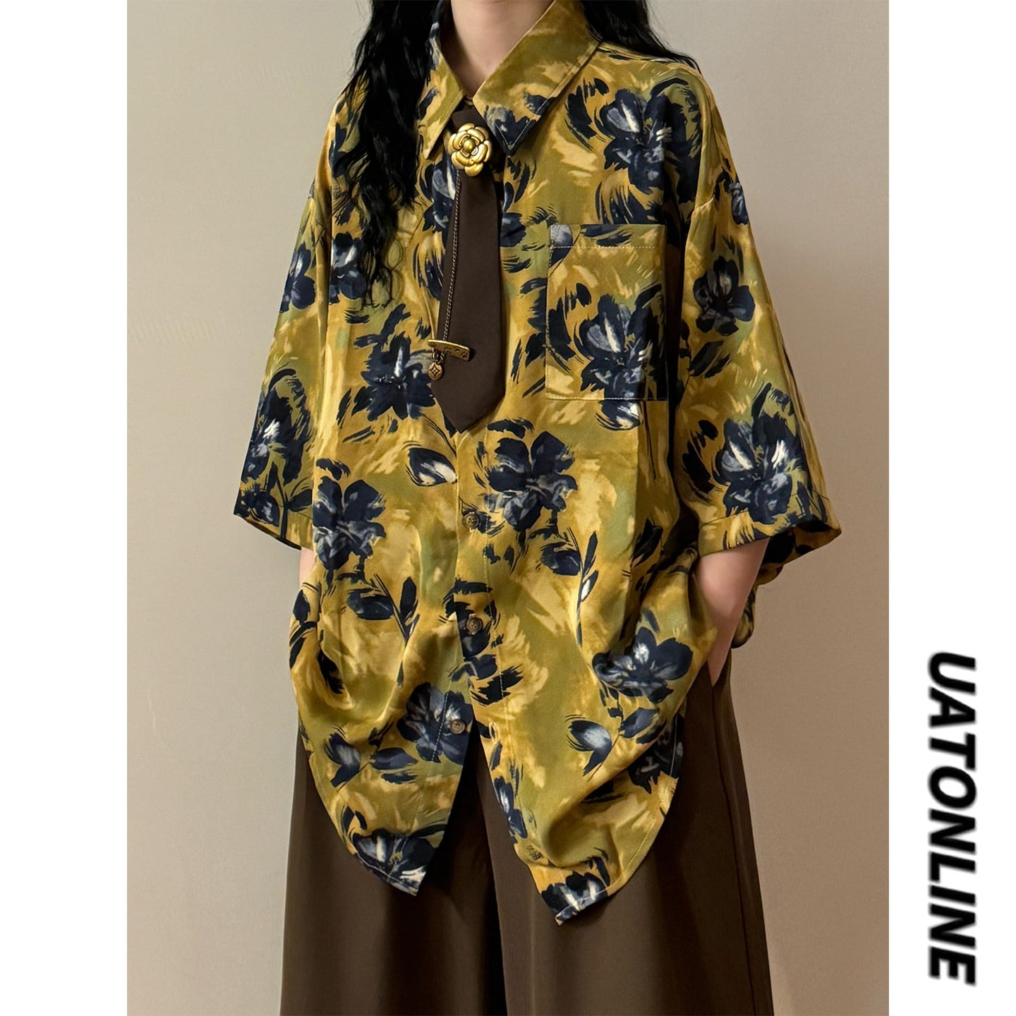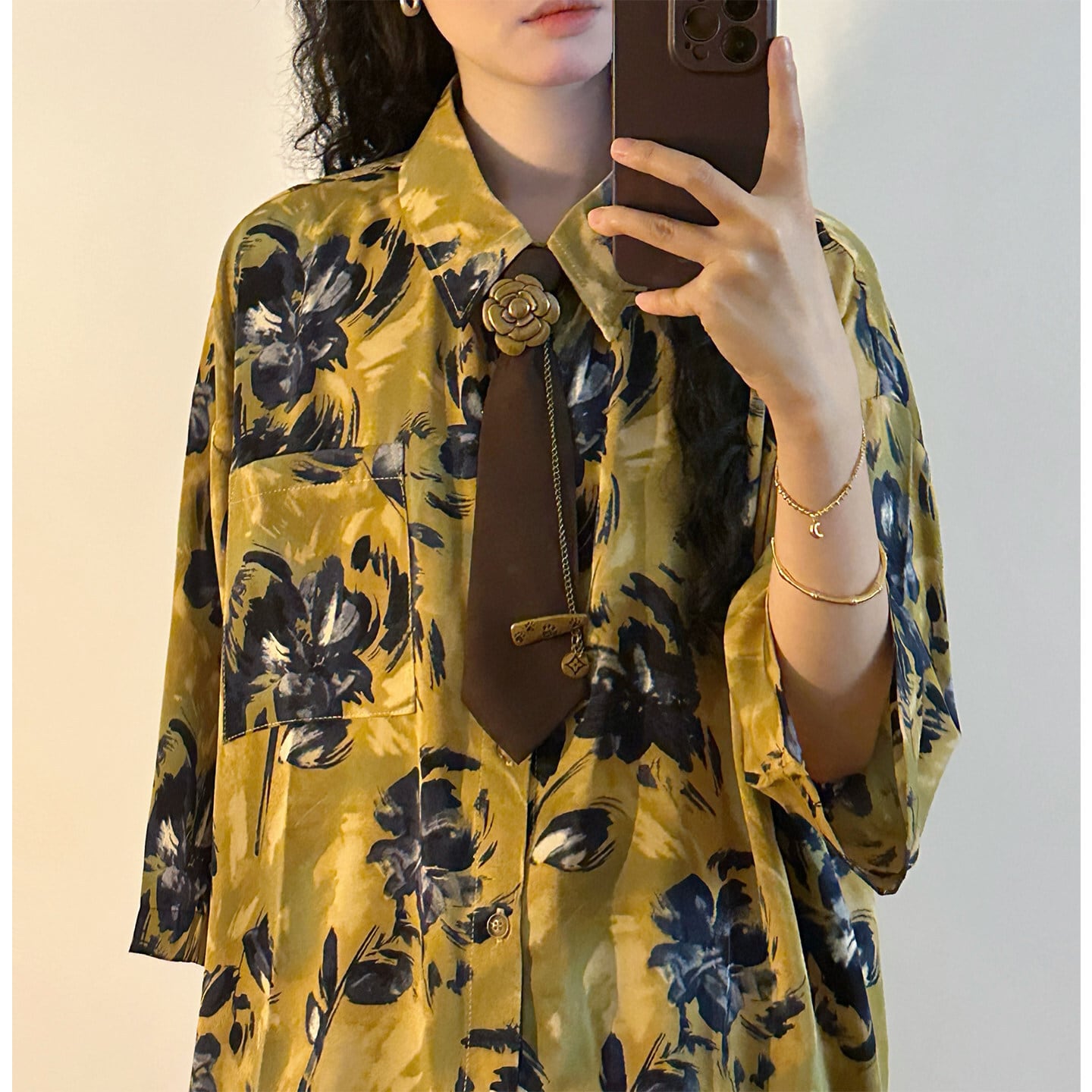 ♥カラーが効いたデザインで、夏コーデの主役に!【UATONLINEシリーズ】★チャイナ風トップス★ ネクタイ付きシャツ トップス 半袖シャツ ユニセックス 花柄シャツ