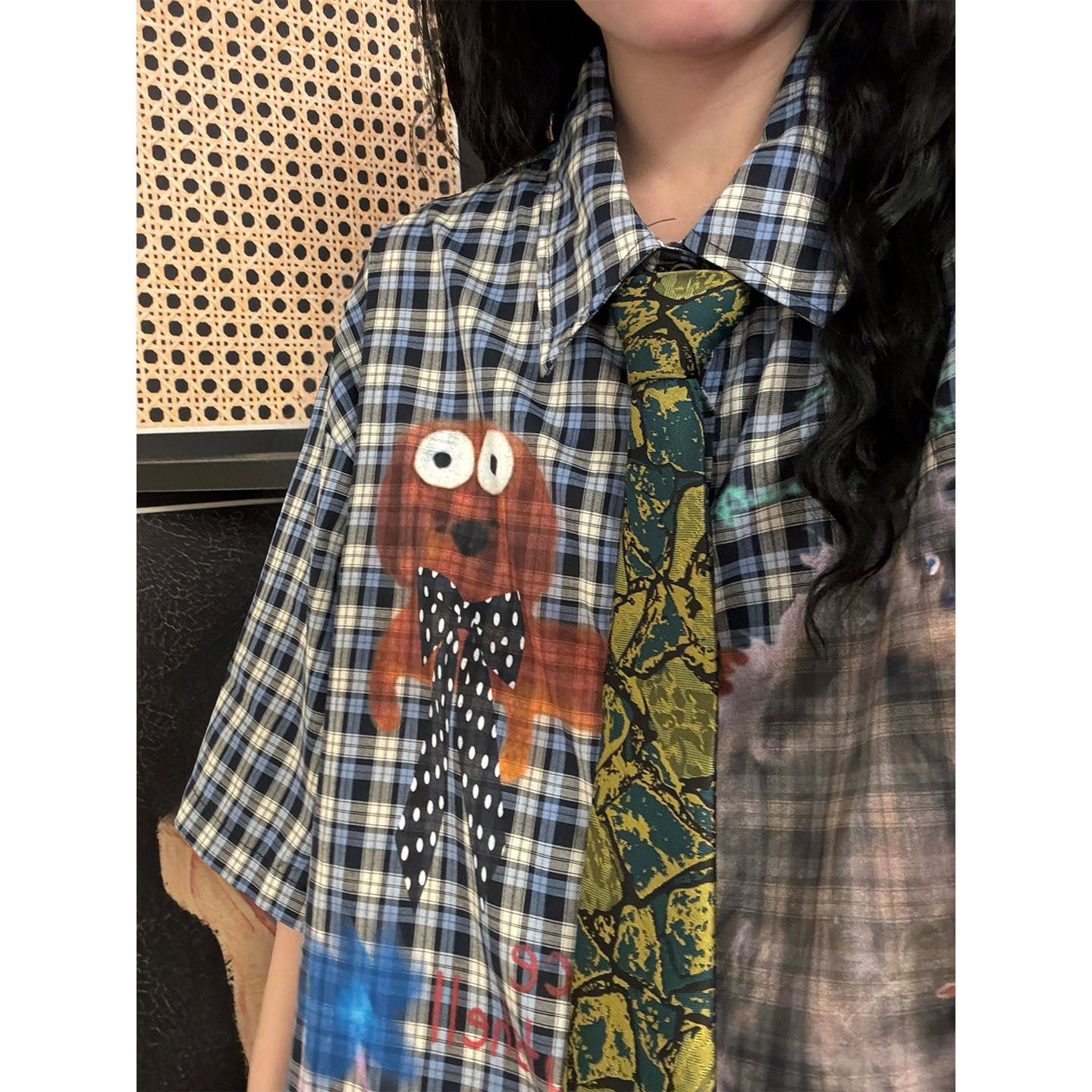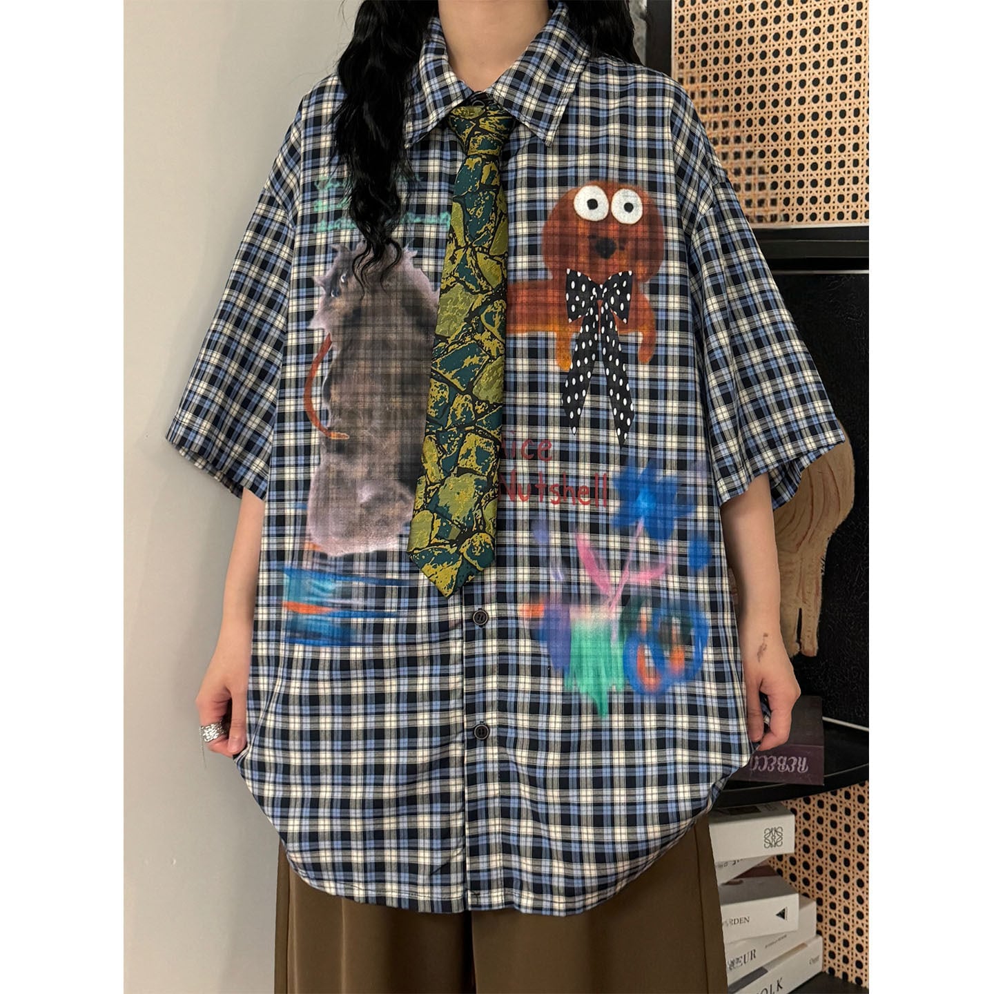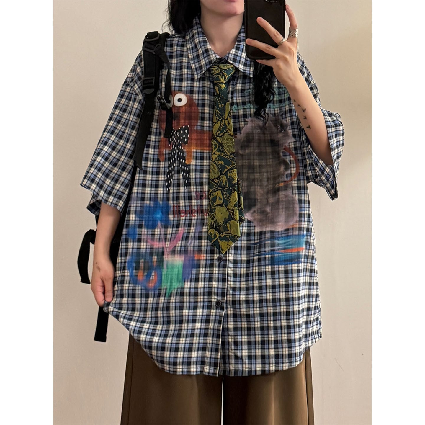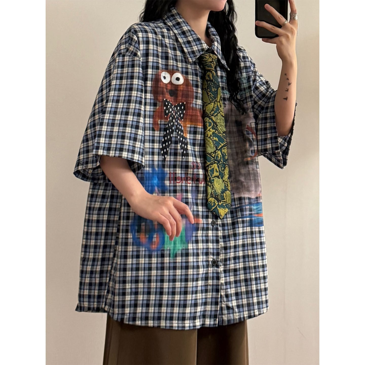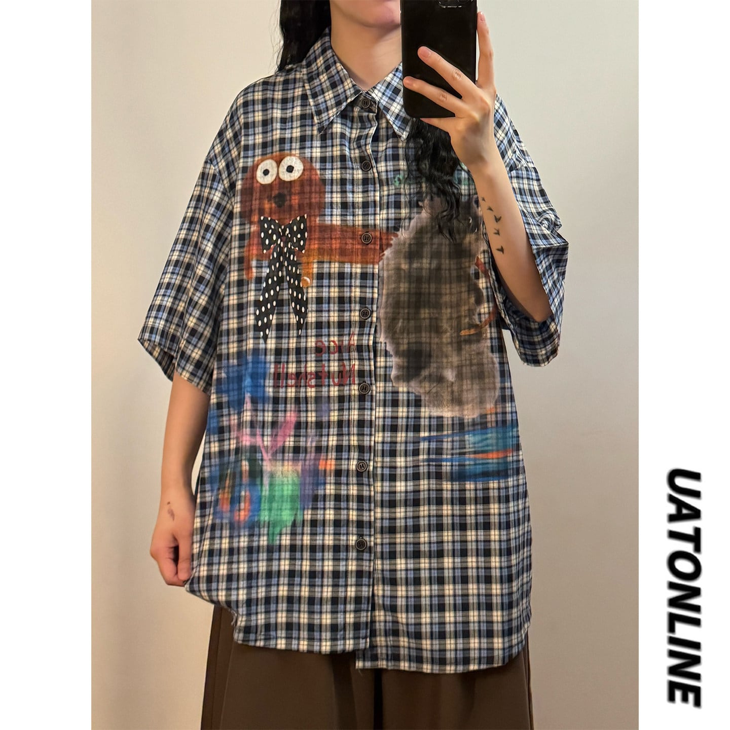 ♥デザインシャツで差をつける!【UATONLINEシリーズ】★シャツ ★ ネクタイ付きシャツ トップス 半袖シャツ ユニセックス チェック柄 カートゥーン