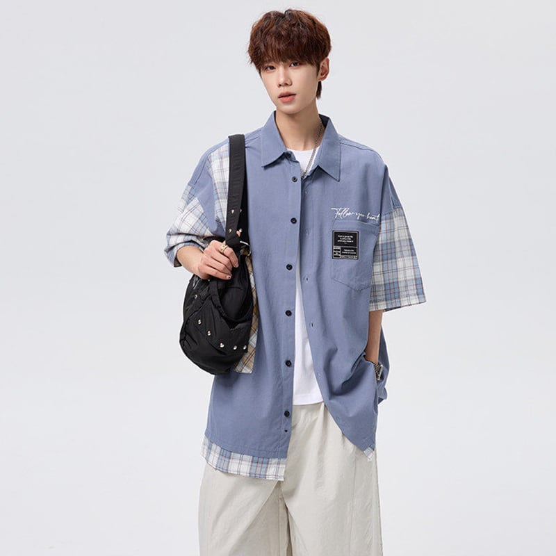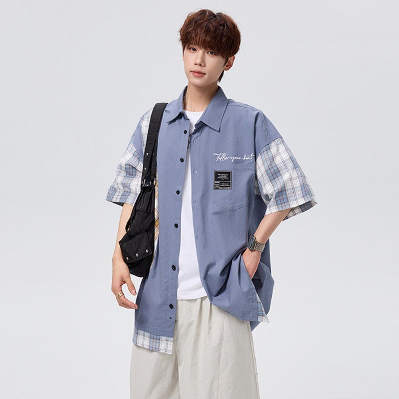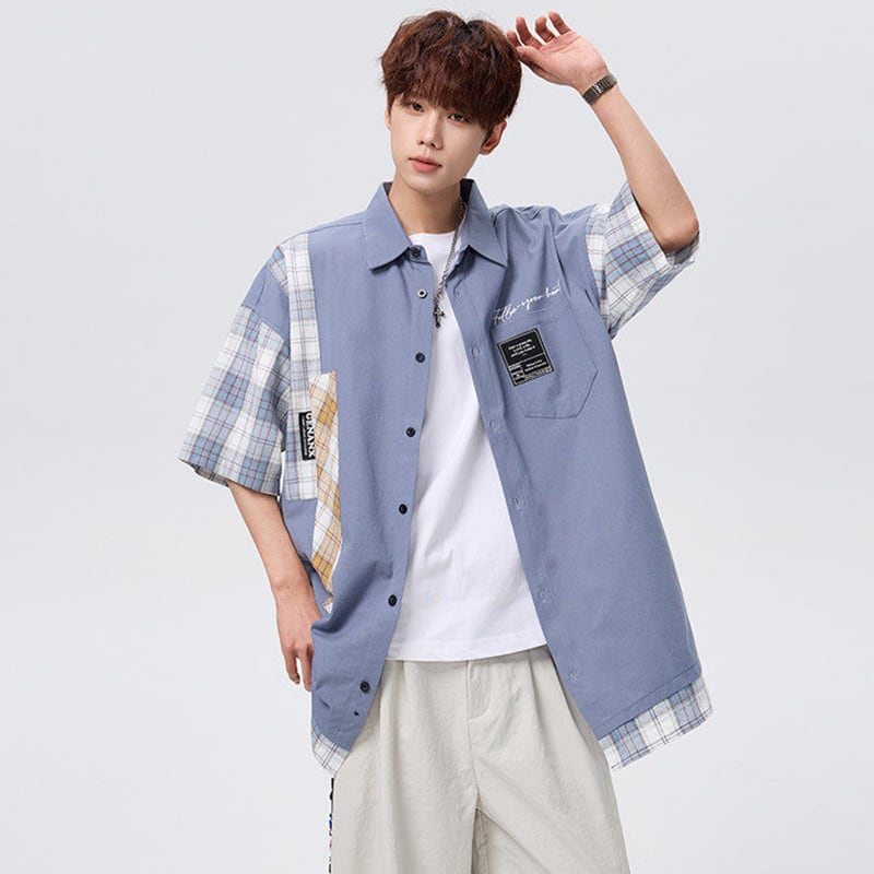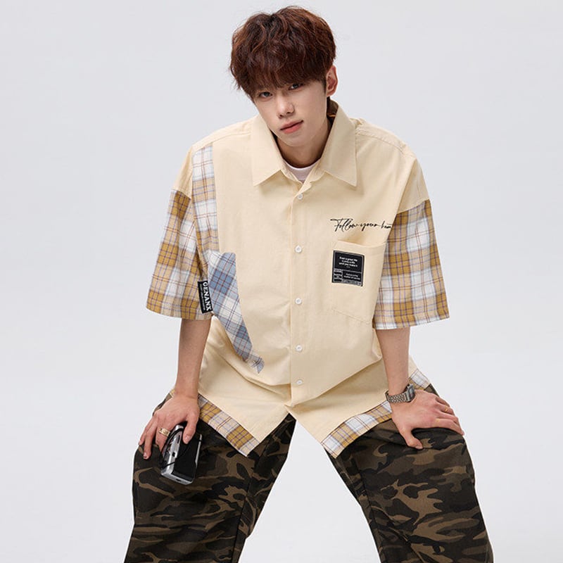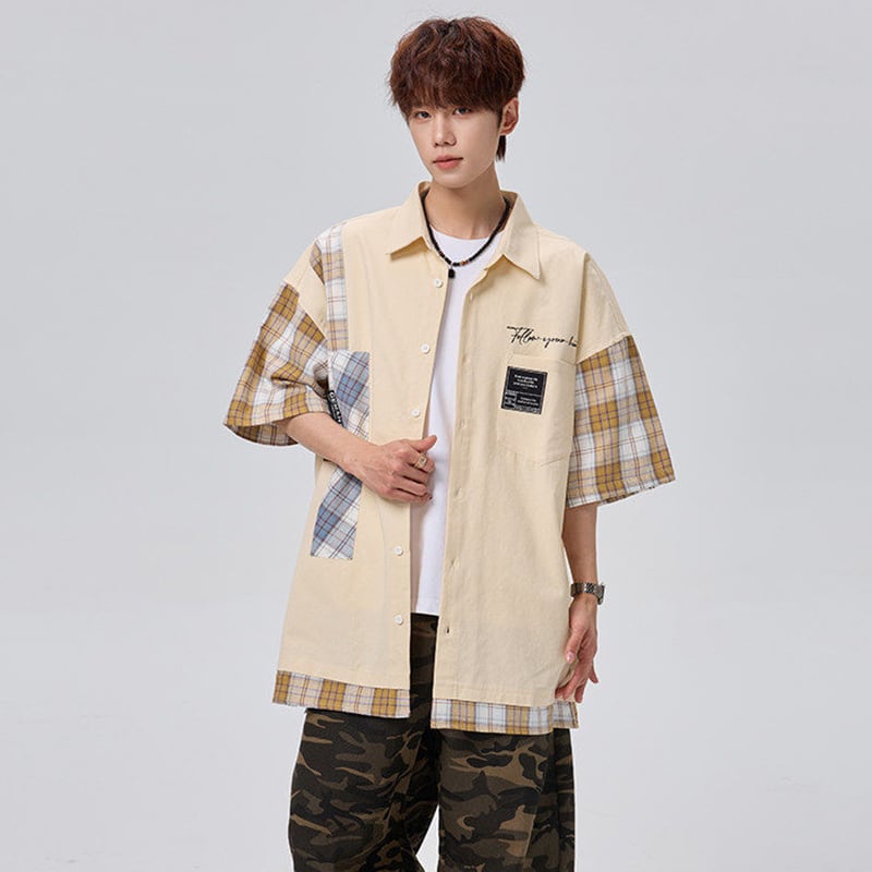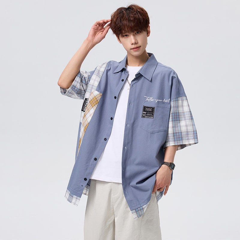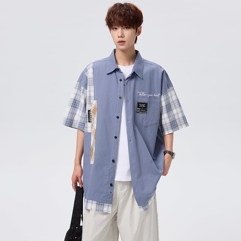 ♥色違いのパッチワークが目を引く!【SYシリーズ】★シャツ★ 2color トップス 半袖 ユニセックス メンズ カジュアル 切り替え チェック柄