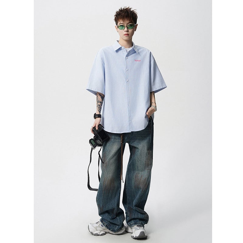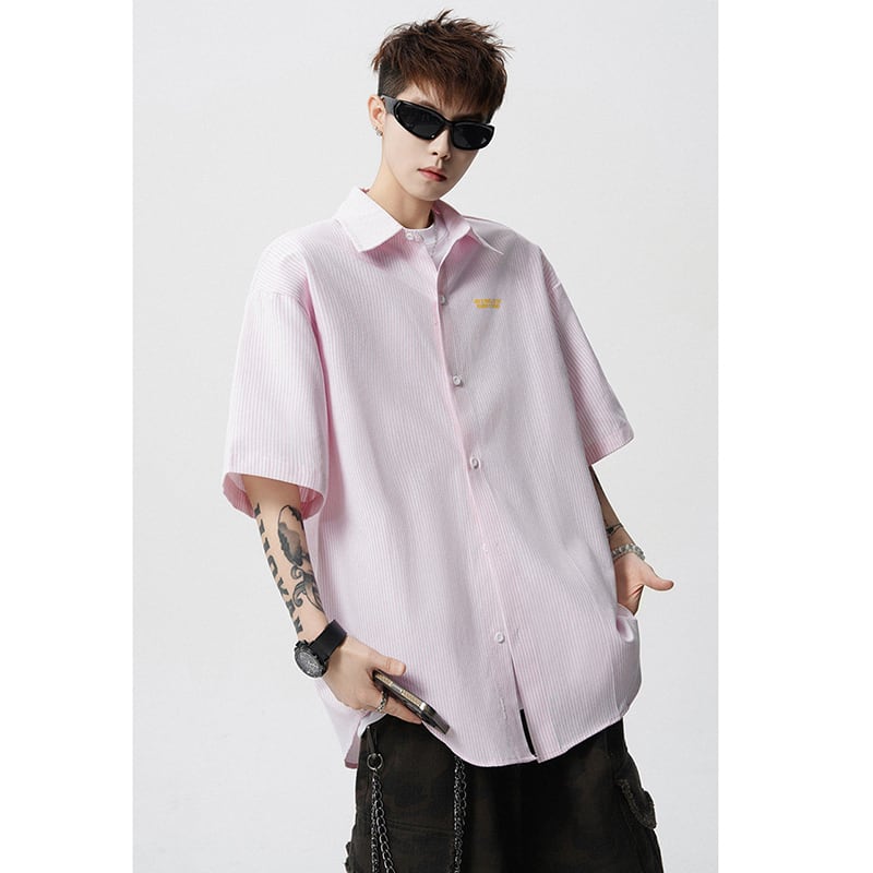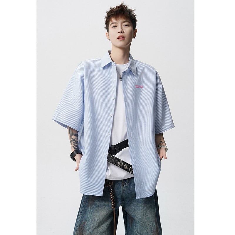 【V37シリーズ】★シャツ★ 3color選択可能 トップス 半袖 ユニセックス メンズ 縦縞 縞模様 アルファベット