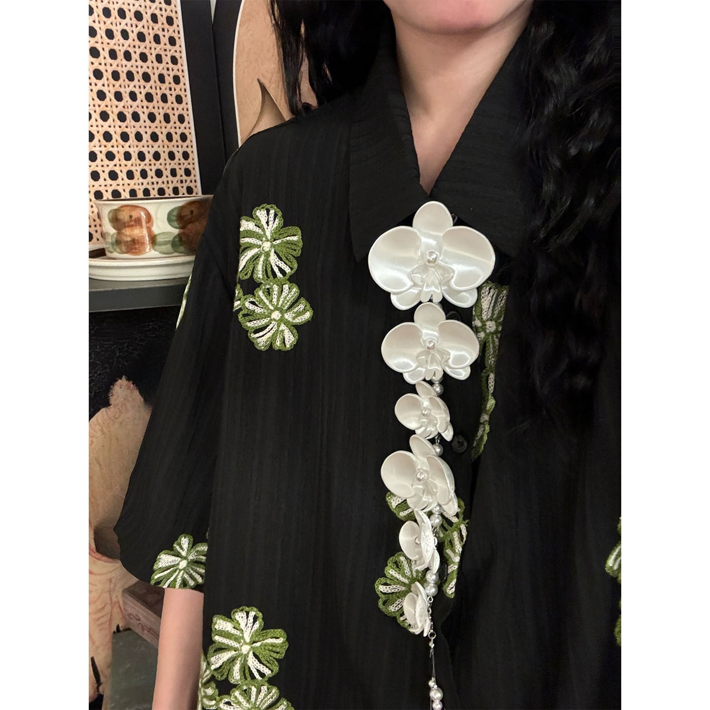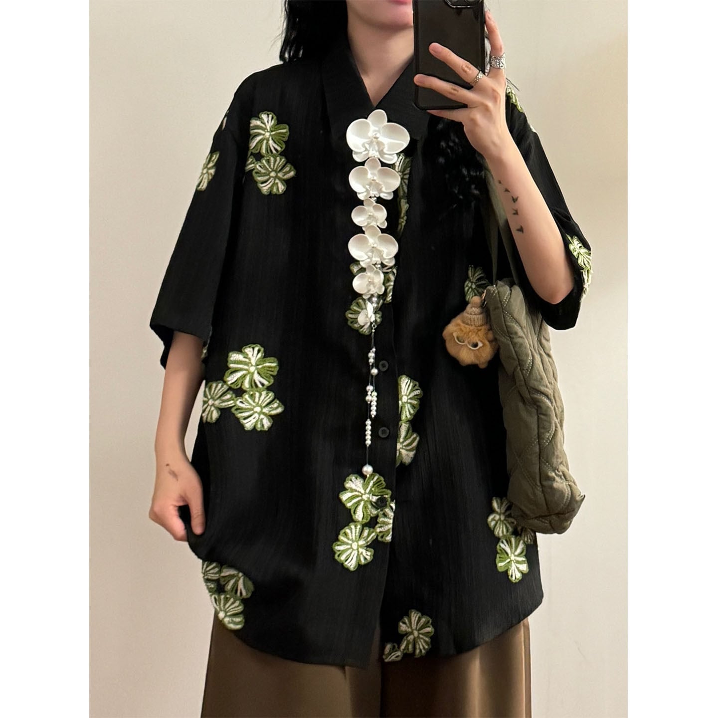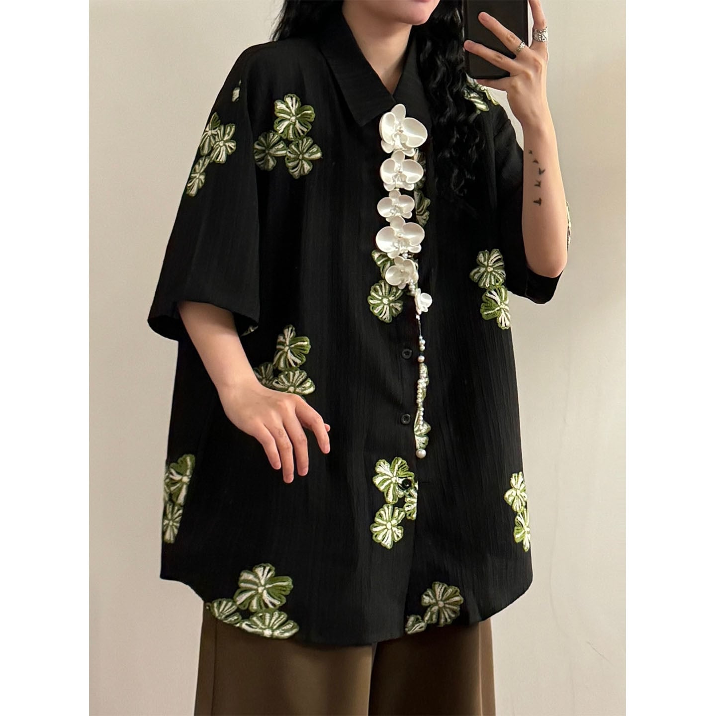 【UATONLINEシリーズ】★チャイナ風トップスシャツ★ 2color トップス 半袖シャツ ユニセックス 花柄 黒 青