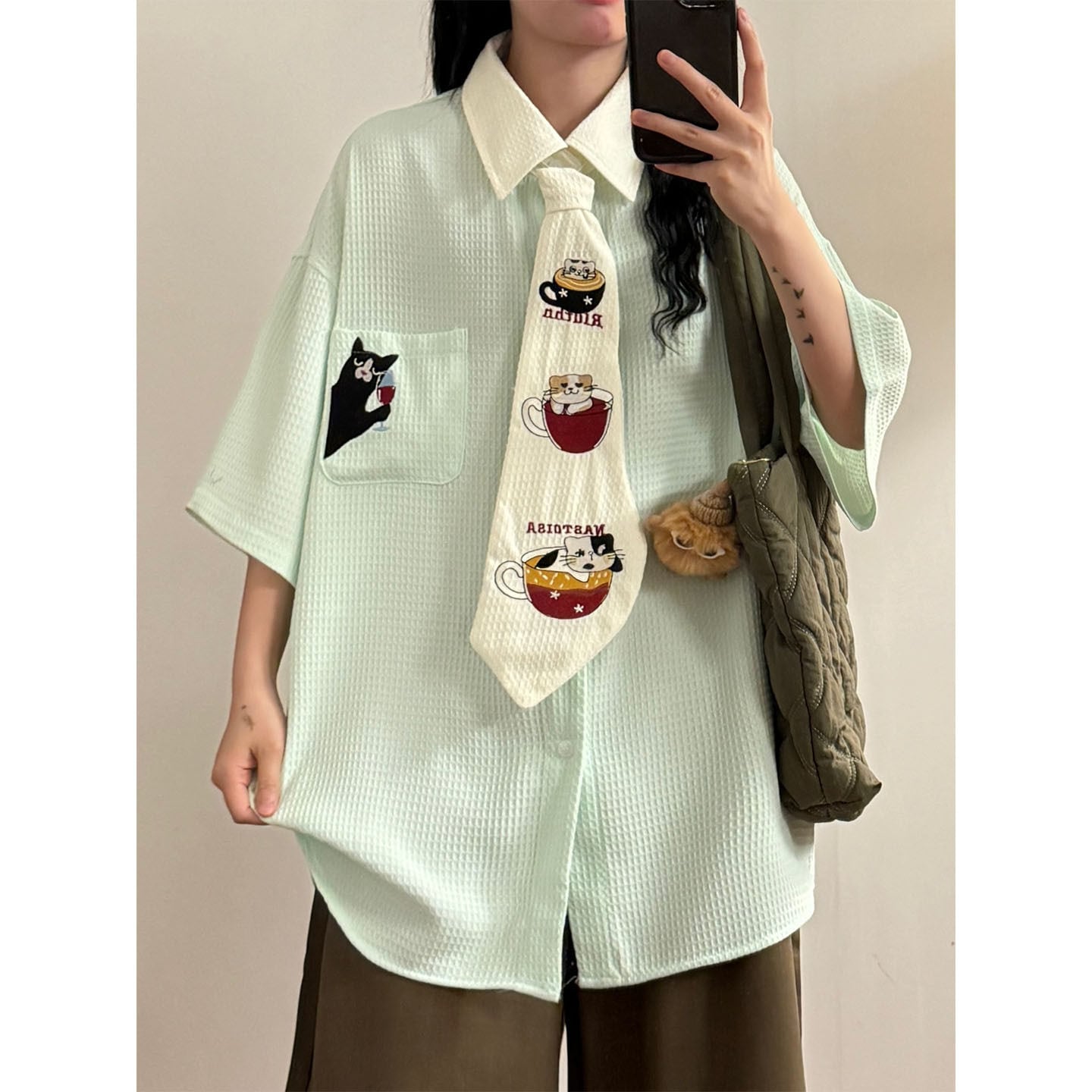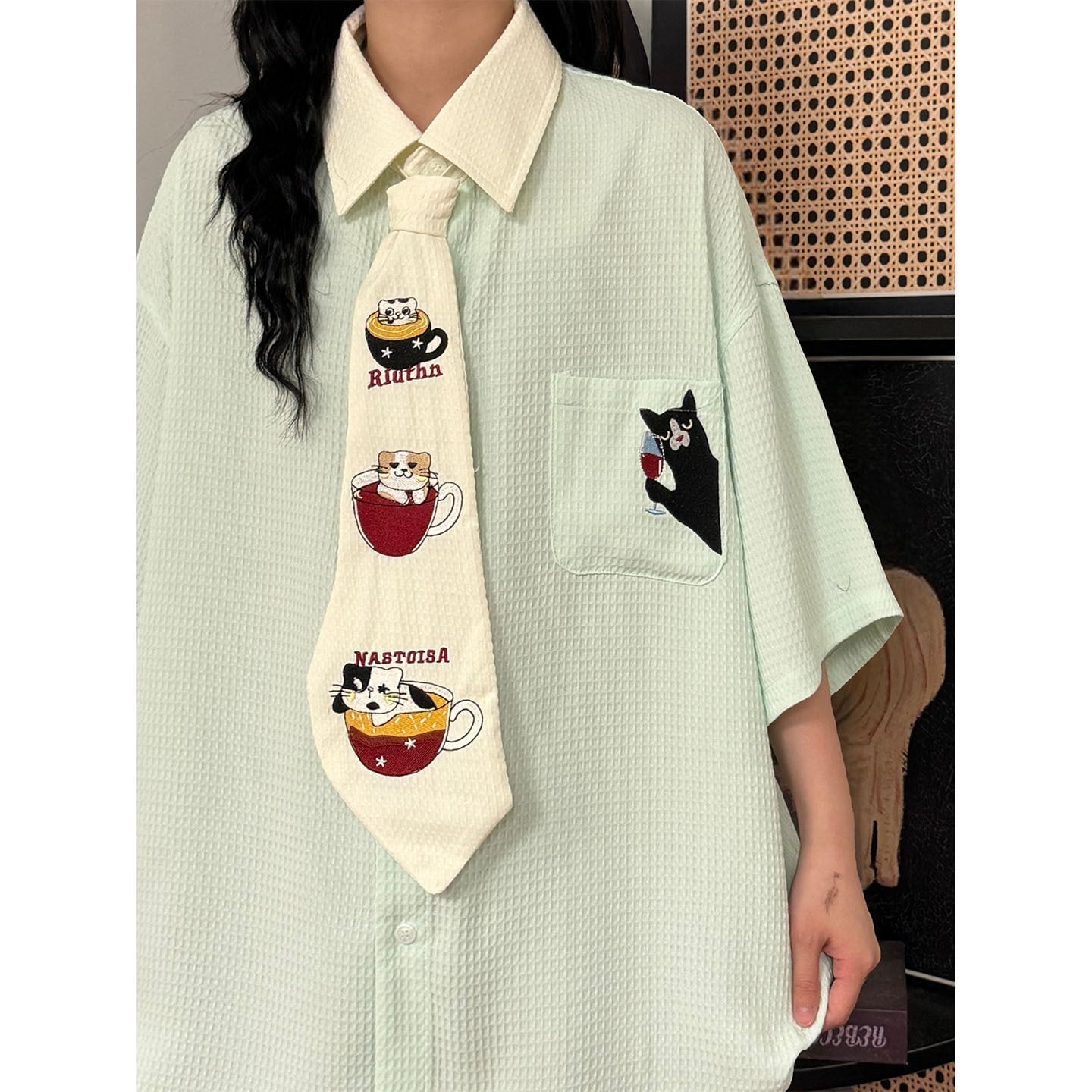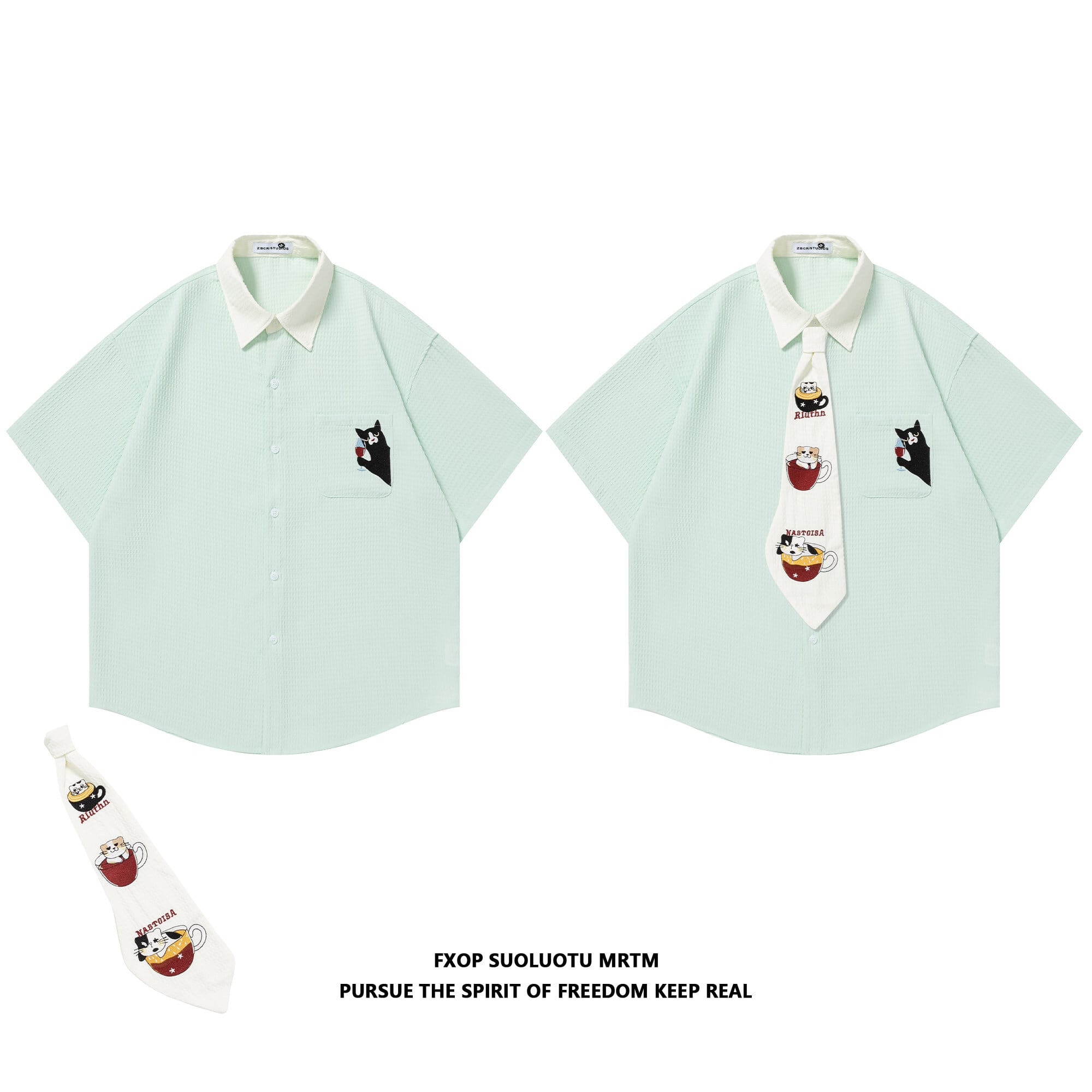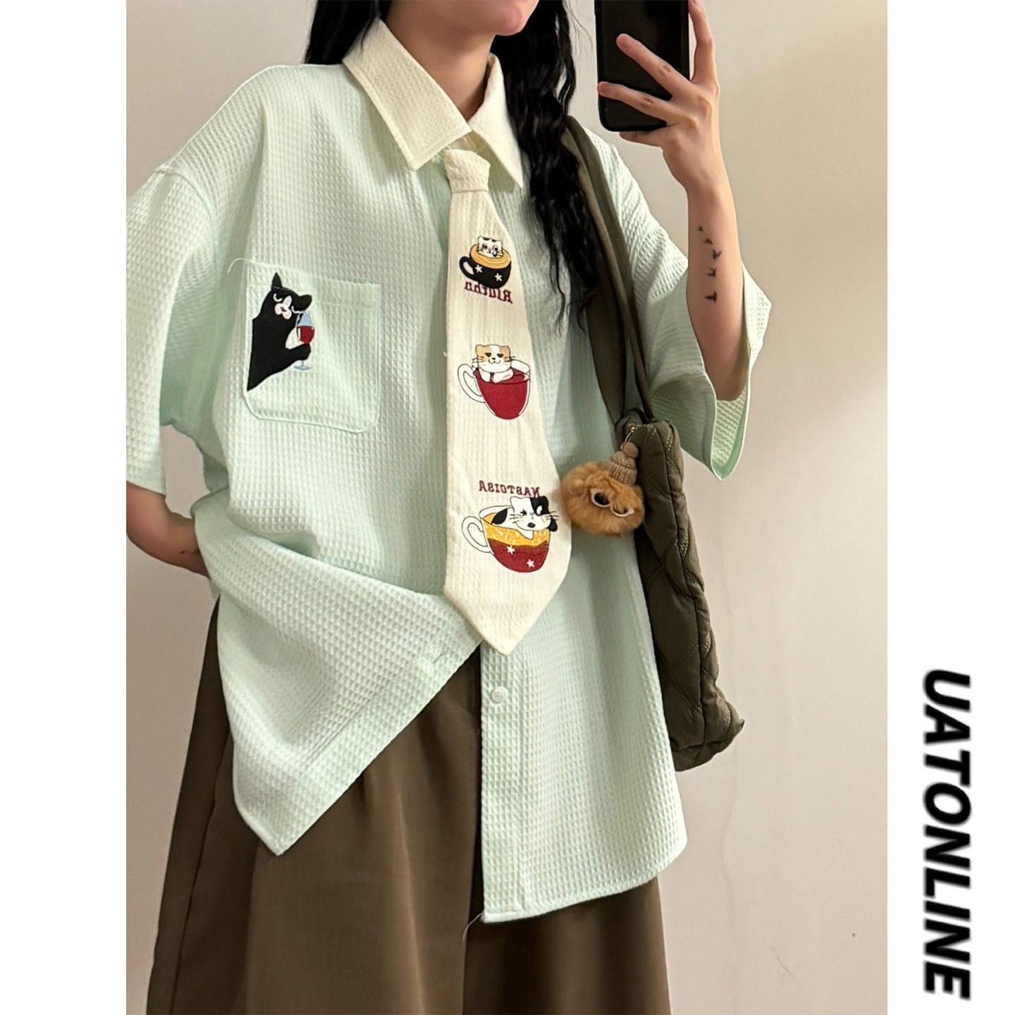 【UATONLINEシリーズ】★シャツ★ ネクタイ付き トップス 半袖シャツ ユニセックス 猫 猫柄 配色 グリーン 緑