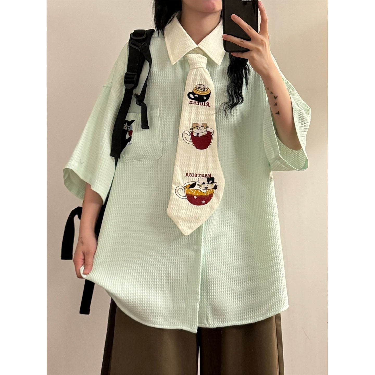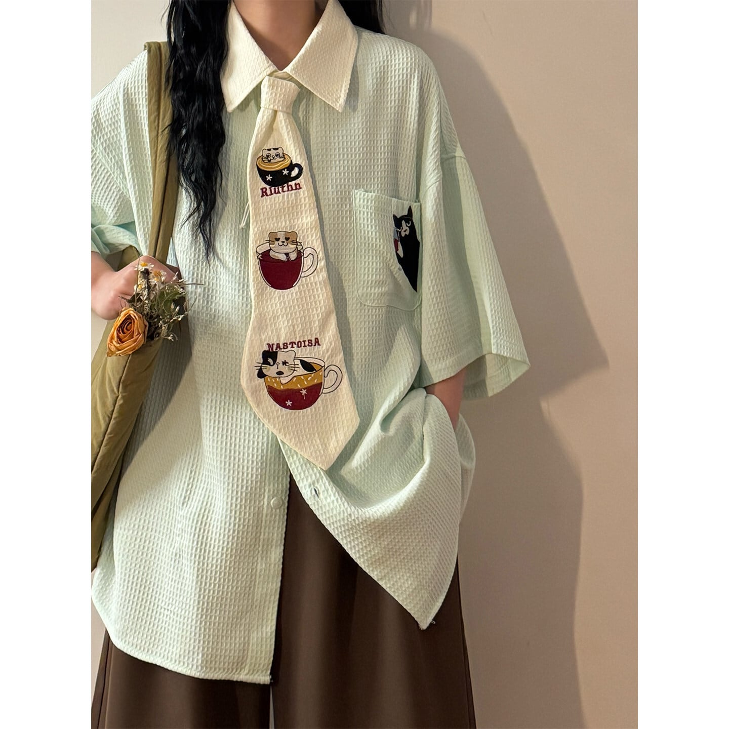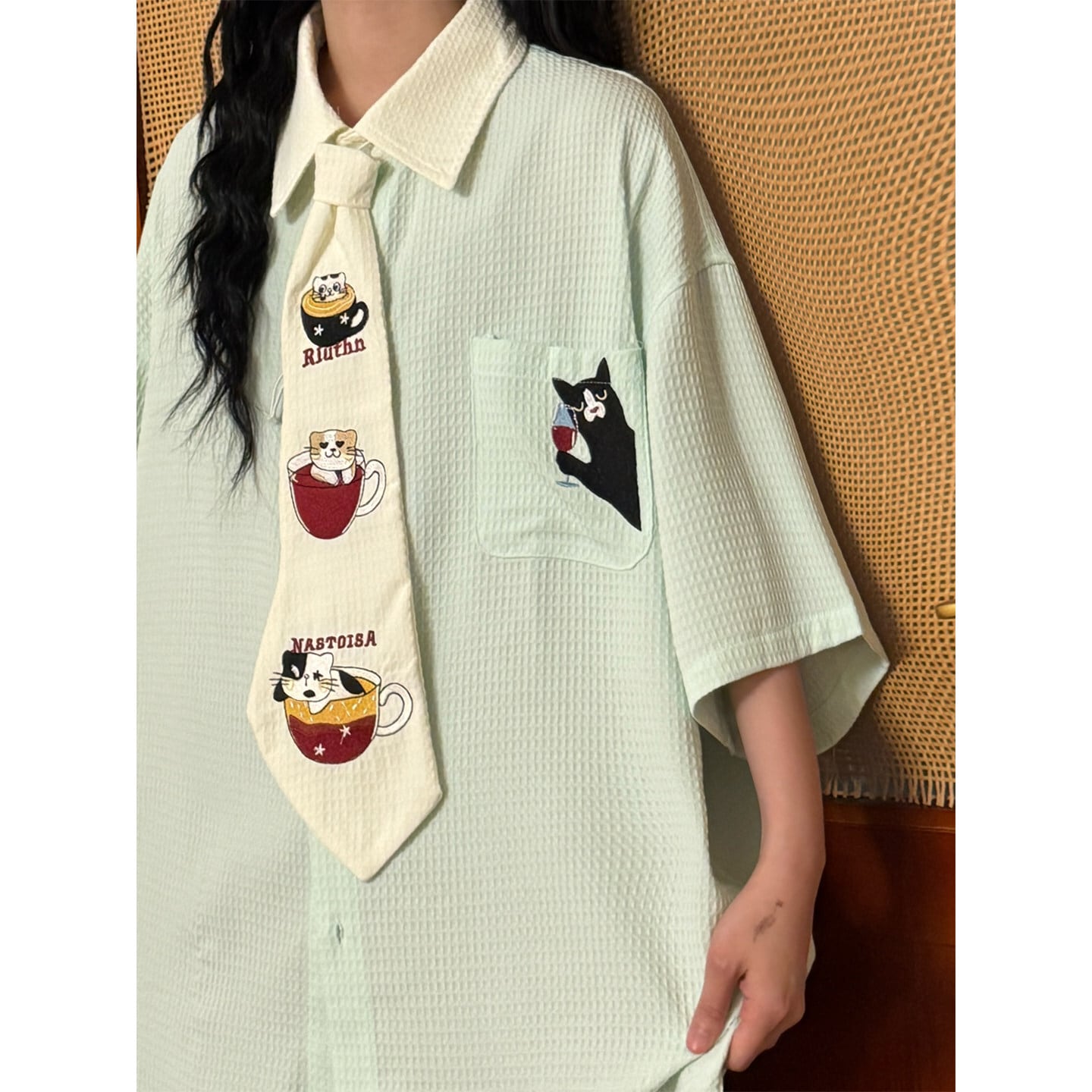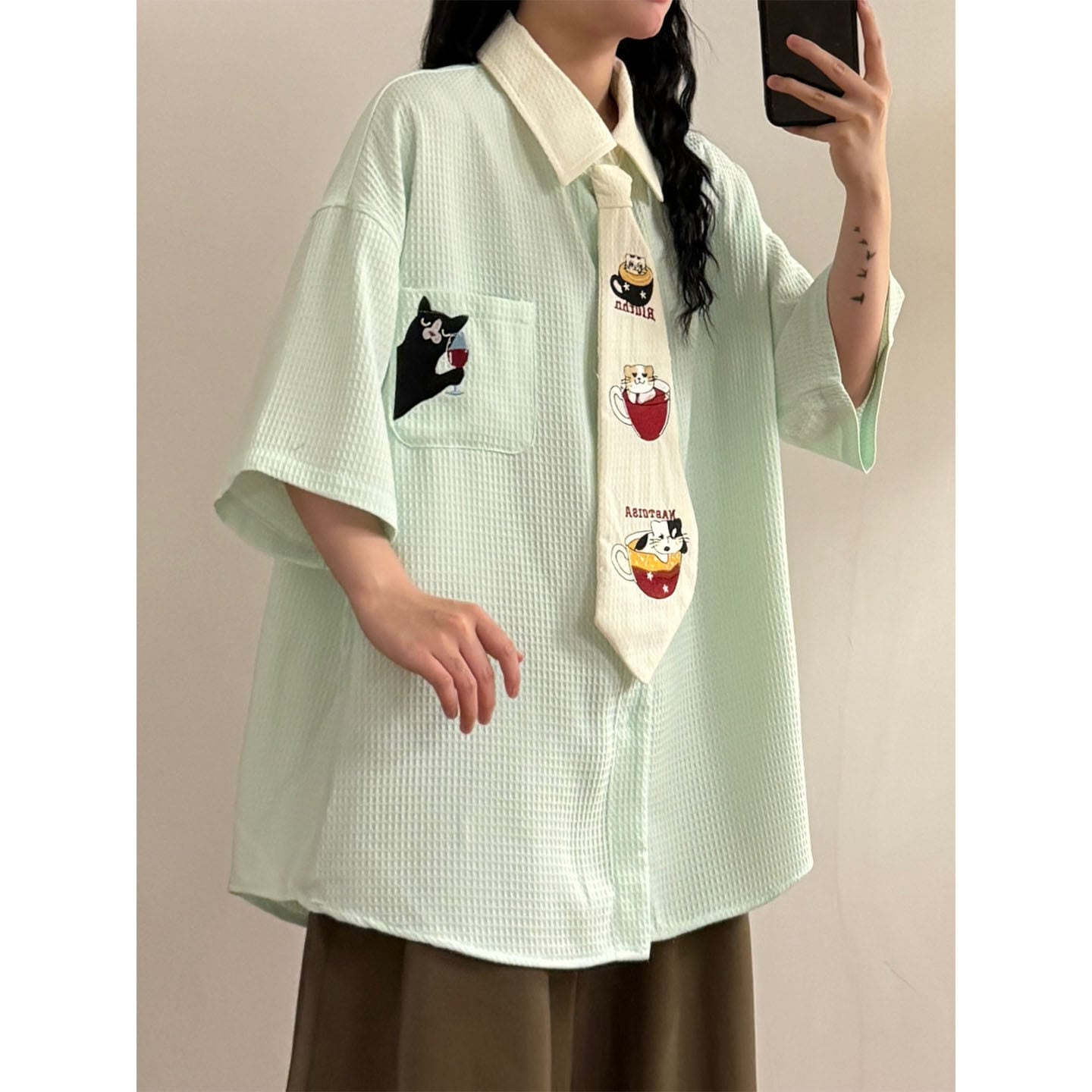 【UATONLINEシリーズ】★シャツ★ ネクタイ付き トップス 半袖シャツ ユニセックス 猫 猫柄 配色 グリーン 緑