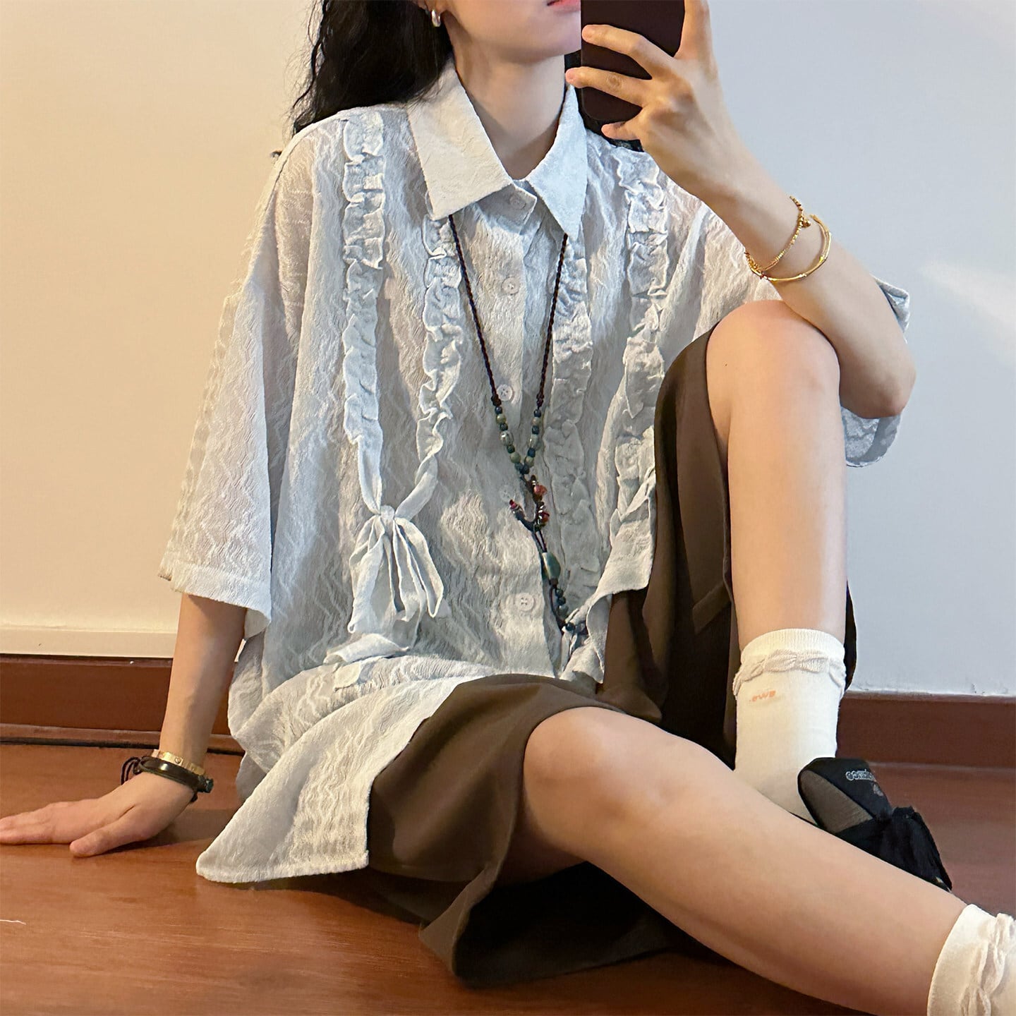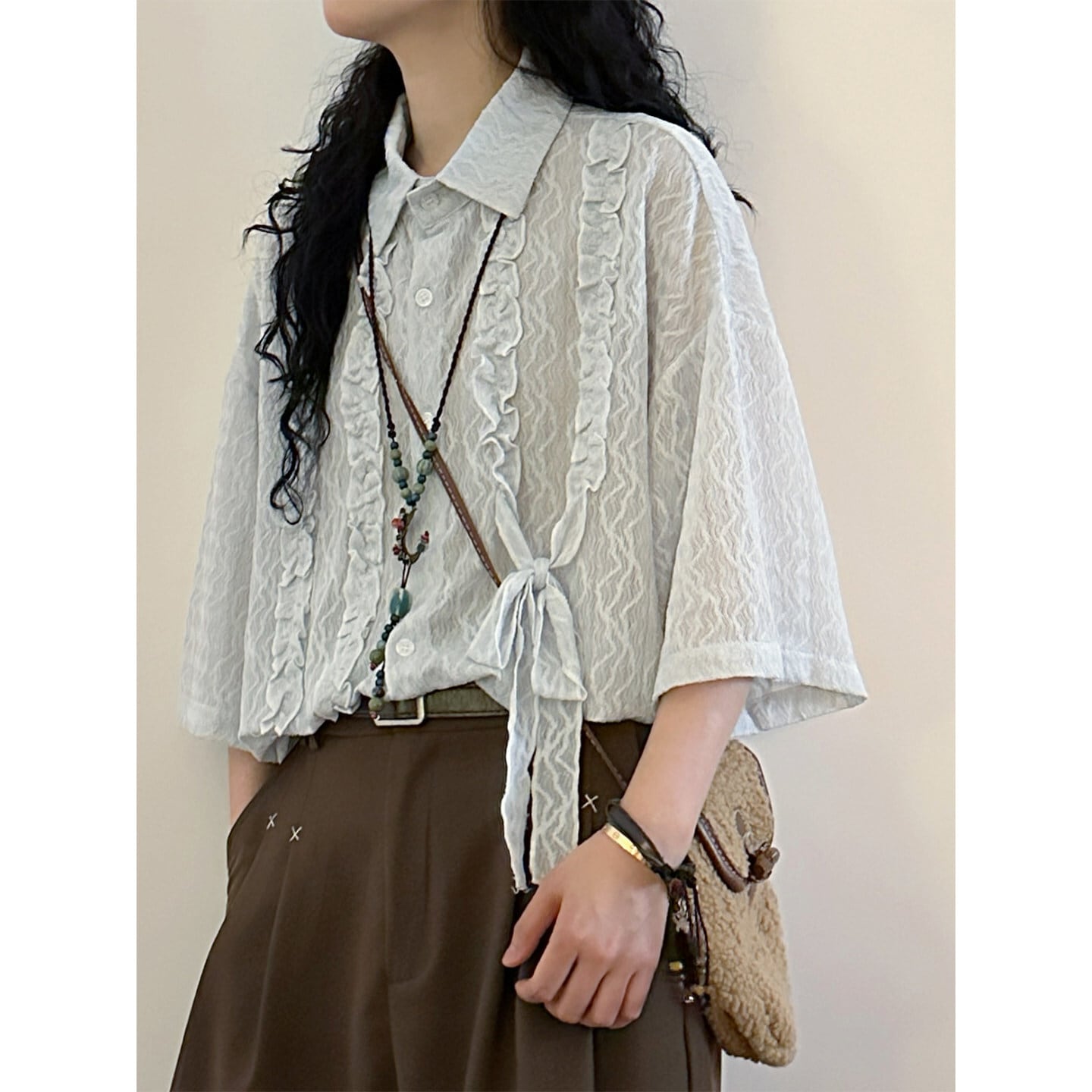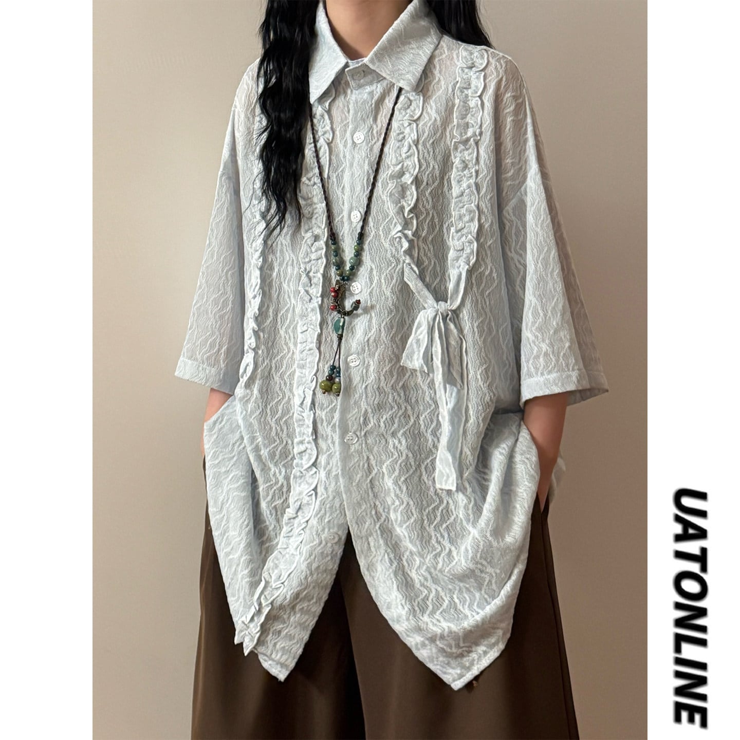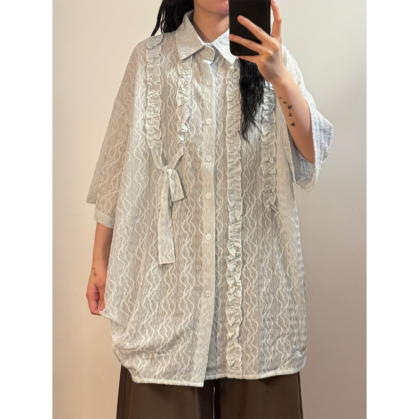 【UATONLINEシリーズ】★シャツ★ トップス 半袖シャツ ユニセックス 切り替え 可愛い ライトブルー 夏服