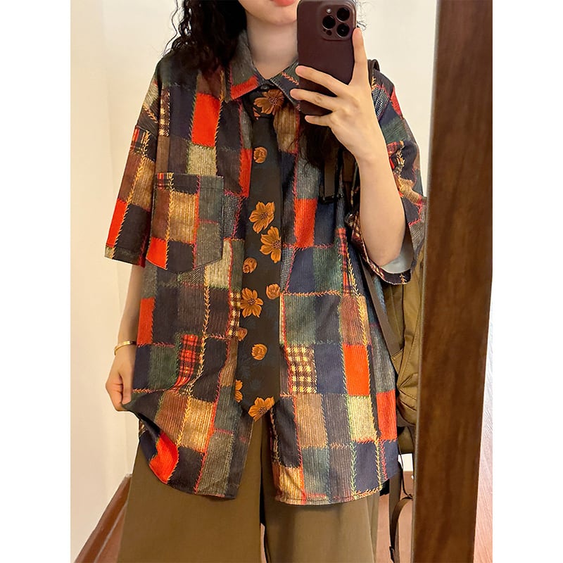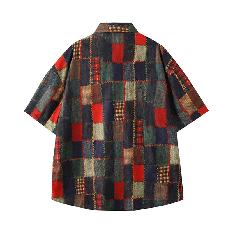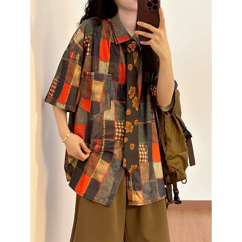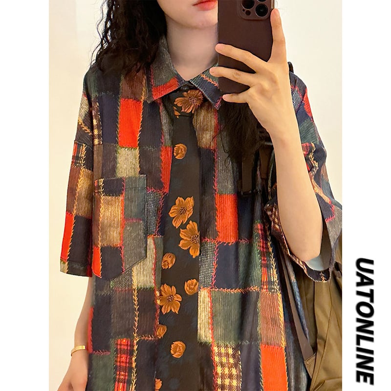 【UATONLINEシリーズ】★シャツ★ チェック柄 彩り トップス ネクタイ付きシャツ 半袖 男女兼用 メンズ