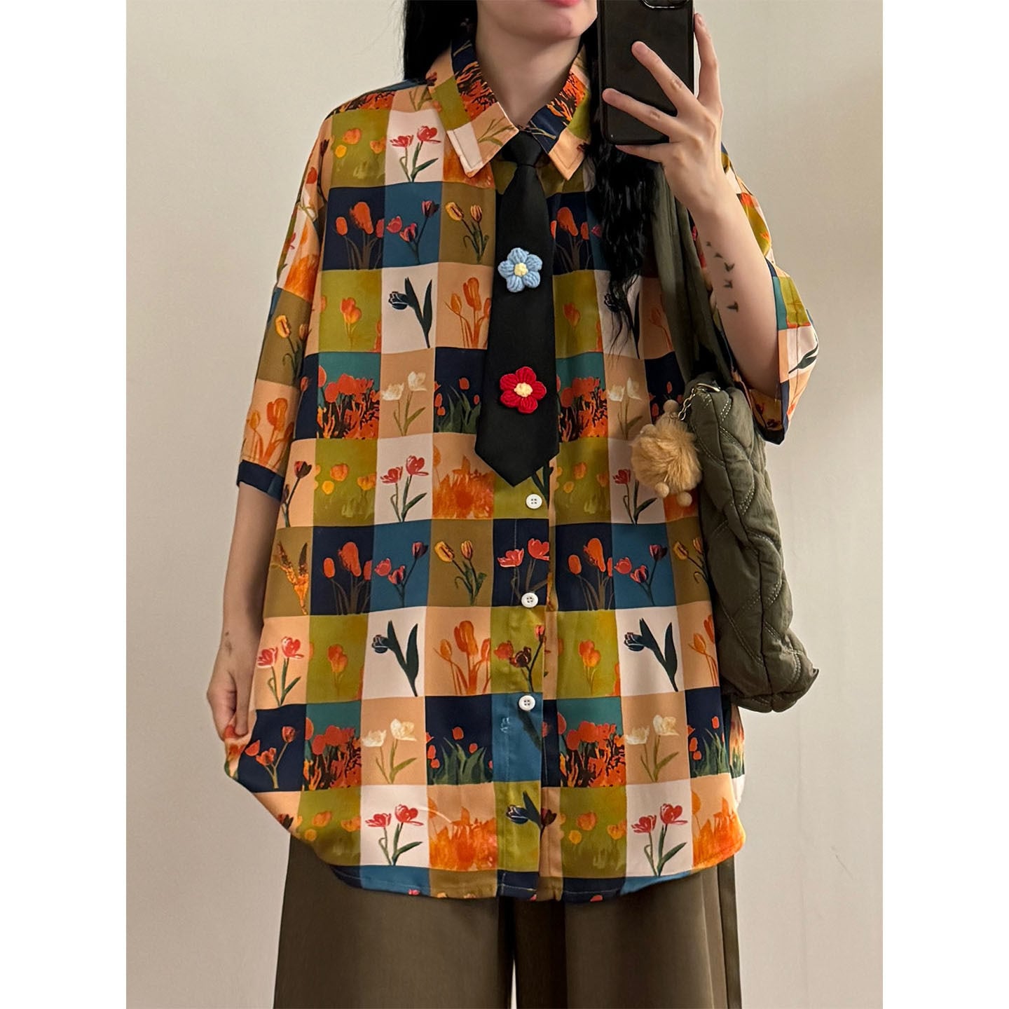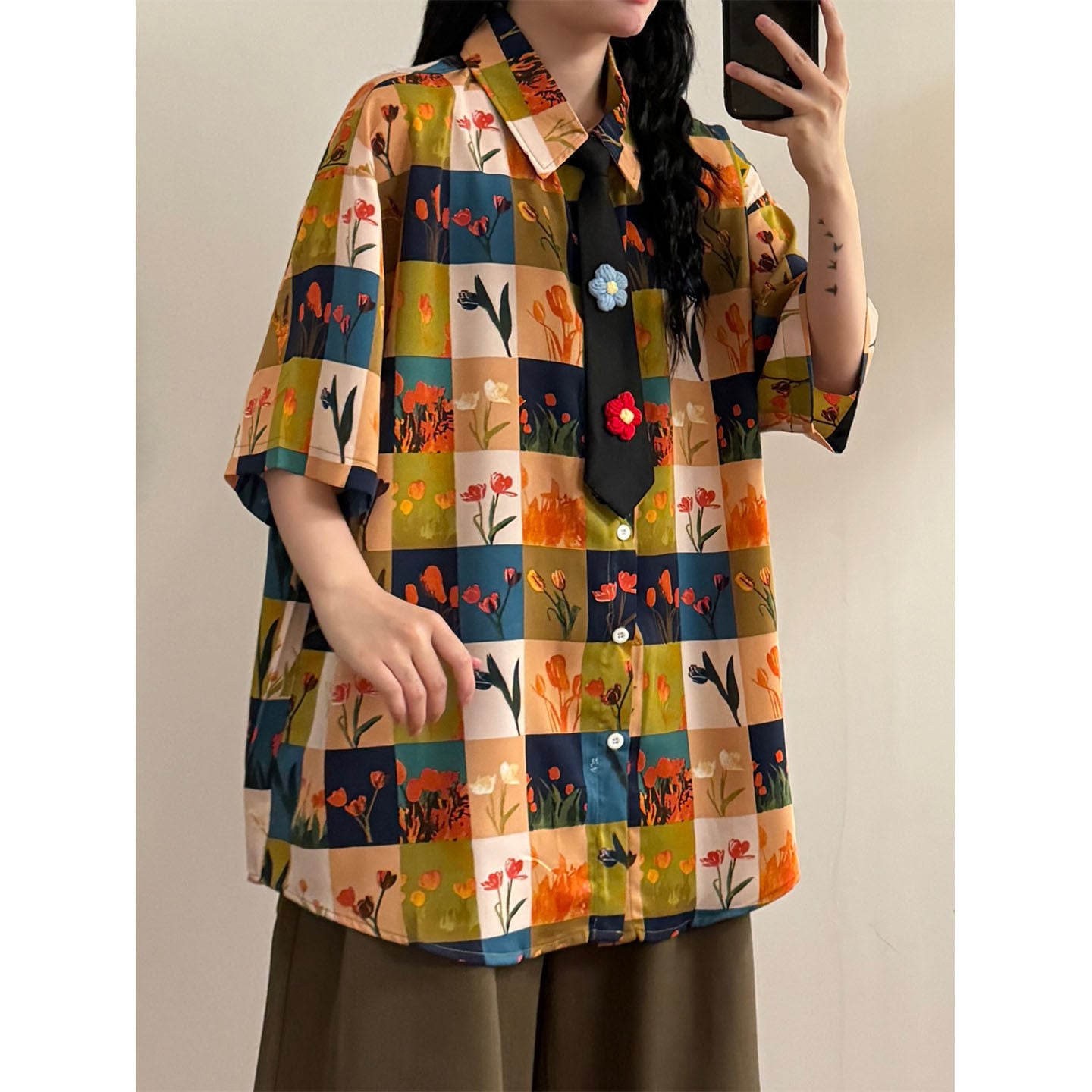 【UATONLINEシリーズ】★シャツ★ ネクタイ付き ユニセックス レトロ 半袖 花柄 チェック柄 彩り 可愛い