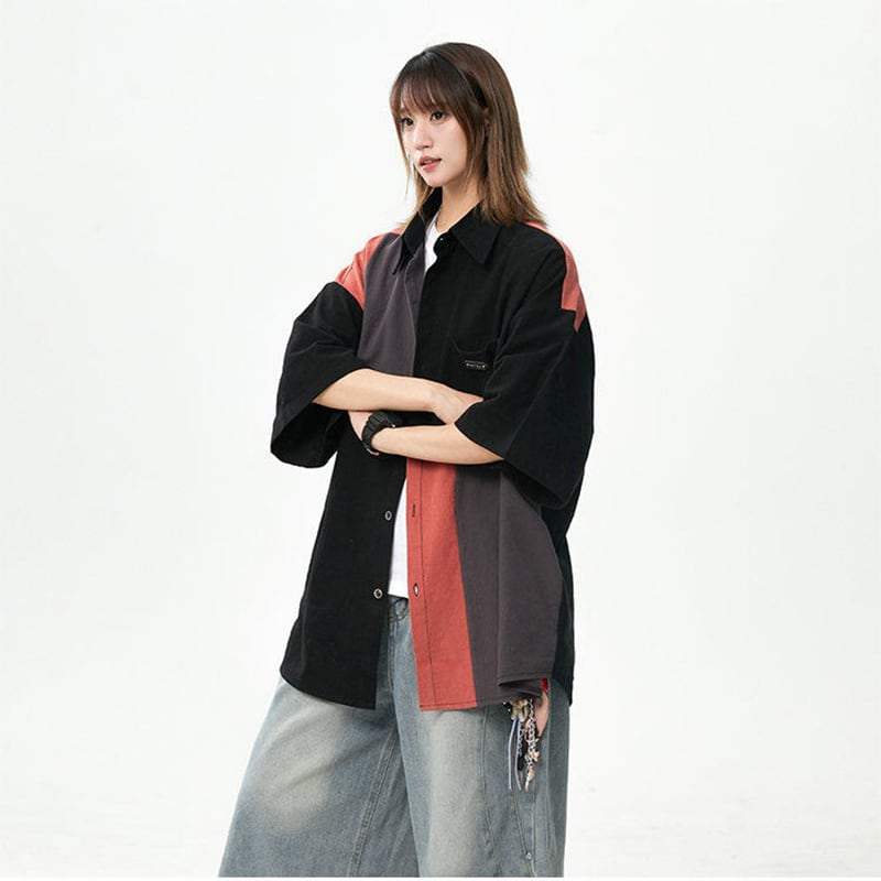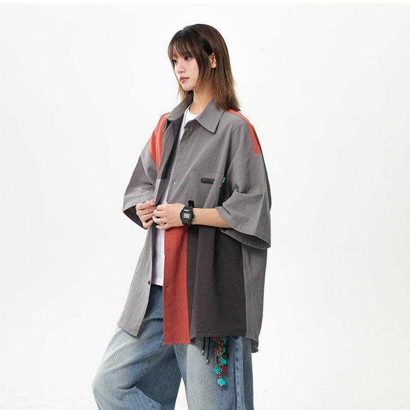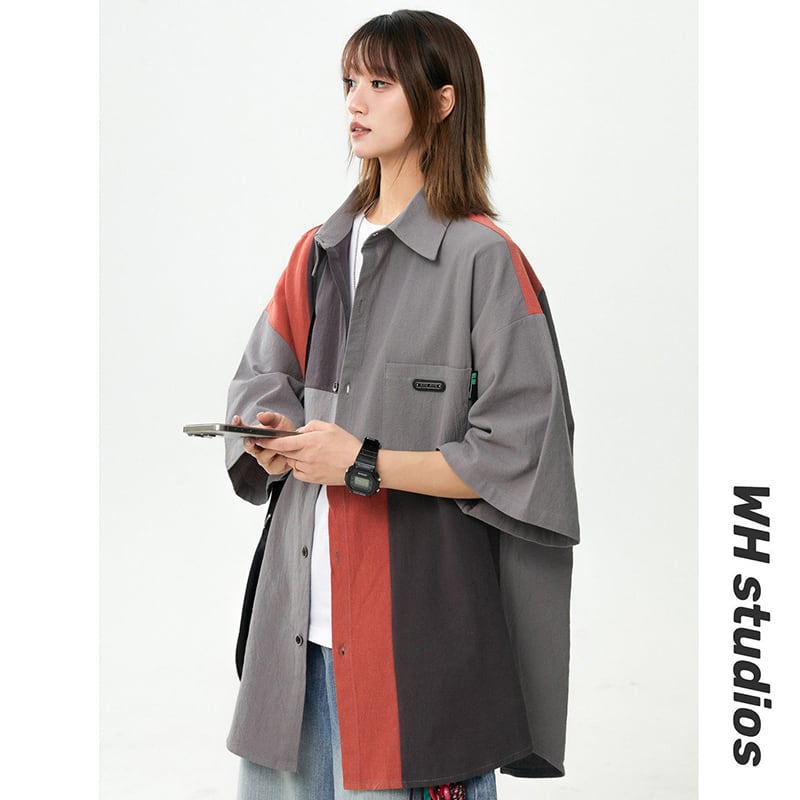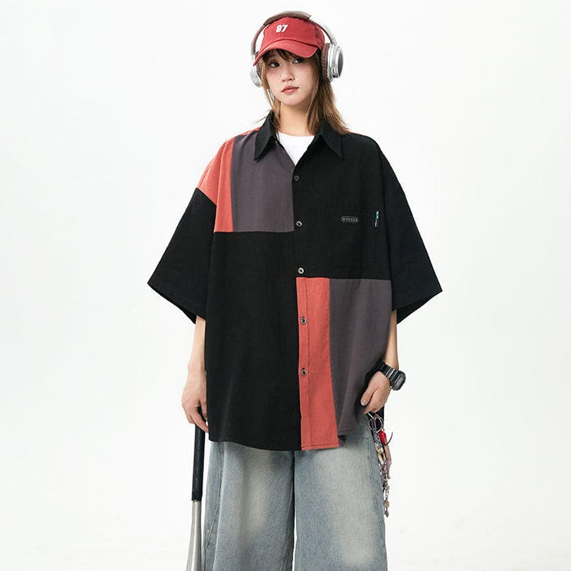 【藤伊曼シリーズ】★シャツ★ 2color トップス 半袖 ユニセックス メンズ 切り替え 配色 カジュアル 黒 灰