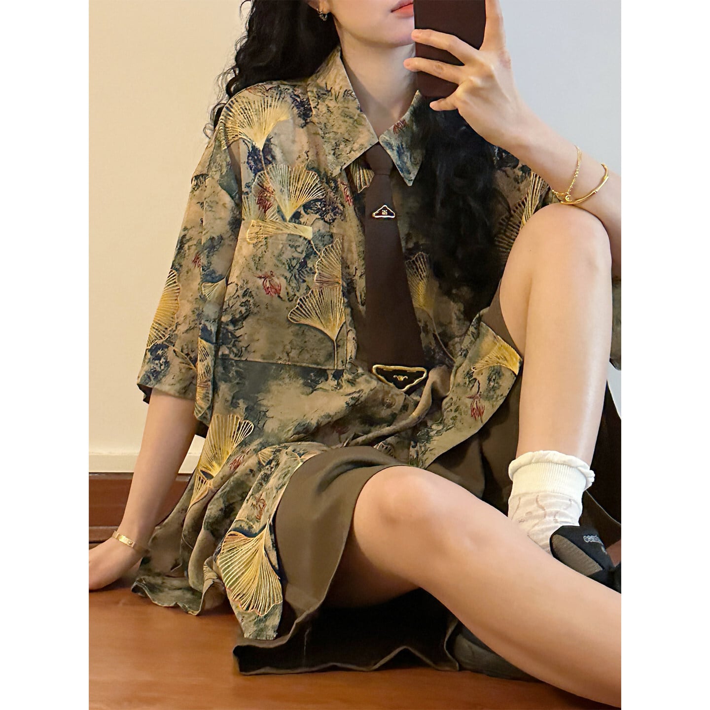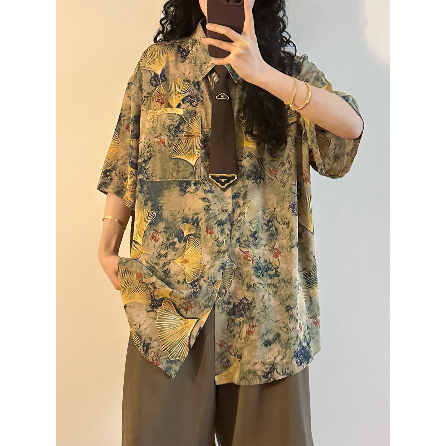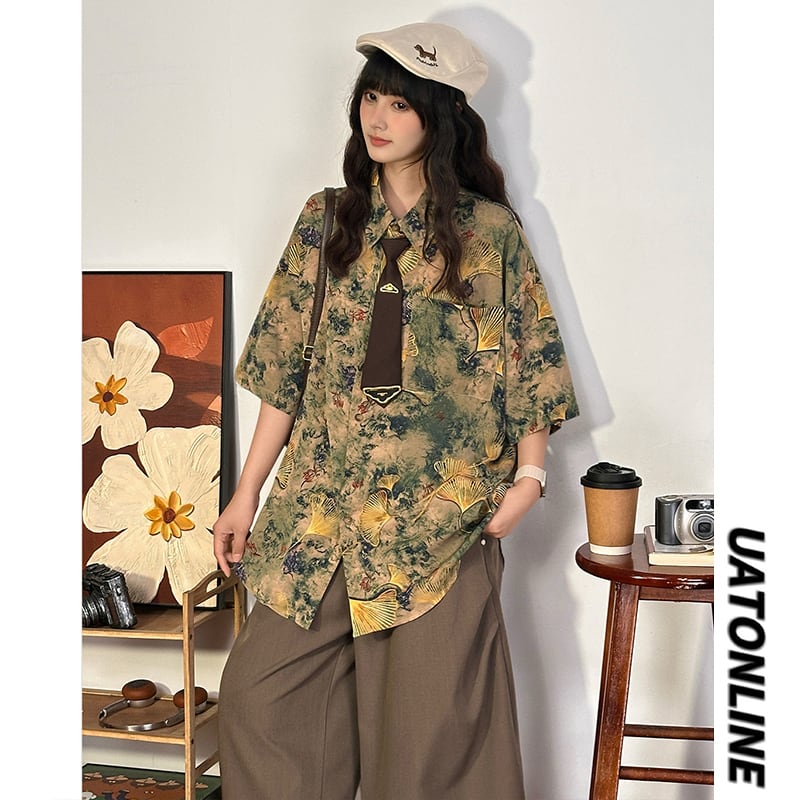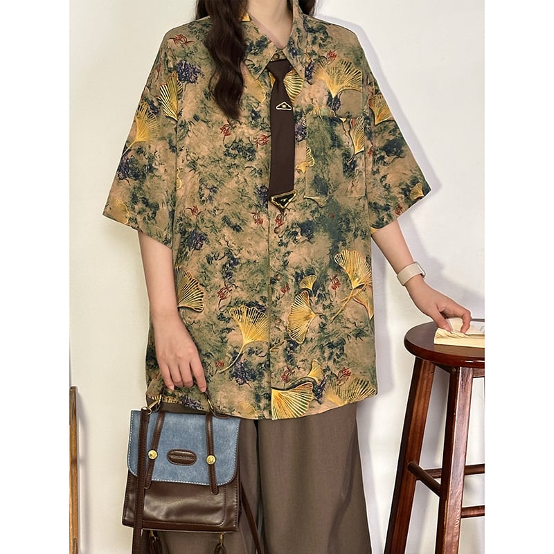 【UATONLINEシリーズ】★チャイナ風トップス★ シャツ ユニセックス レトロ 半袖 花柄 彩り ネクタイ付き プリント 夏服 可愛い