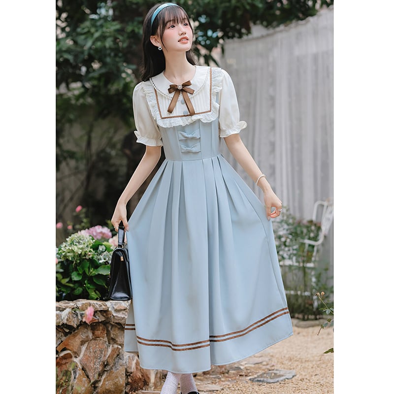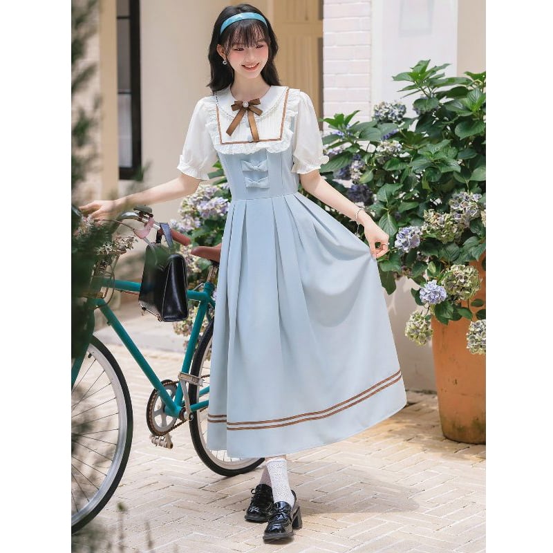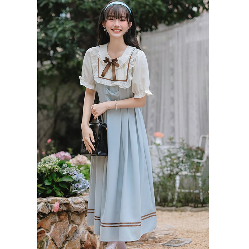 ♥森ガール&アカデミック!【茶味少女シリーズ】★ワンピース★ レディース 切り替え 可愛い リボン 可愛い ブルー 青い 半袖