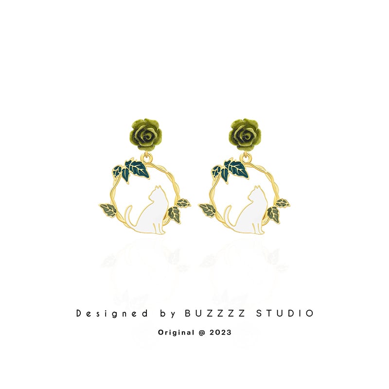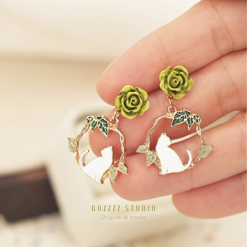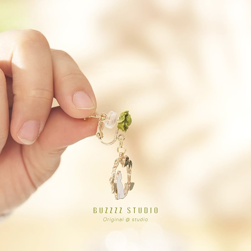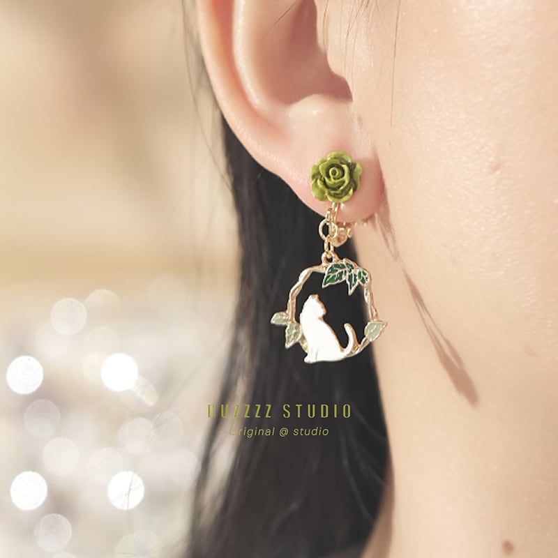 【BUZZZZシリーズ】★耳飾り★ ピアスorイヤリング ペア 小物 アクセサリー レディース 猫 花柄 グリーン 緑