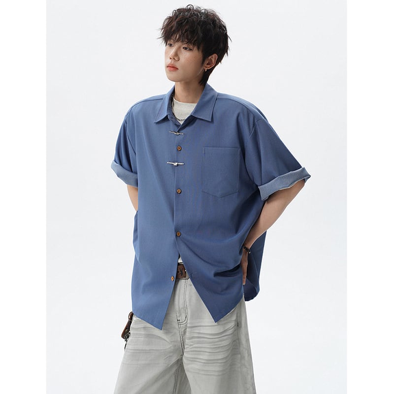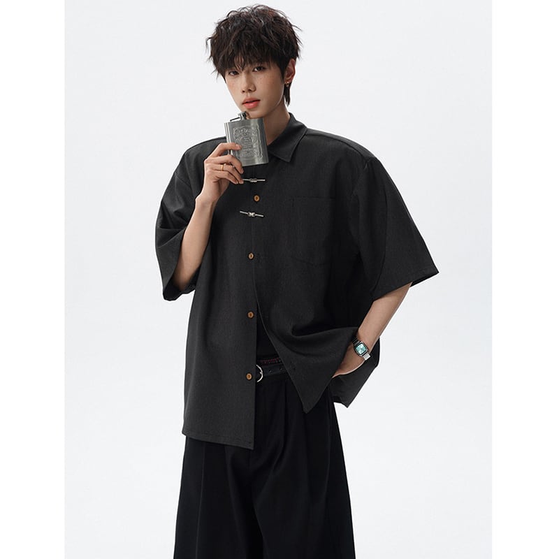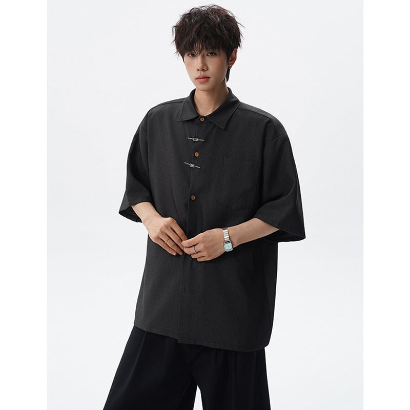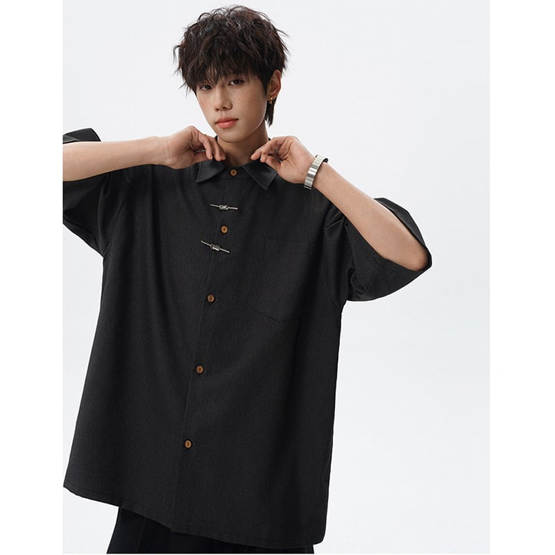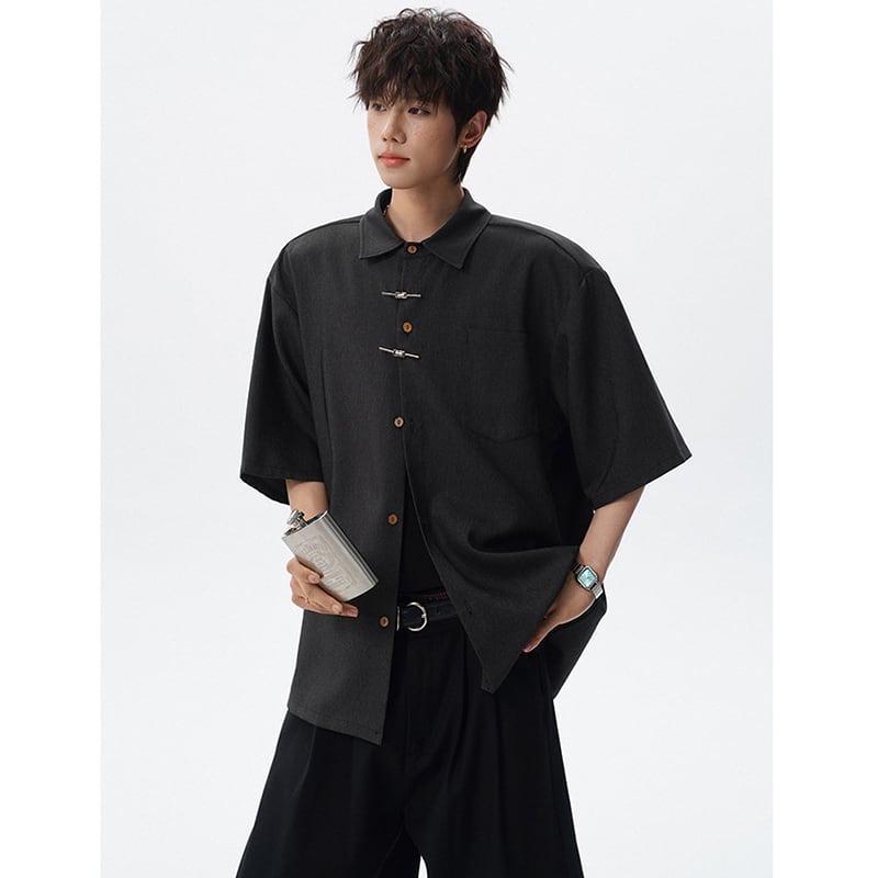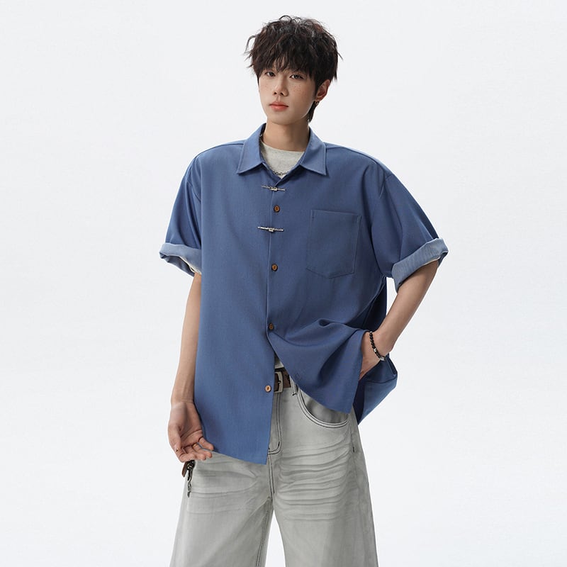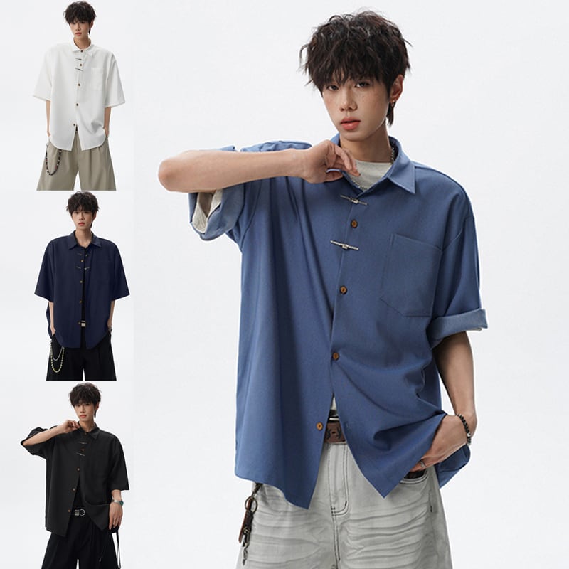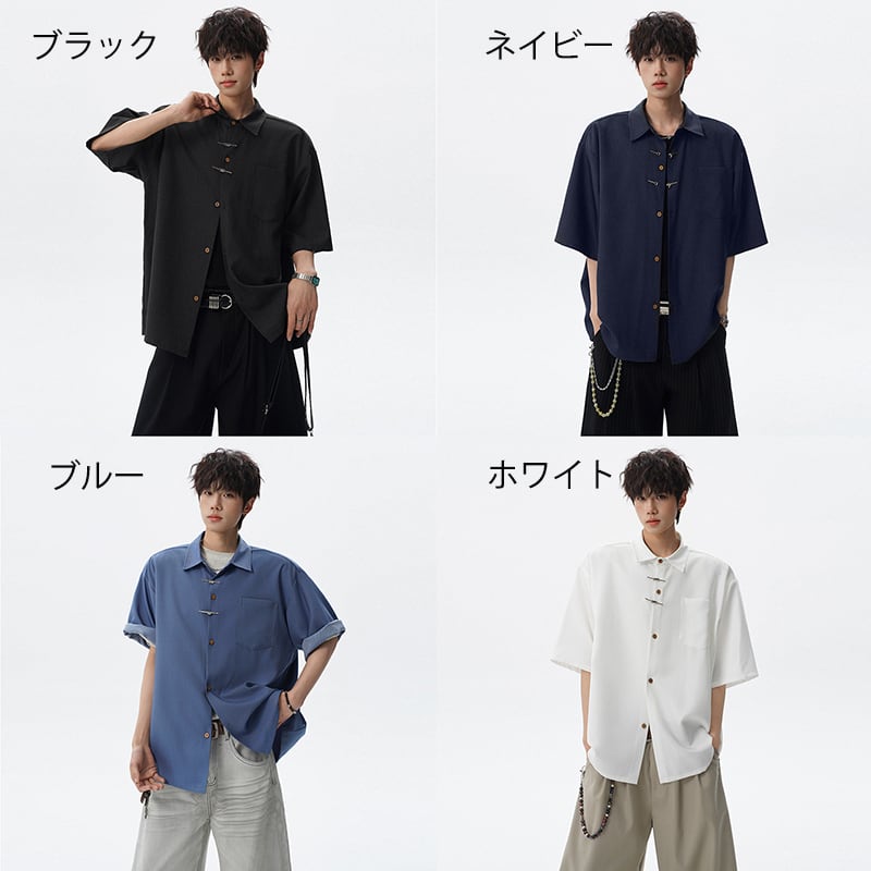 【JXシリーズ】★チャイナ風トップス★ 4color トップス 半袖 シャツ ユニセックス メンズ 金属ボタン 夏服 青 黒 白