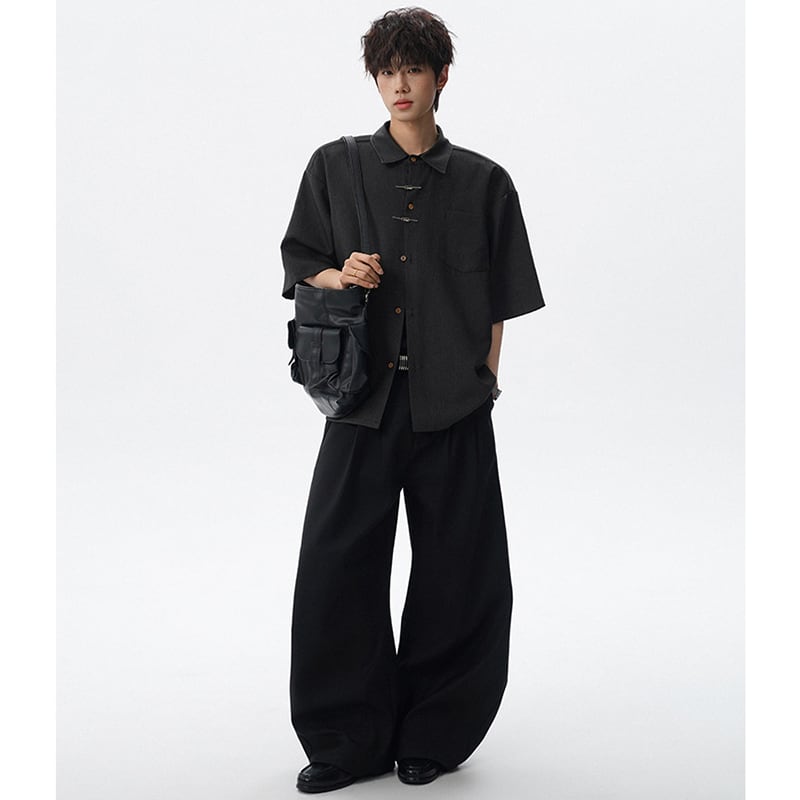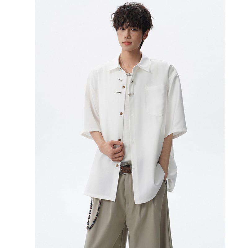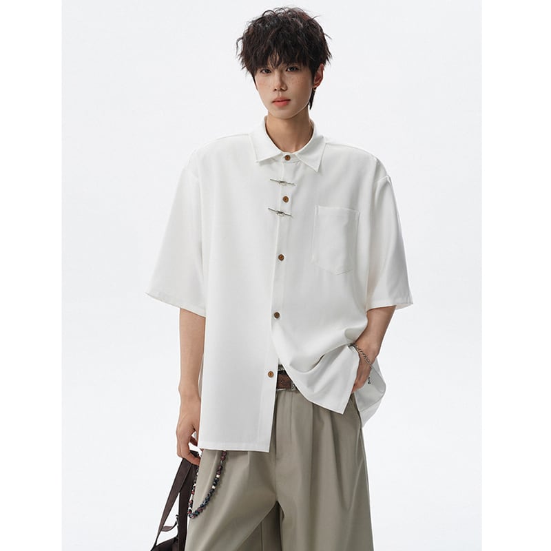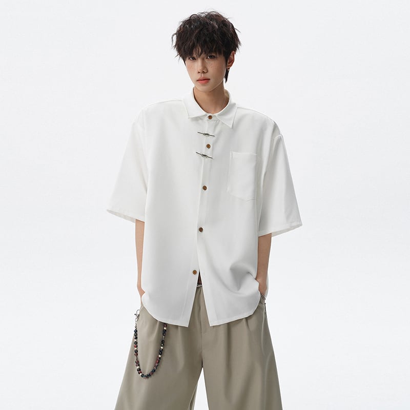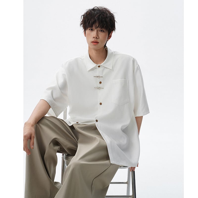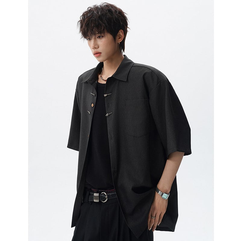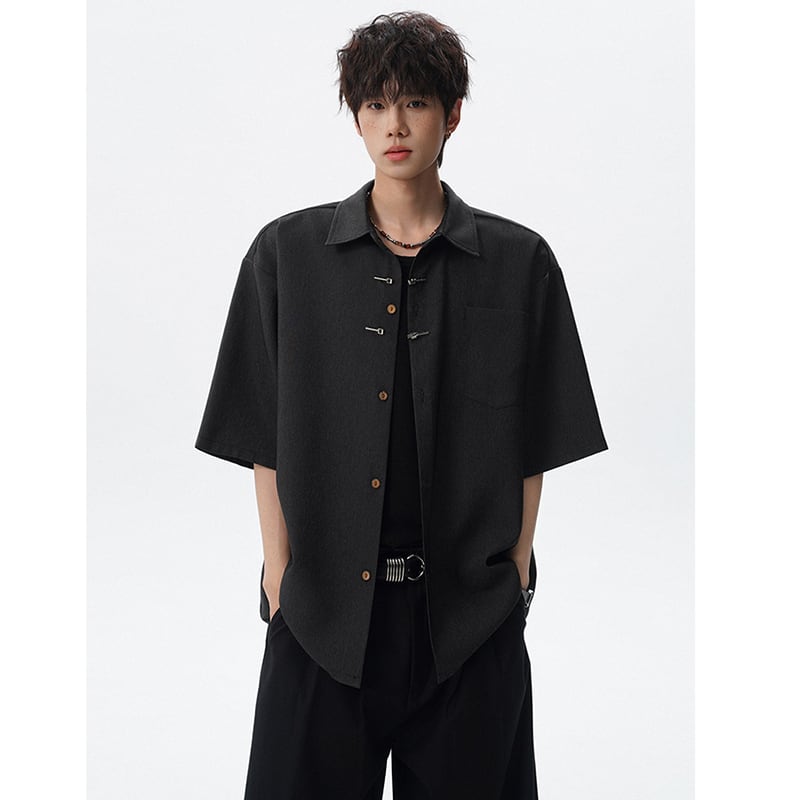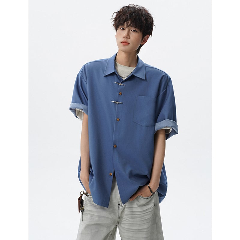 【JXシリーズ】★チャイナ風トップス★ 4color トップス 半袖 シャツ ユニセックス メンズ 金属ボタン 夏服 青 黒 白