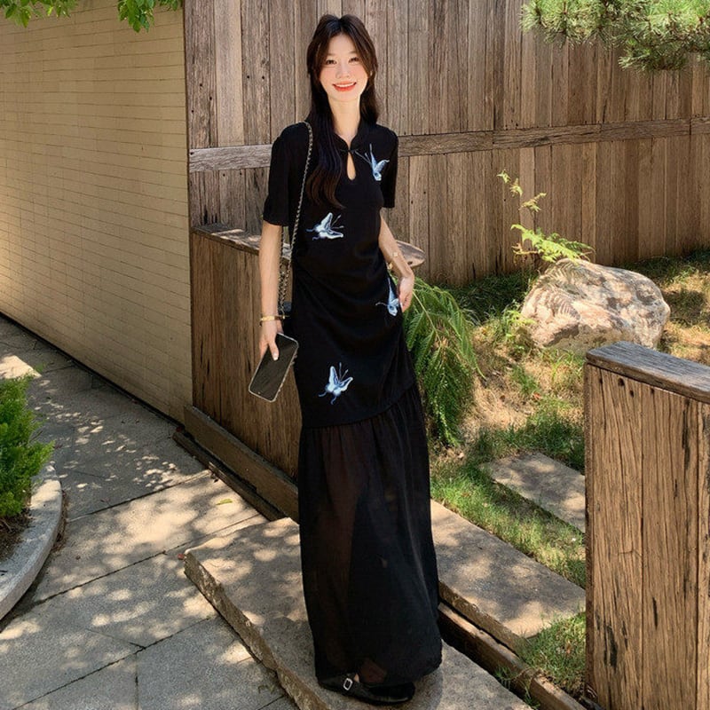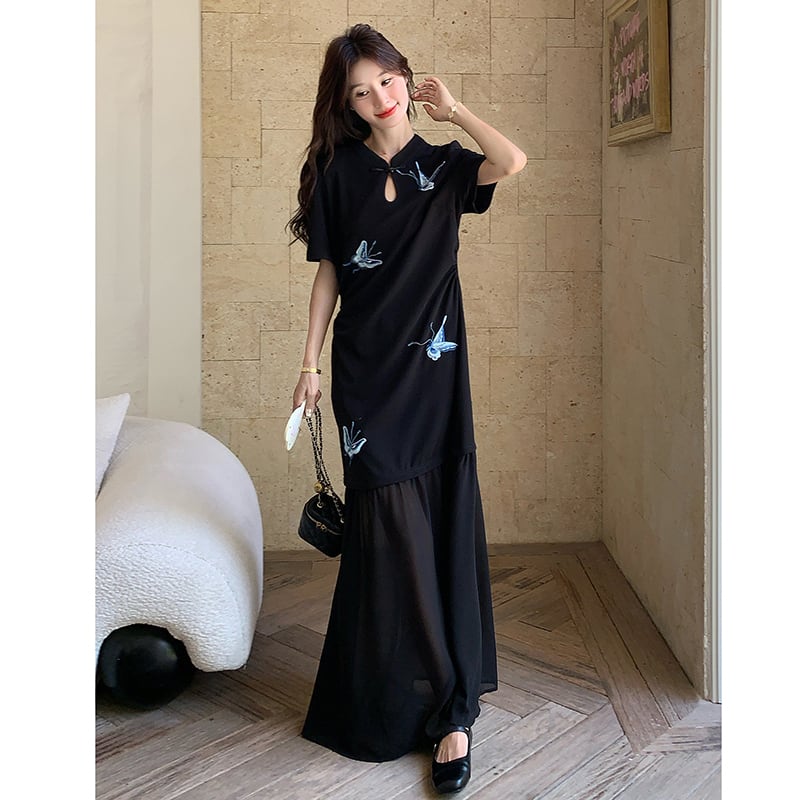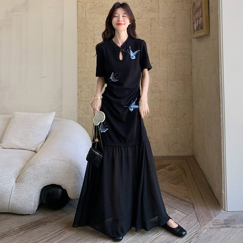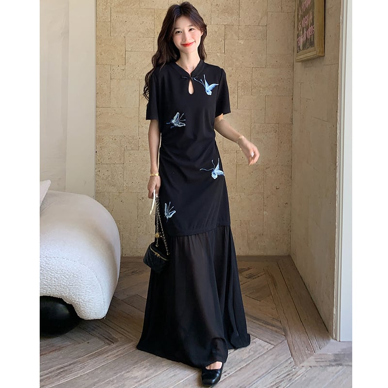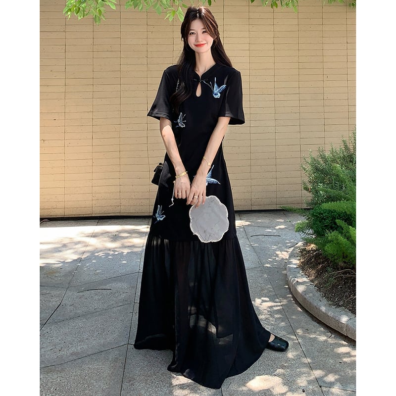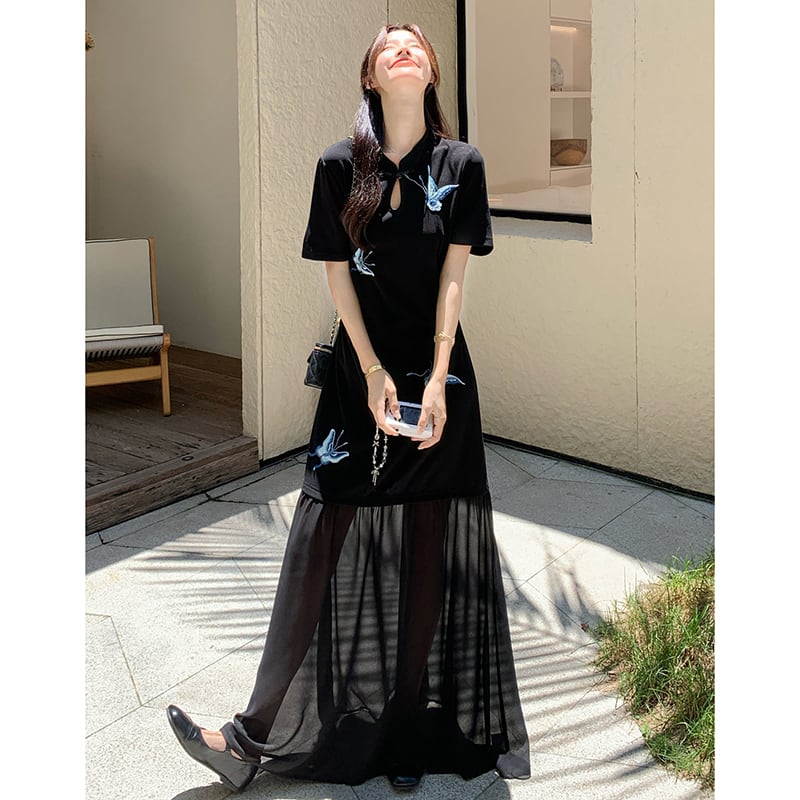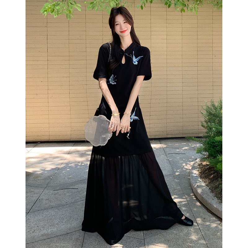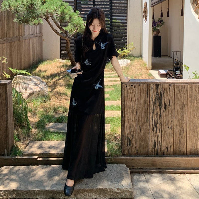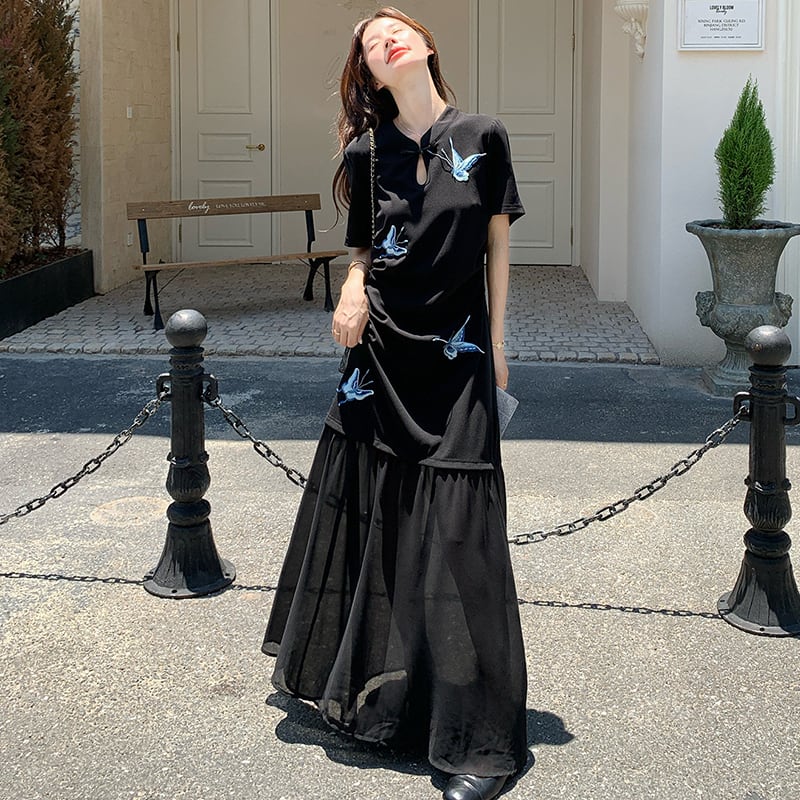 【MOBAIシリーズ】★チャイナ風ワンピース★ 改良型チャイナドレス 半袖 着痩せ ロング丈 蝶々柄 ブラック 黒い