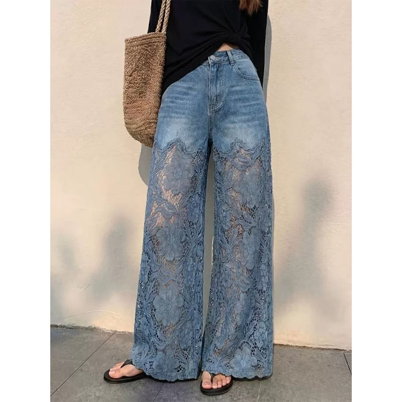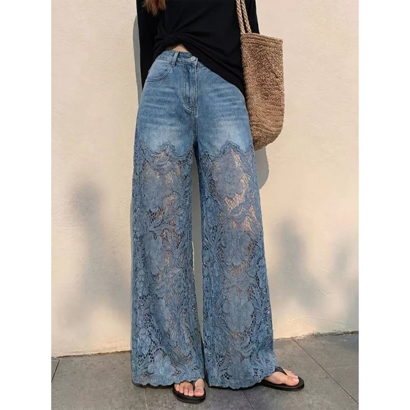 【TYWシリーズ】★ズボン★ デニムズボン ボトムス レディース カジュアルパンツ 花柄 ブルー 青い