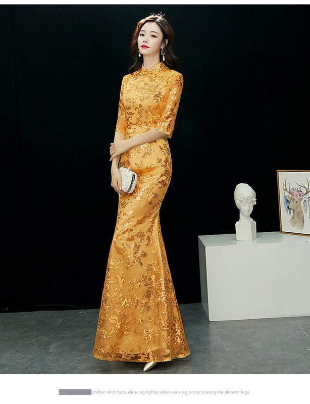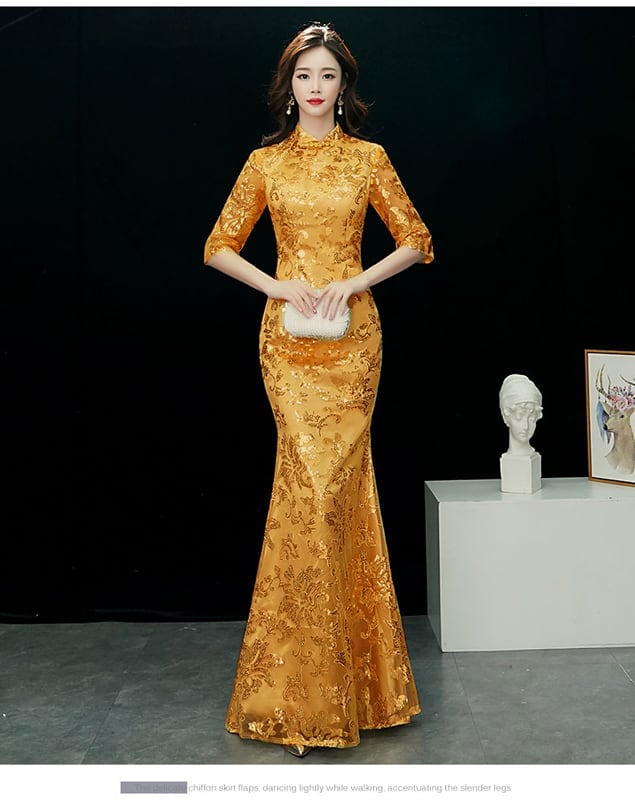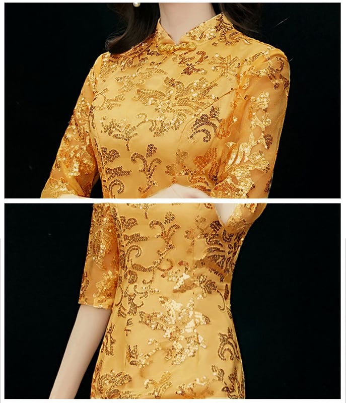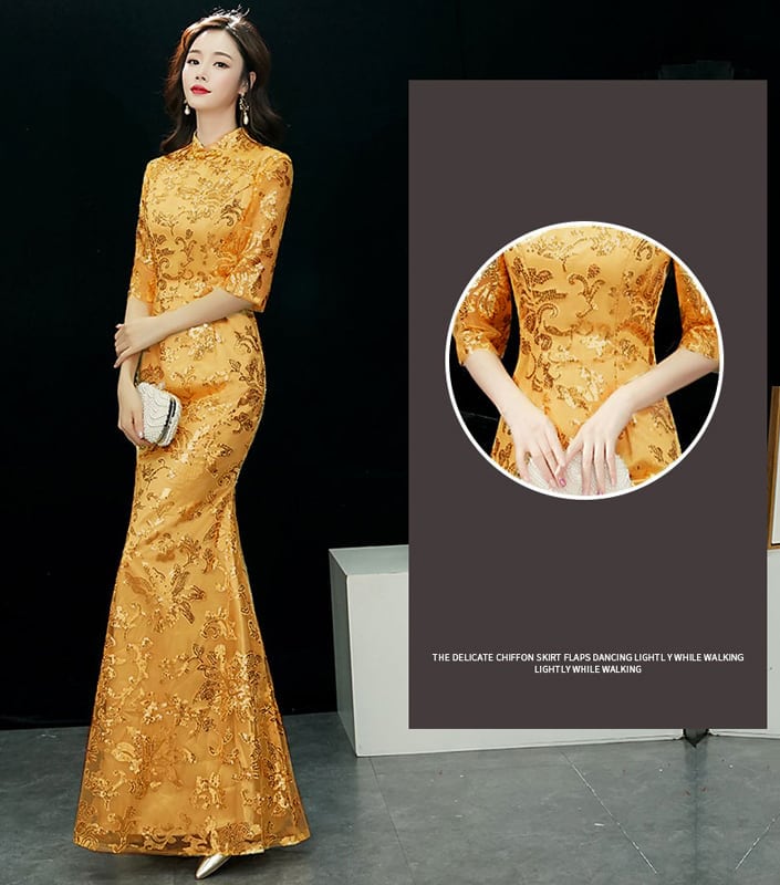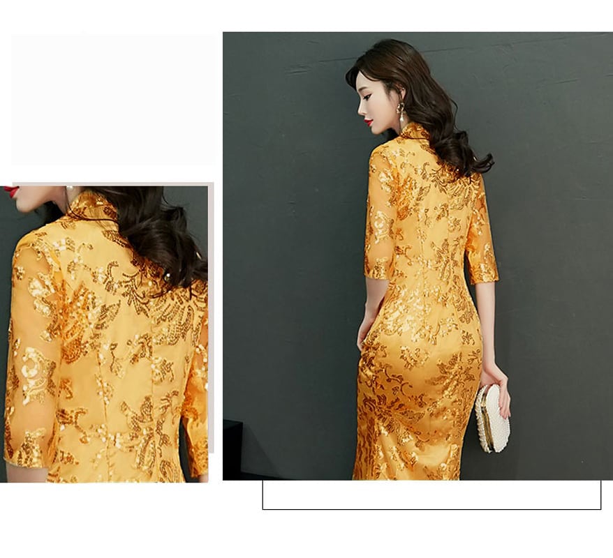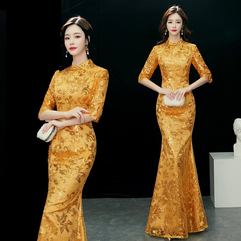 【ELEGANT】チャイナドレス マーメイドライン スパンコール ドレス ロング丈 イエロー 黄色い 大きいサイズ S M L LL 3L 4L 着痩せ 魅力的な姿になろう 細見効果抜群