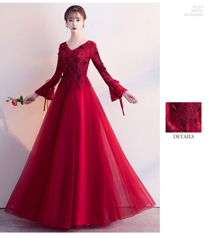 【唐装・漢服・秀禾服】中華服 ワンピース 結婚式 演出服 スピーカースリーブ 撮影服 刺繍入り 舞台 イベント チャイナ服 ワインレッド 長袖 Vネック 大きいサイズ S M L LL 3L