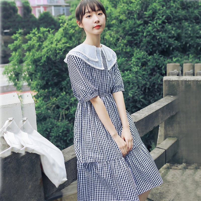 ワンピース ドレス カジュアルワンピース レディースファション シンプル 可愛い 着痩せ 折り襟 五分袖 ロング丈 チェック柄 S M L LL ブラック アプリコット