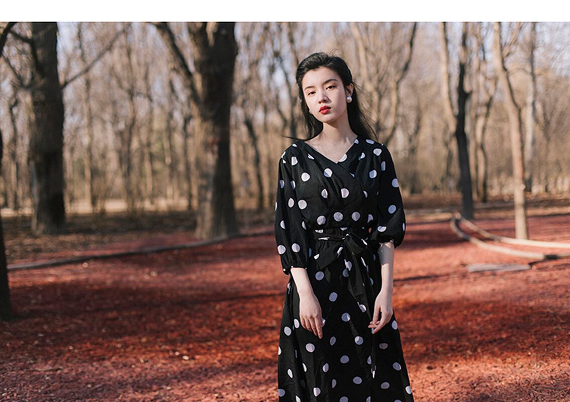 ワンピース ドレス レディースファション Vネック 七分袖 ロング丈 レトロ エレガント ドット柄 S M L 文芸的 ハイウエスト スリム セレブ気質 ブラック 黒い デート 旅行 撮影