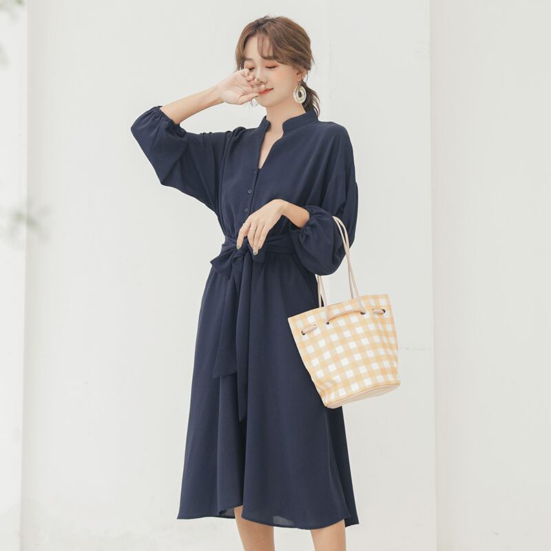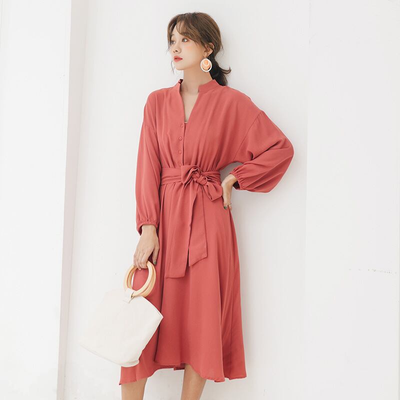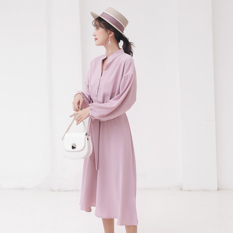 ワンピース ドレス レディースファション シャツワンピース チュニック シンプル 綺麗め 通勤 OL オフィス 折り襟 ロング丈 長袖 ブルー ピンク ネイビー レッド  S M L 着痩せ 肌触りいい シフォン