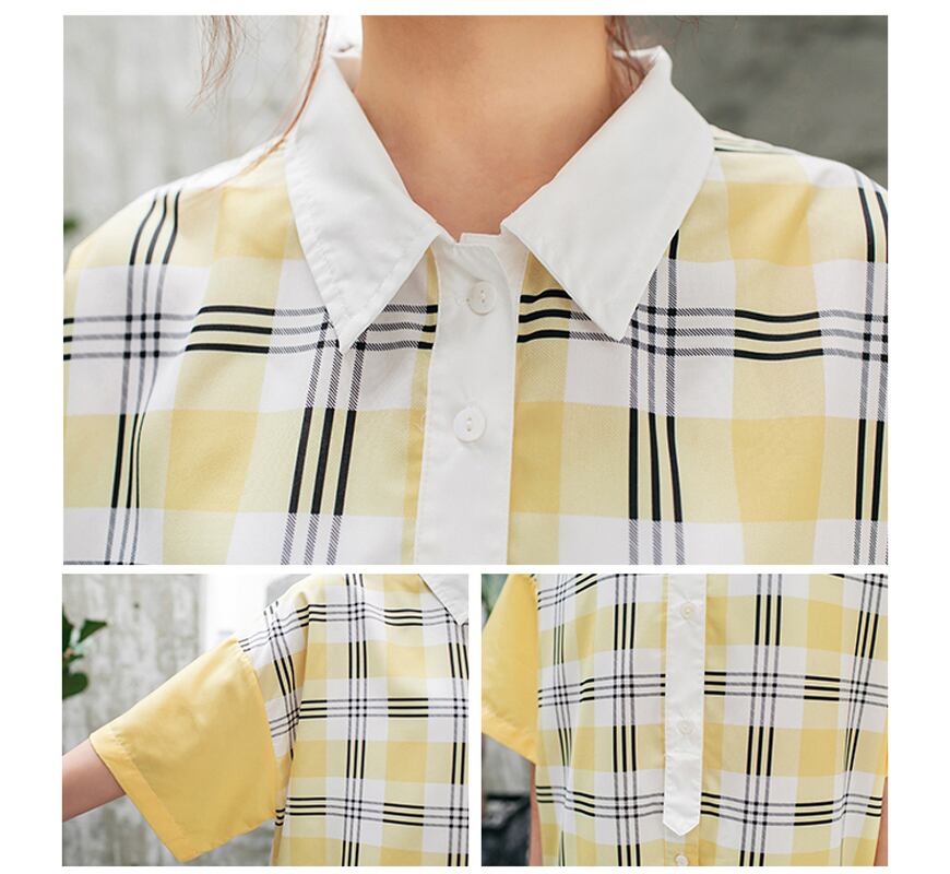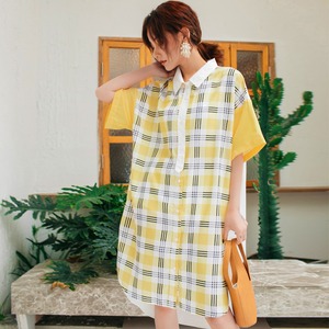 ワンピース ドレス チュニック レディースファション 普段着 着痩せ カジュアル シンプル 折り襟 半袖 ロング丈 S M チェック柄 イエロー 黄色い