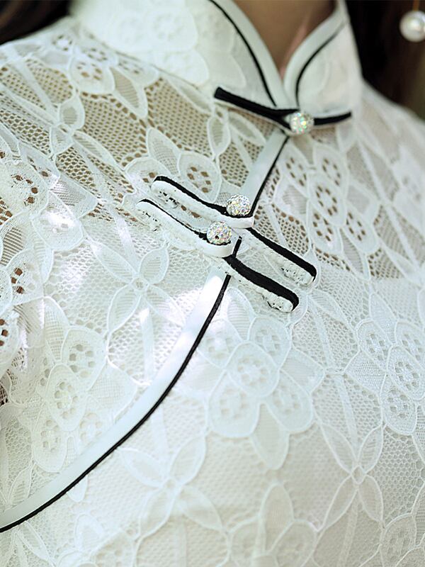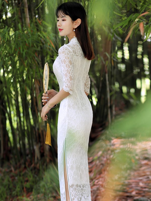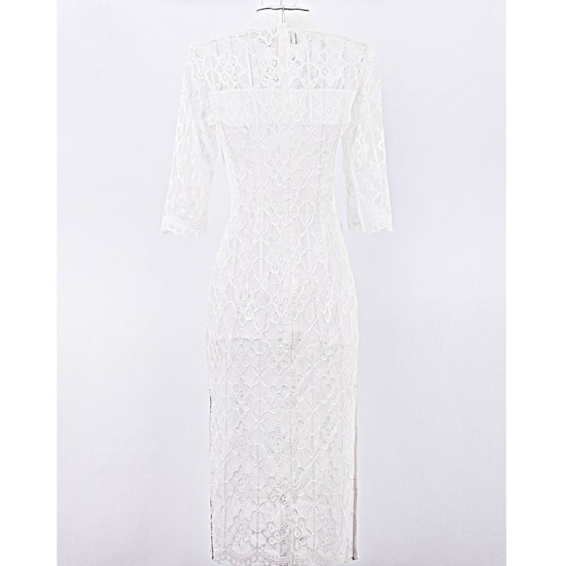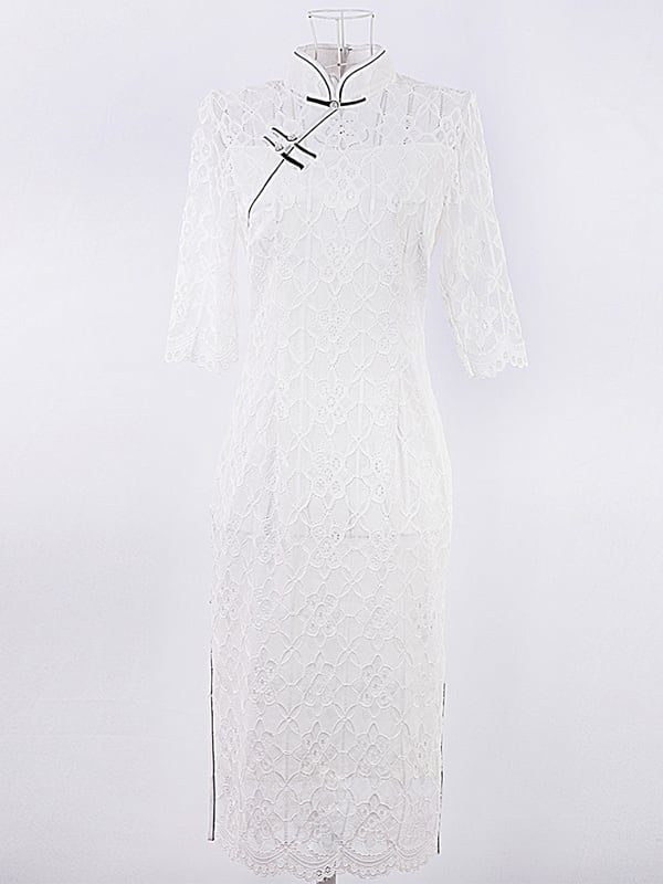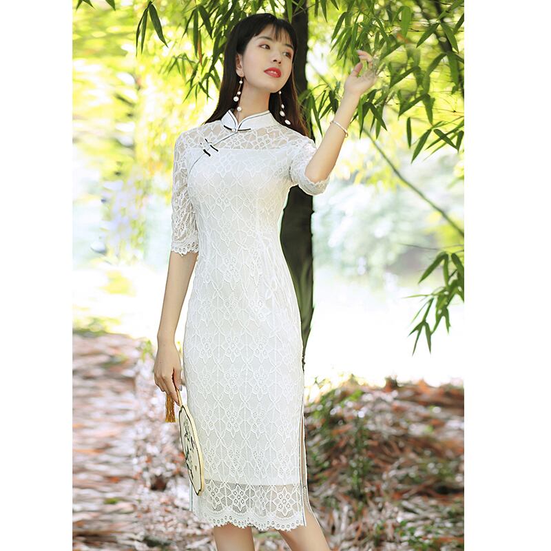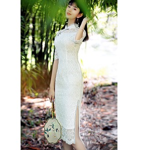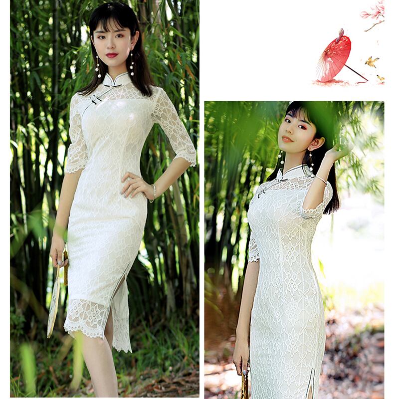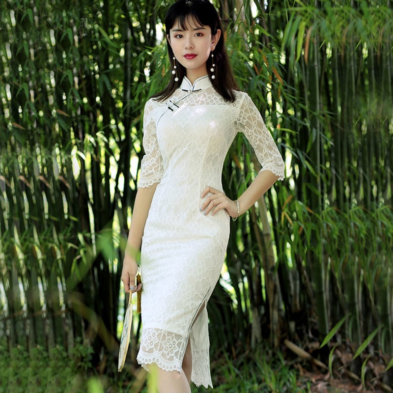 チャイナドレス ワンピース チャイナ風服 中華服 スタンドネック 五分袖 ロング丈 エレガント 着痩せ 上品 大きいサイズ S M L LL 3L 4L 普段着 パーティー 女子会 レース ホワイト 白い